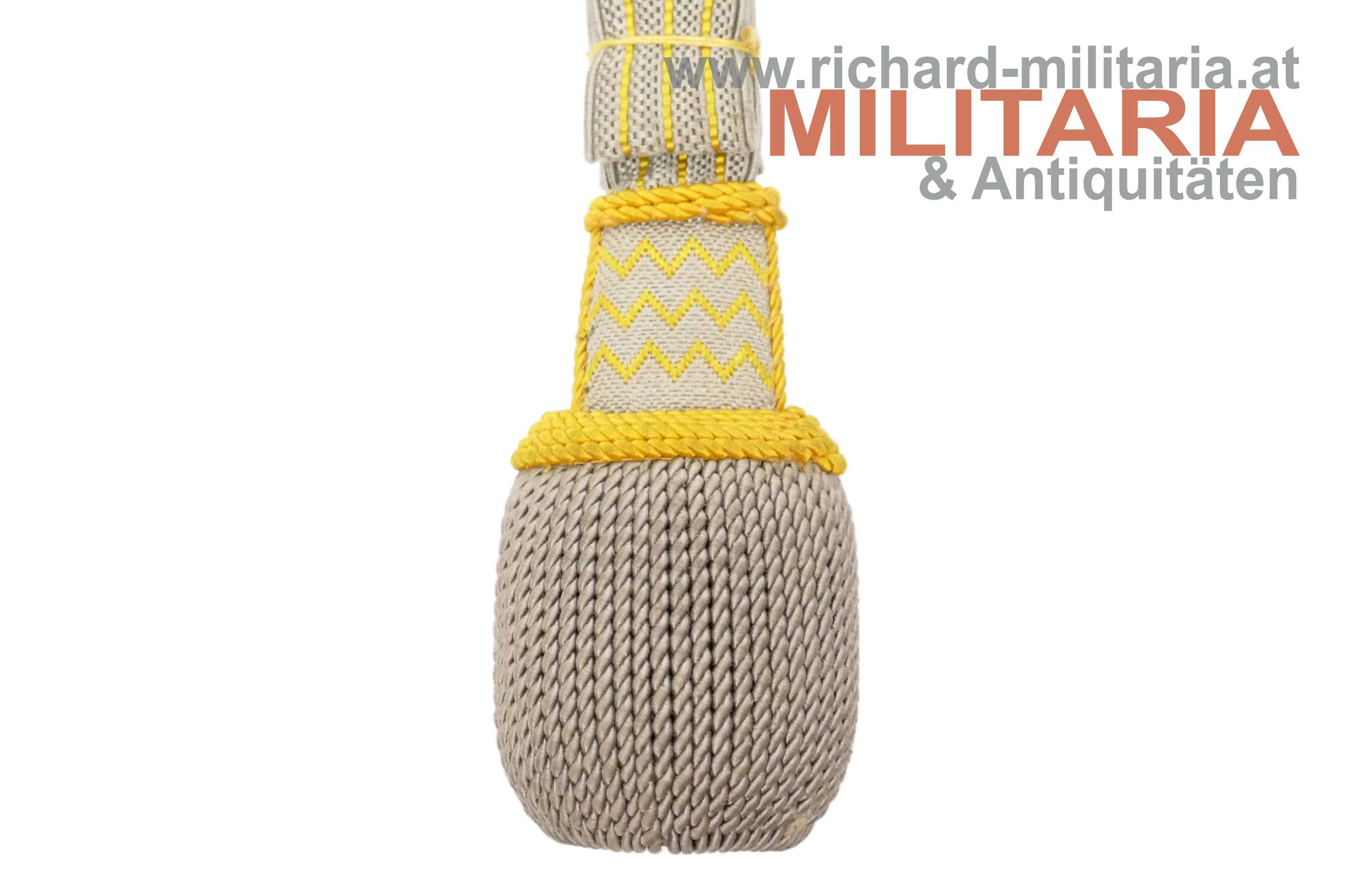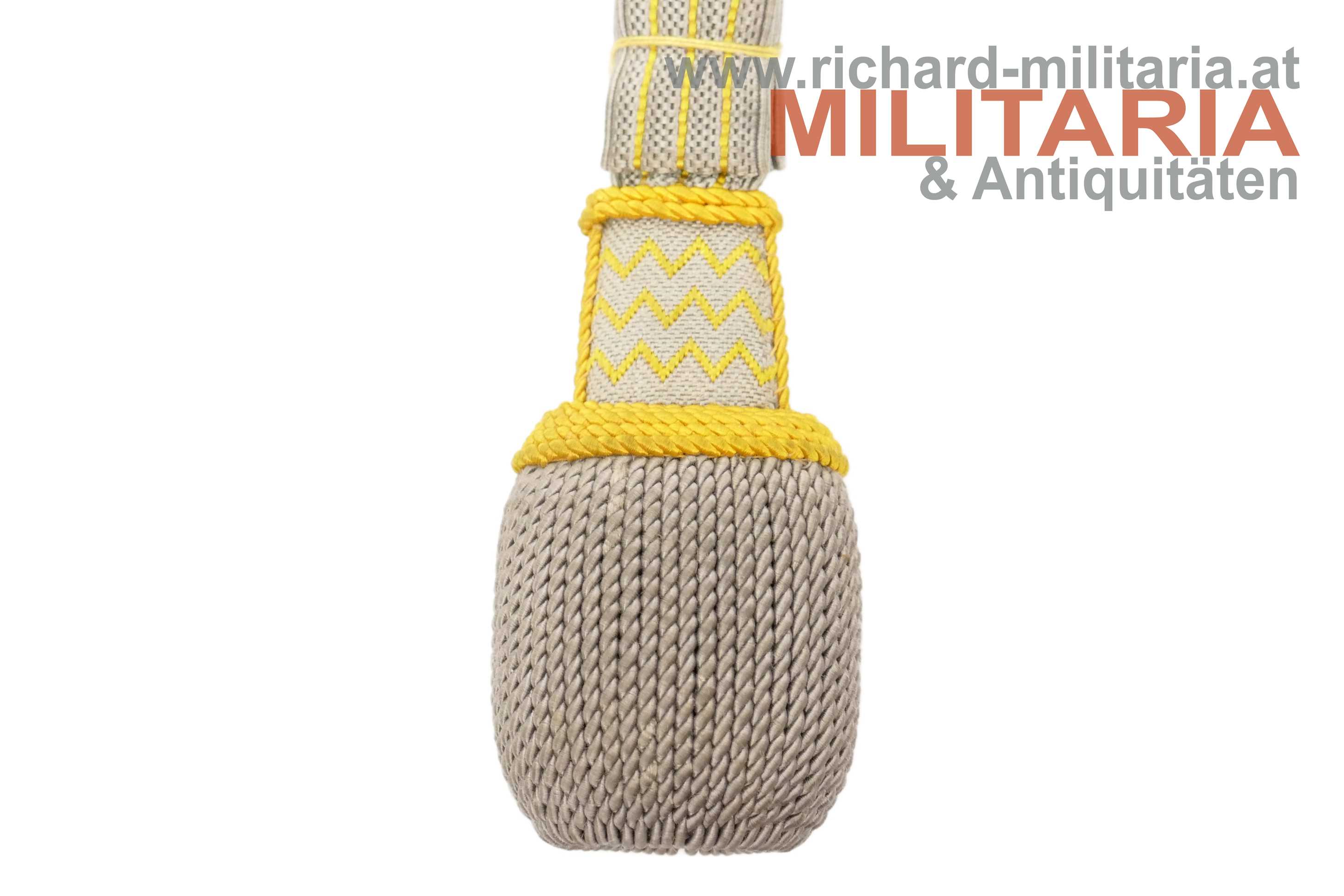 1. Republik - Bajonett-Portepee für Wehrmänner; graugefärbte Ispahanwolle mit drei gelben Längsstreifen; Kopf im dreireihigen Zick-Zack-Muster; geschlossene graue Quasten; original zusammengebunden - Kammerstück (!);
