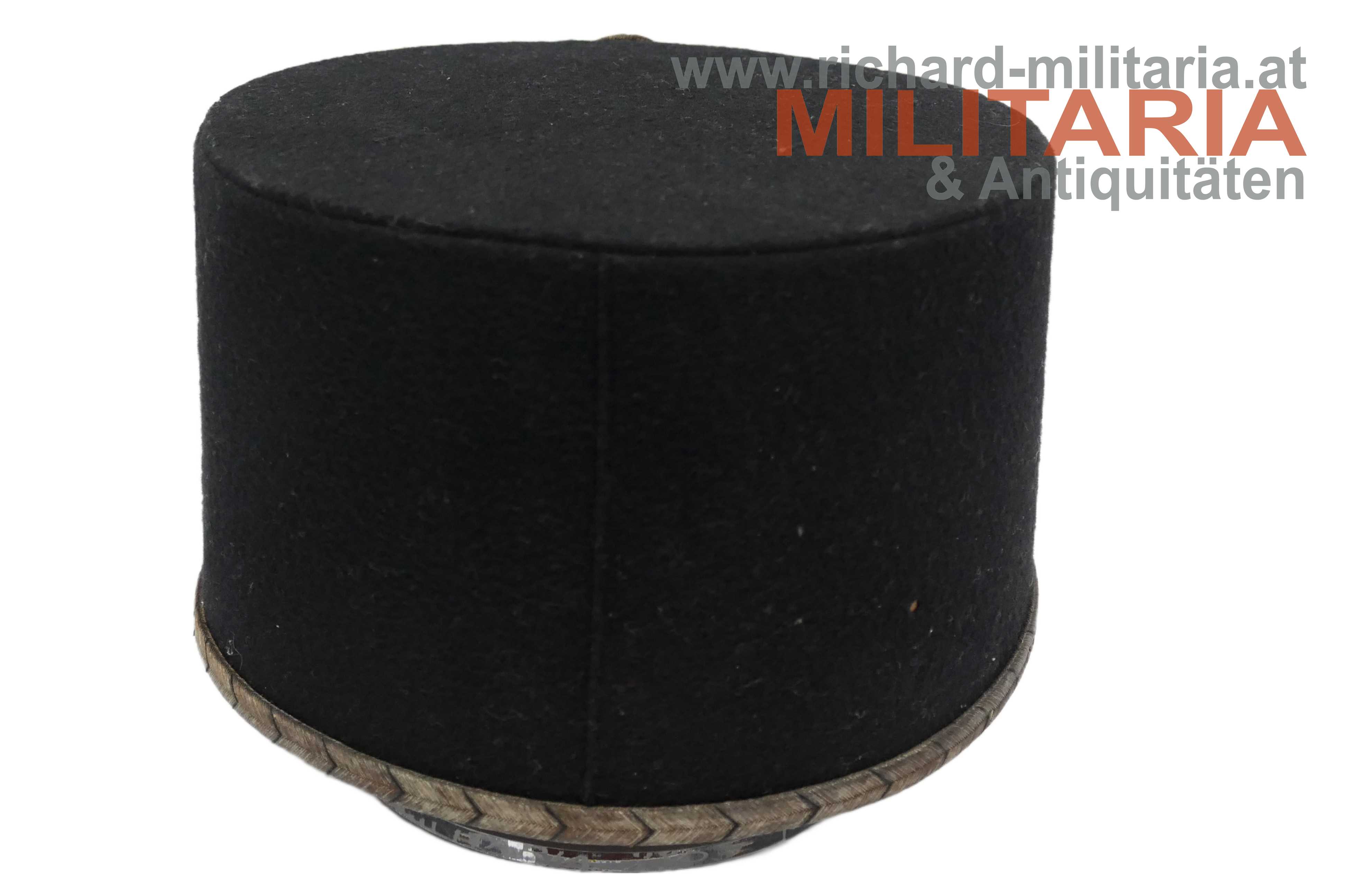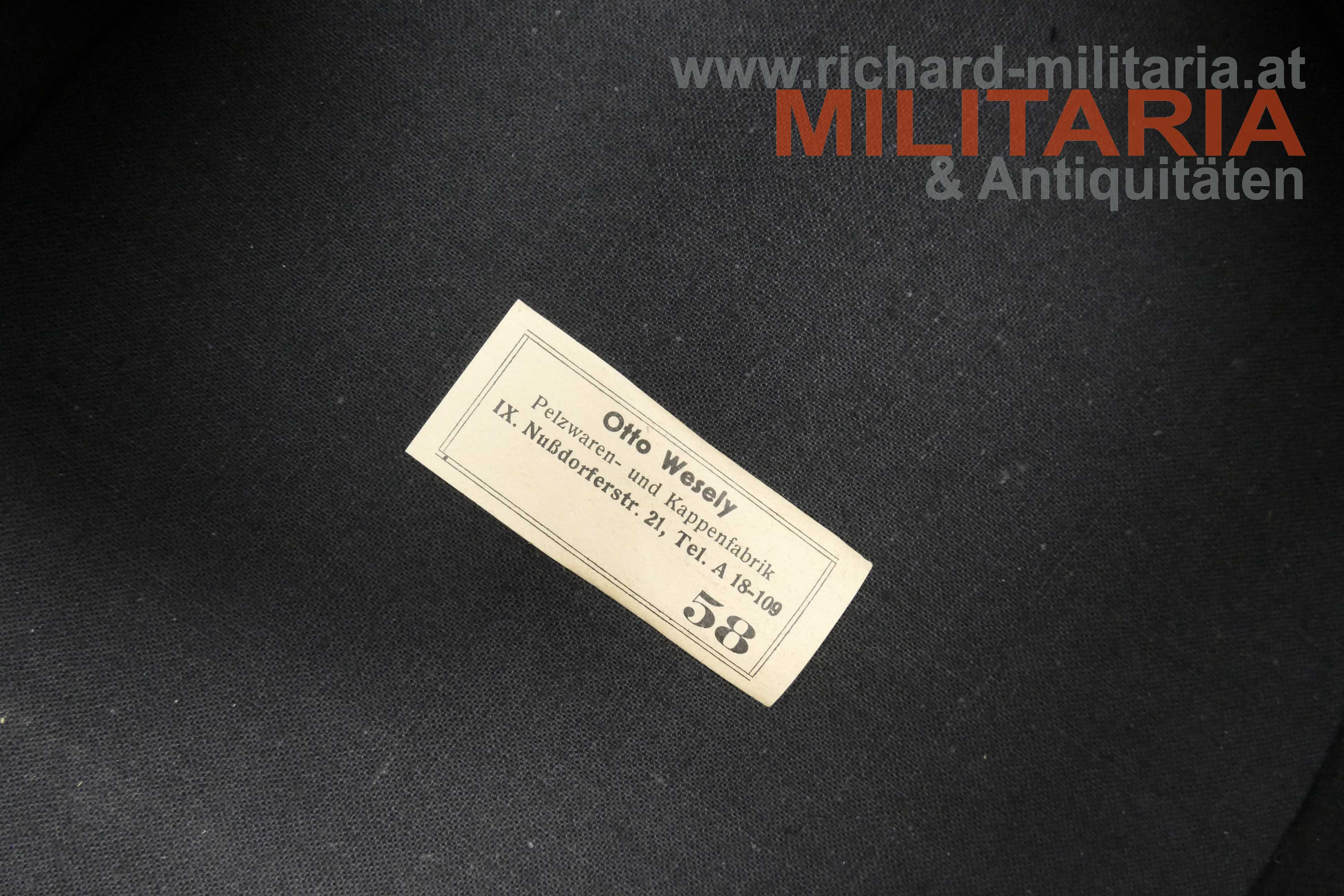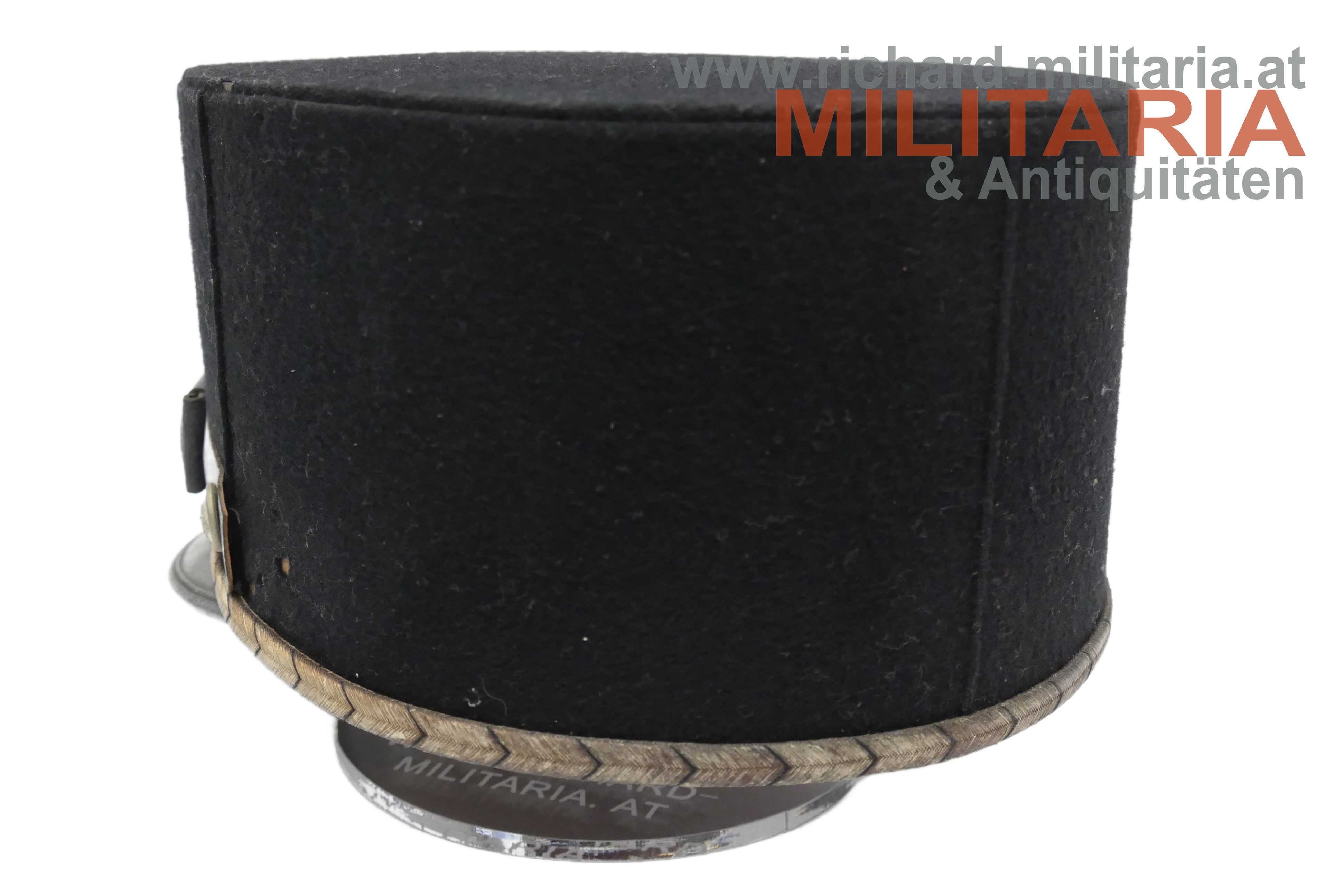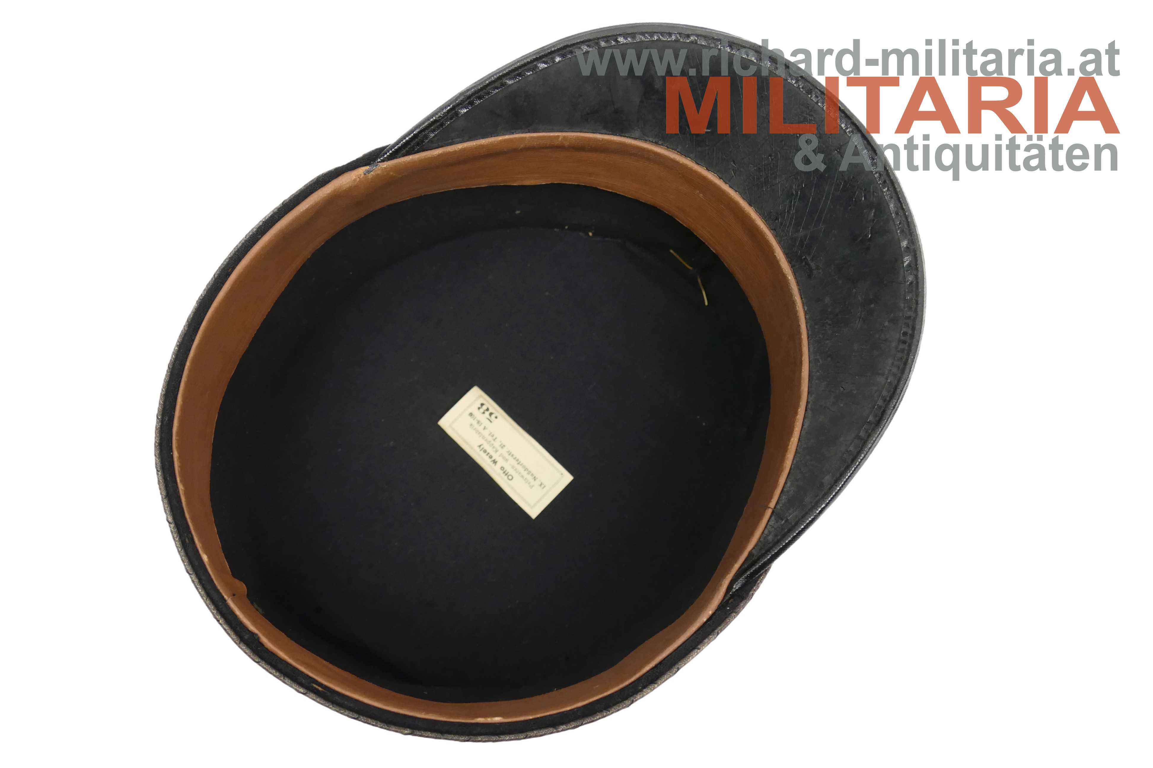 1. Republik - schwarze steife Kappe für Beamte der Post- und Telegraphenverwaltung; steifer formstabiler Korpus mit schwarzem Baumwolltuch überzogen; silberne schwarz geritzte umlaufende Kappenschnur; lederner Sturmriemen gehalten von zwei versilberten Knöpfen mit dem Symbol der Post- und Telegraphenverwaltung; darüber auf der Kappenschlinge das selbe Symbol aus vergoldetem Tombak mit orangem Kunststoff hinterlegt; Kappenrose mit emaillierten Bindenschild mittig; Kappenschirm aus leicht krakeliertem schwarzen Leder; braunes Stirnleder; innen ein Herstelleretikett "Otto Wesely" mit der Größe "58"; minimaler Mottenfrass auf der Außenseite;