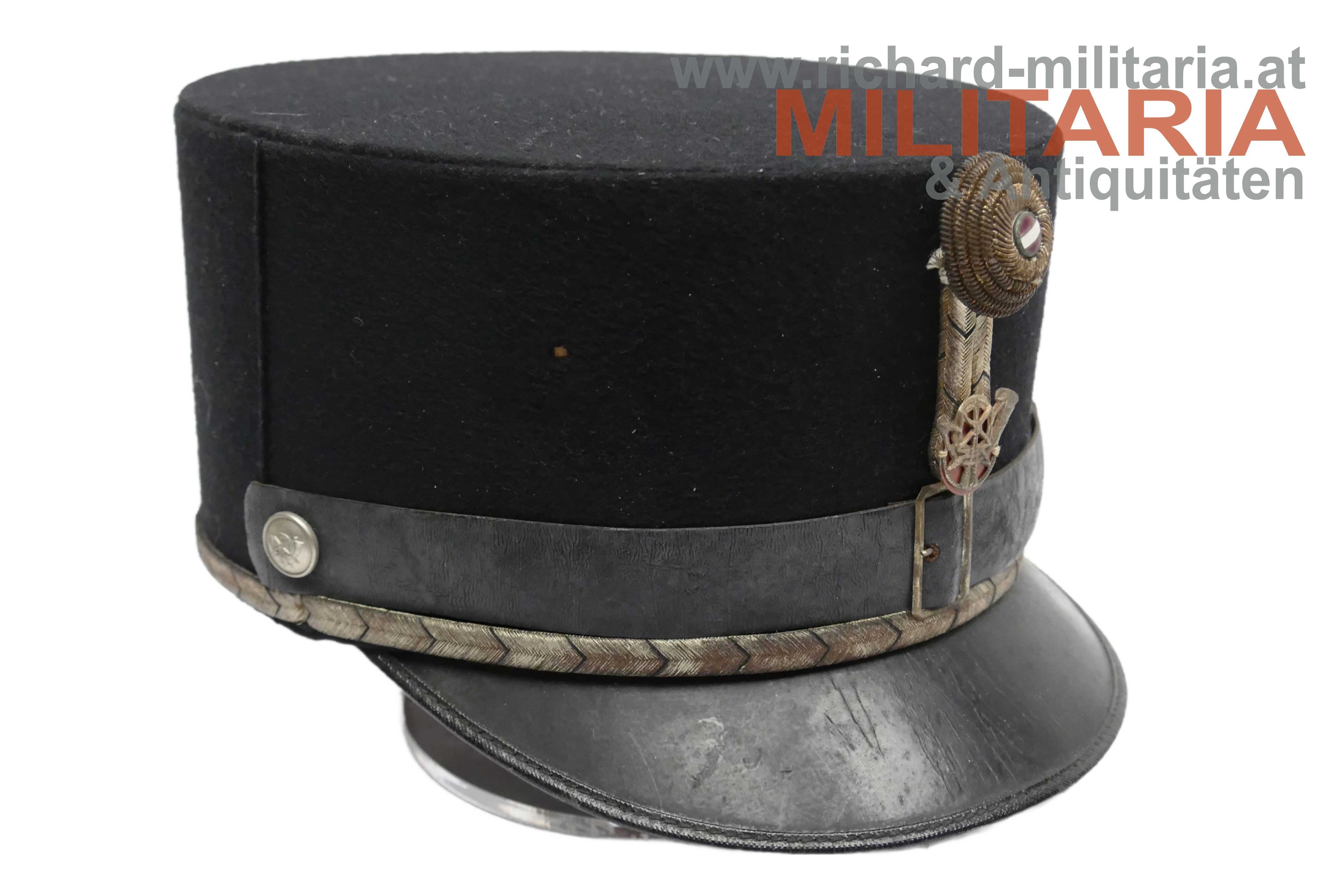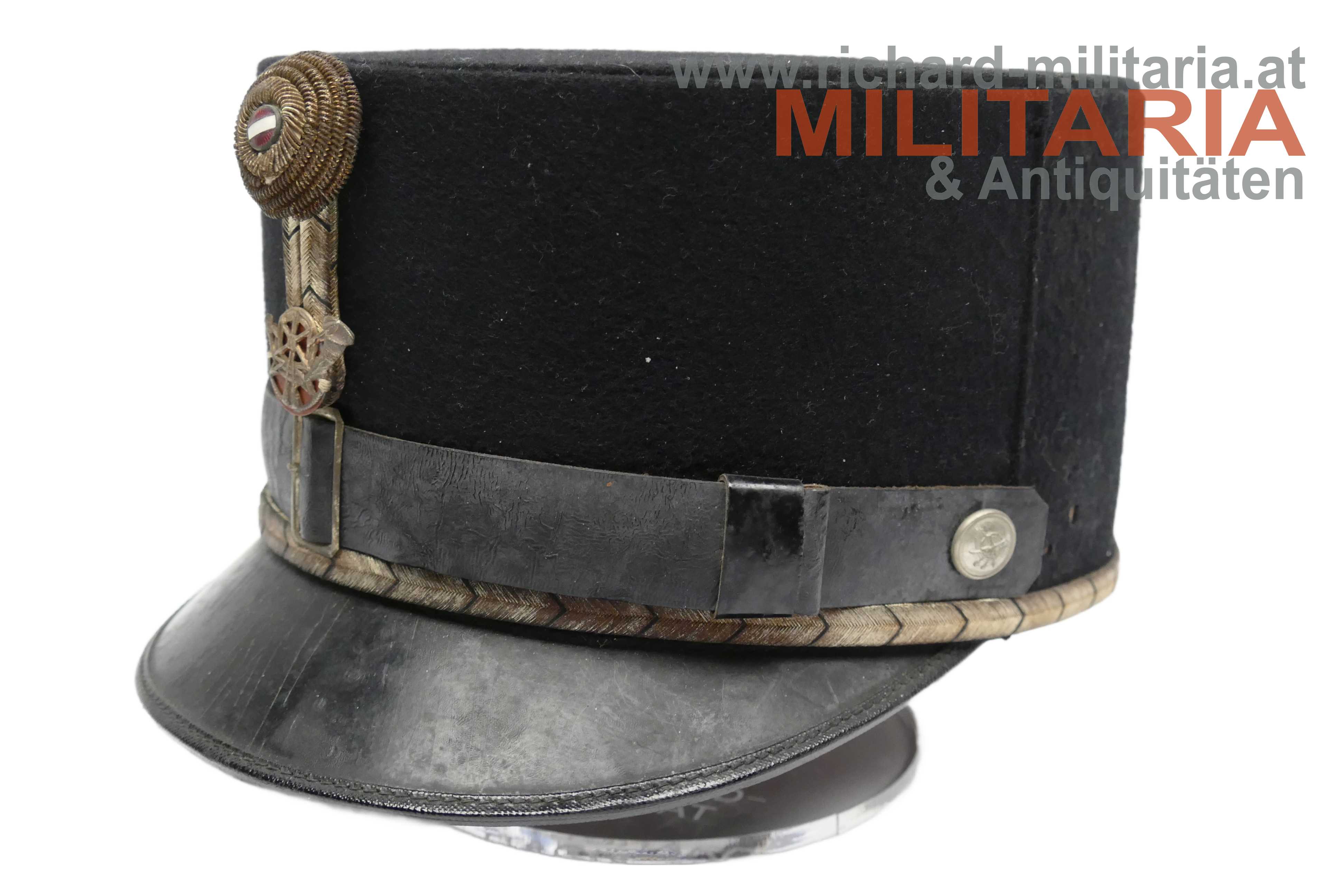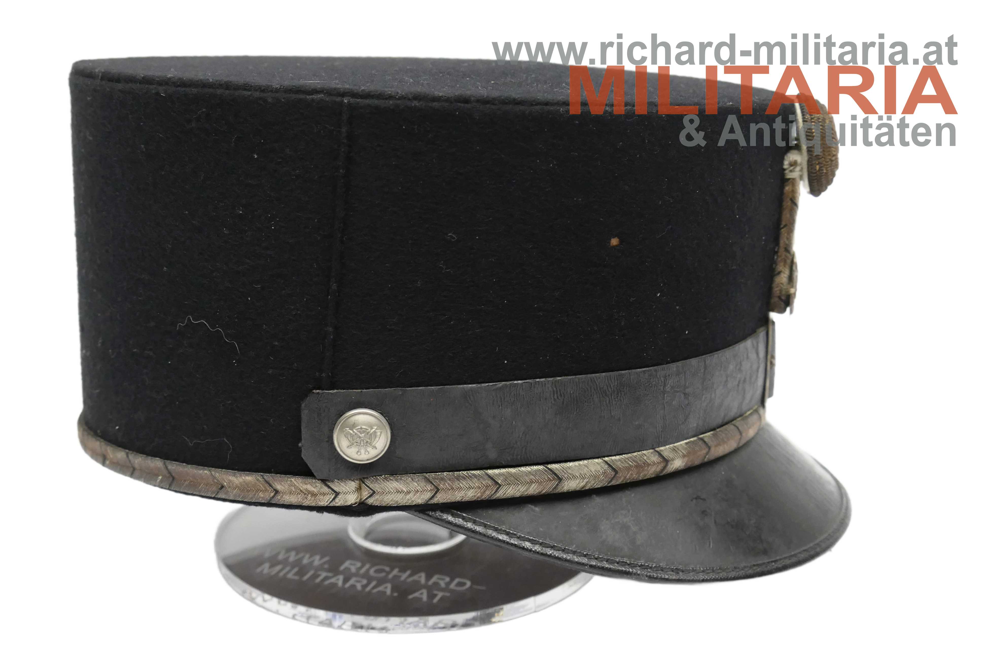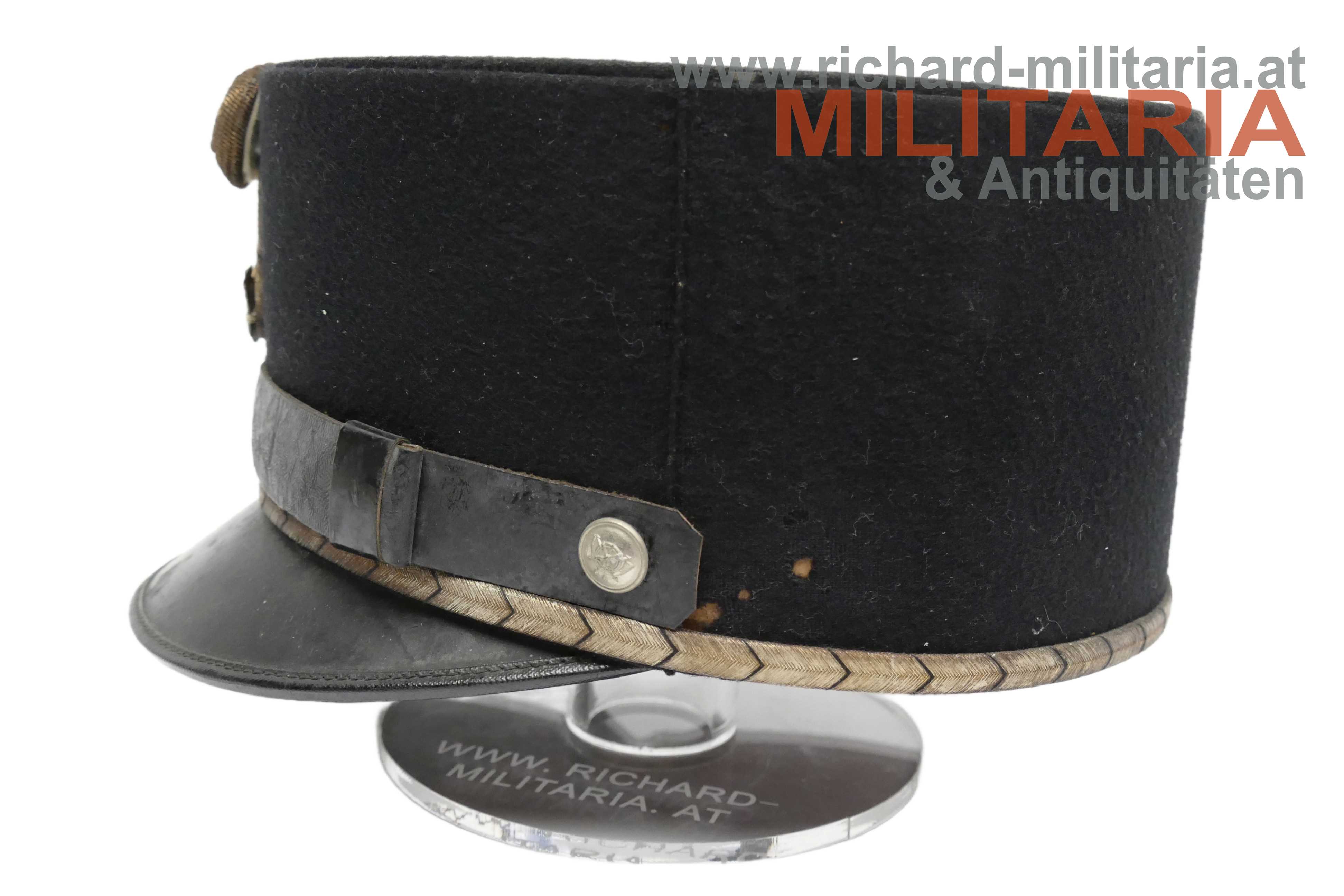 1. Republik - schwarze steife Kappe für Beamte der Post- und Telegraphenverwaltung; steifer formstabiler Korpus mit schwarzem Baumwolltuch überzogen; silberne schwarz geritzte umlaufende Kappenschnur; lederner Sturmriemen gehalten von zwei versilberten Knöpfen mit dem Symbol der Post- und Telegraphenverwaltung; darüber auf der Kappenschlinge das selbe Symbol aus vergoldetem Tombak mit orangem Kunststoff hinterlegt; Kappenrose mit emaillierten Bindenschild mittig; Kappenschirm aus leicht krakeliertem schwarzen Leder; braunes Stirnleder; innen ein Herstelleretikett "Otto Wesely" mit der Größe "58"; minimaler Mottenfrass auf der Außenseite;