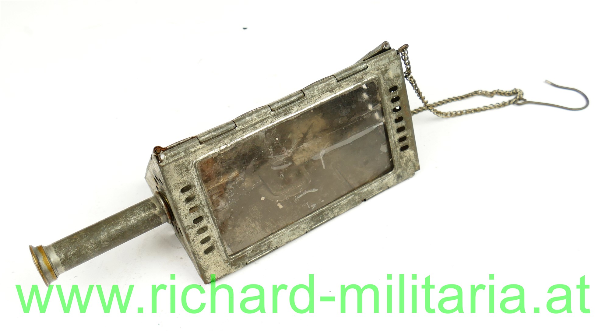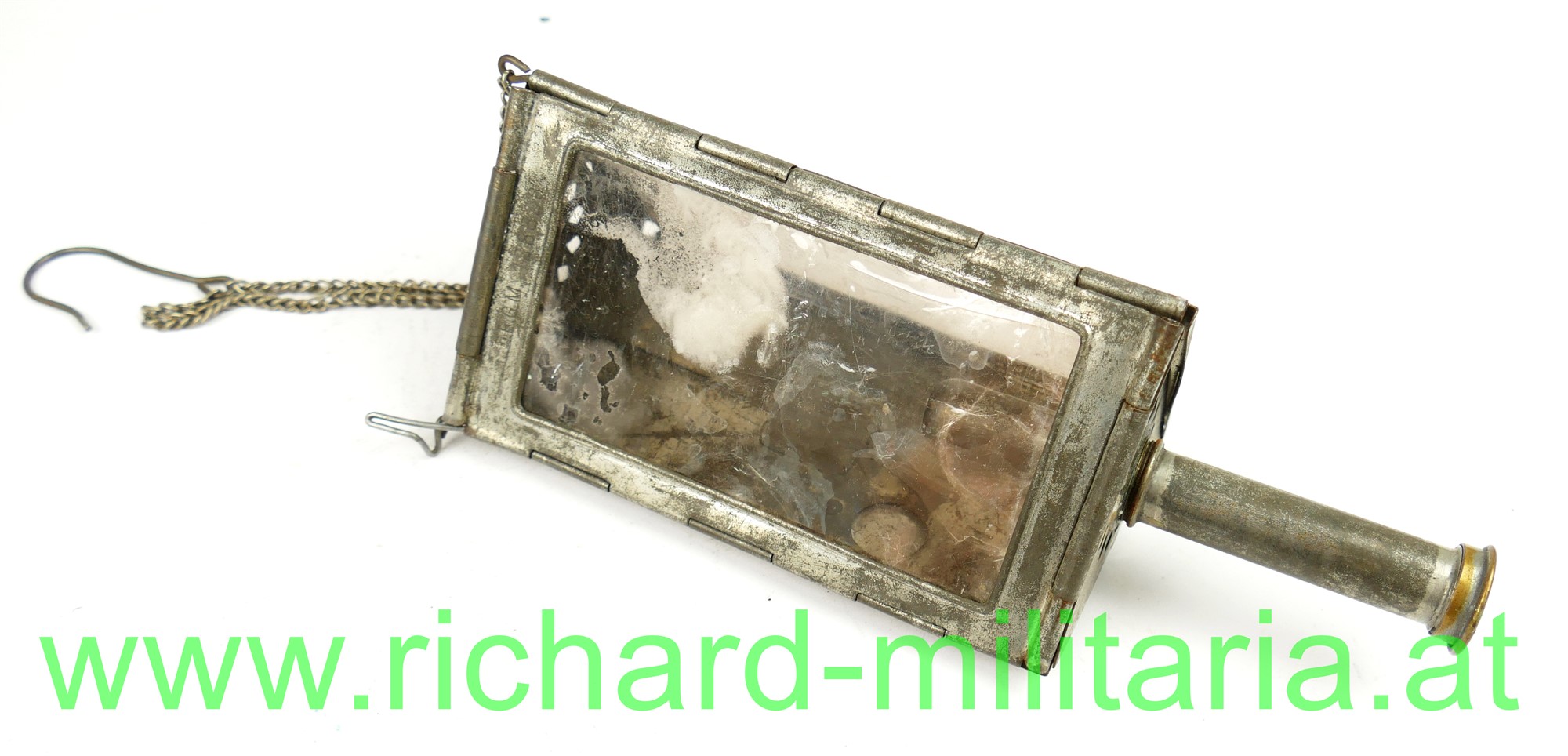 1. Weltkrieg - faltbare Bunkerlaterne mit einschraubbarer Petroleum-Patrone; dreieckige Form mit 2 Sichtfenstern aus aus dünnem Kunstglas; Hängekette mit Haken; von unten einschraubbare Petroleum-Patrone; auf der Rückwand verschließbare Öffnung zum Entzünden; Höhe ohne Patrone 13,5 cm.