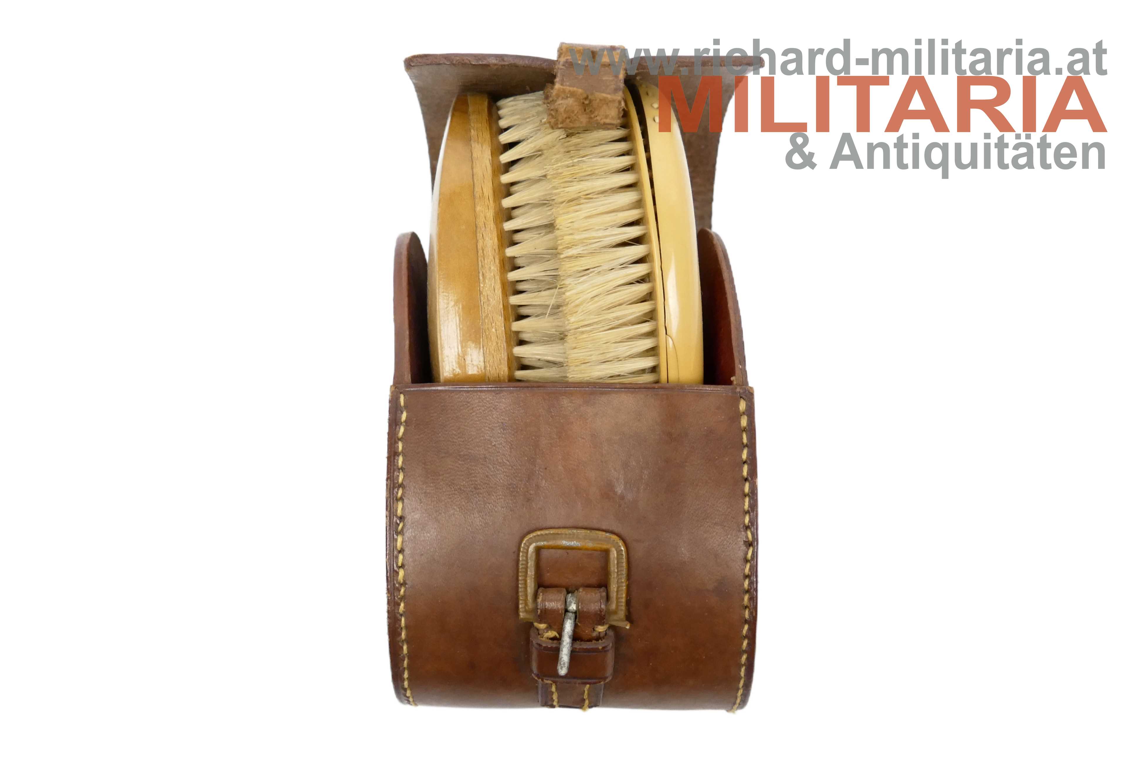 1. Weltkrieg - typisches Offiziers-Pflege/Rasier-Reiseset; vollständig (ohne Rasiermesser) mit Spiegel in geschmeidiger brauner Leder-Reisetasche und dazu ein Bürstenset ebenfalls in brauner Leder-Reisetasche.