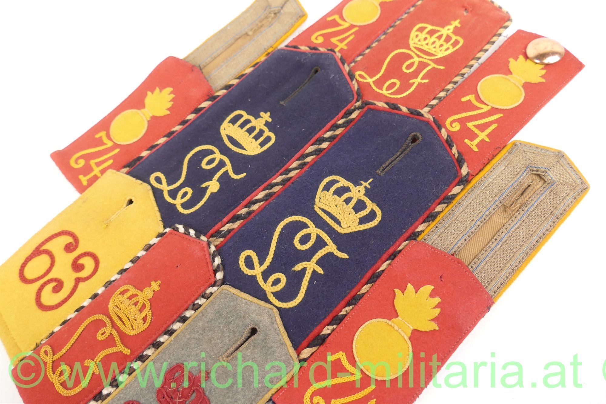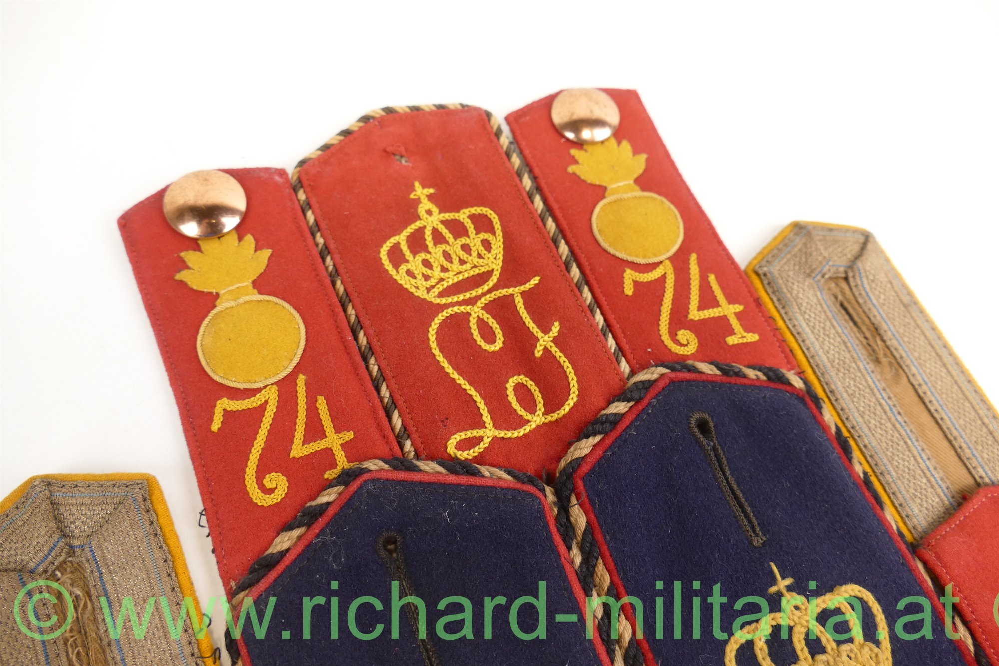 - 2 Paar Feld-Artillerie-Schulterklappen Nr. 74 - rotes Grundtuch mit gelber Kurbelstickerei