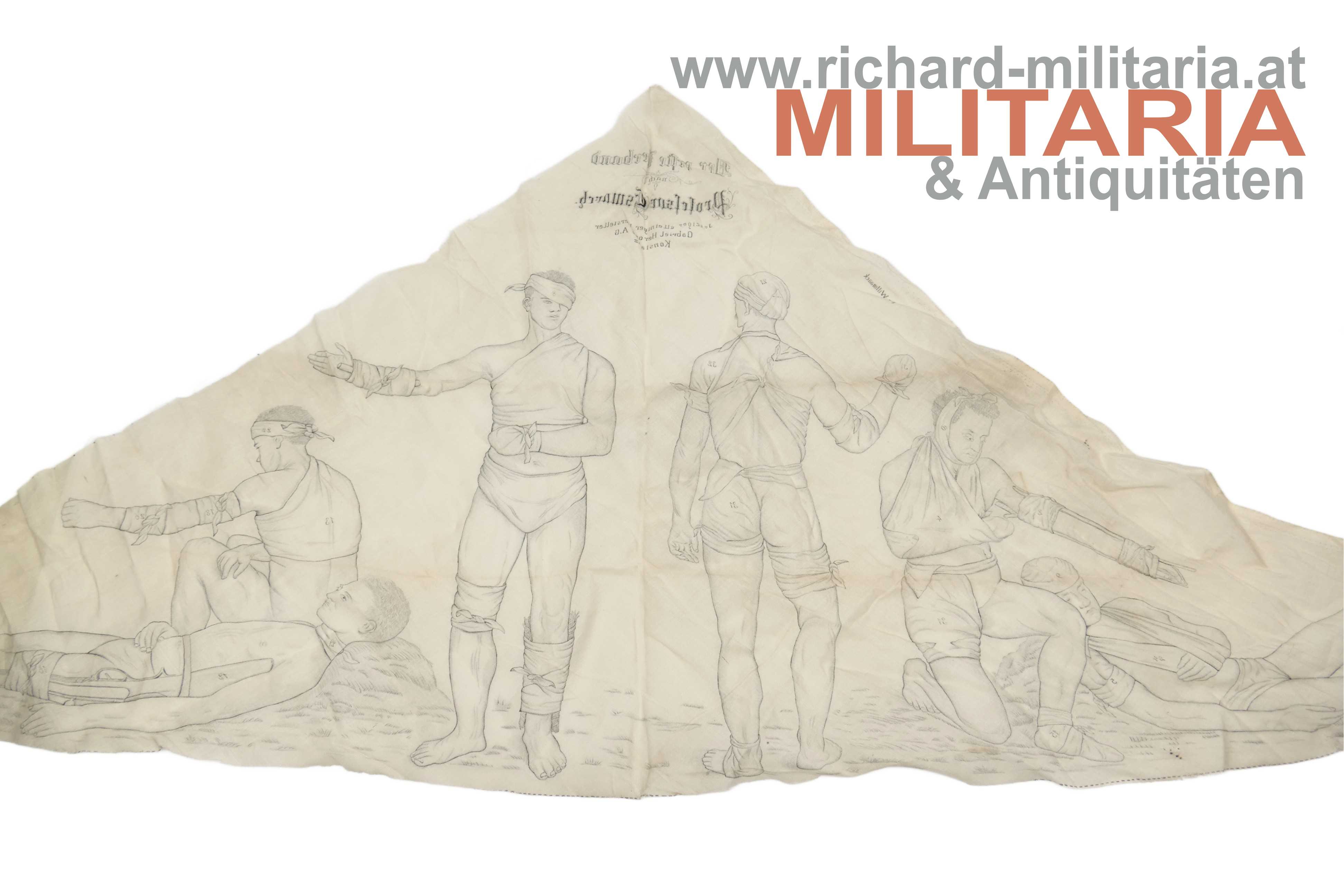 Diese Dreieck-Tücher wurden von den Soldaten bzw. Offizieren verwendet, um im Feld rasche Erstversorgungen durchzuführen. Interessant die Anwendungsdarstellungen mit Gewehr als Beinschiene.