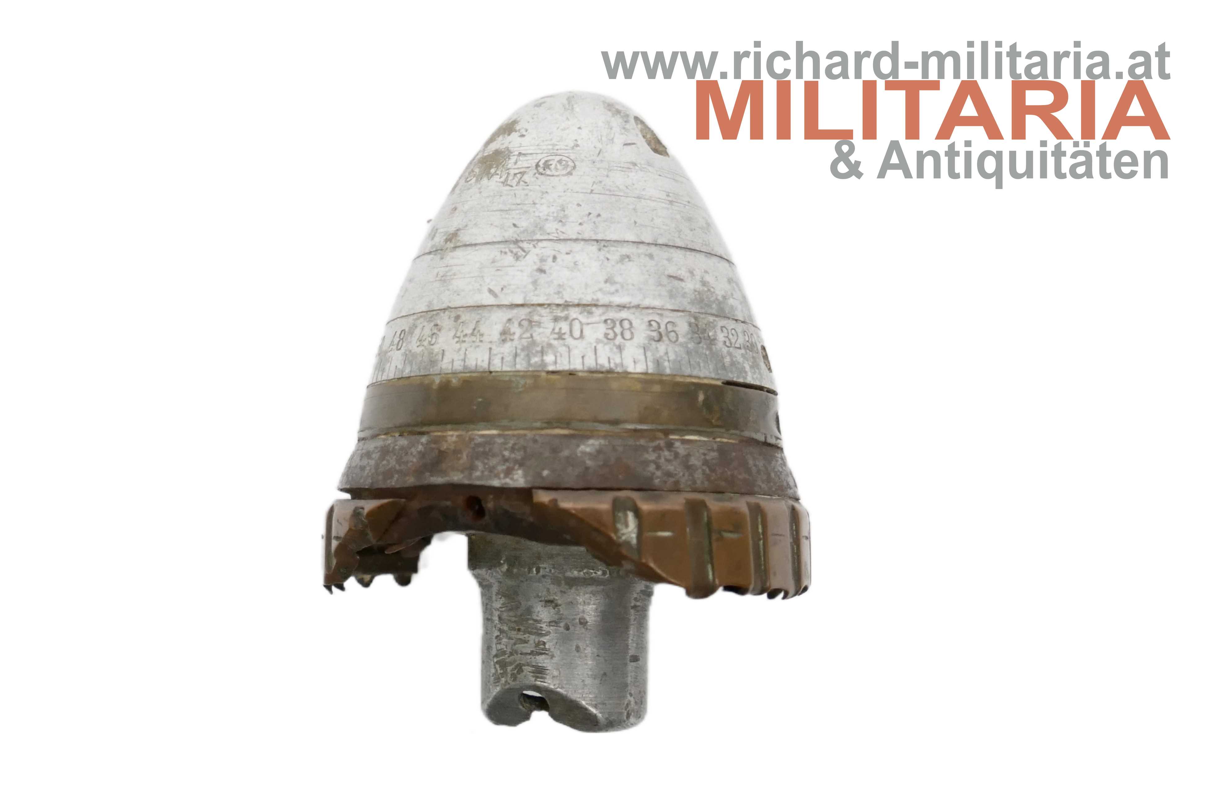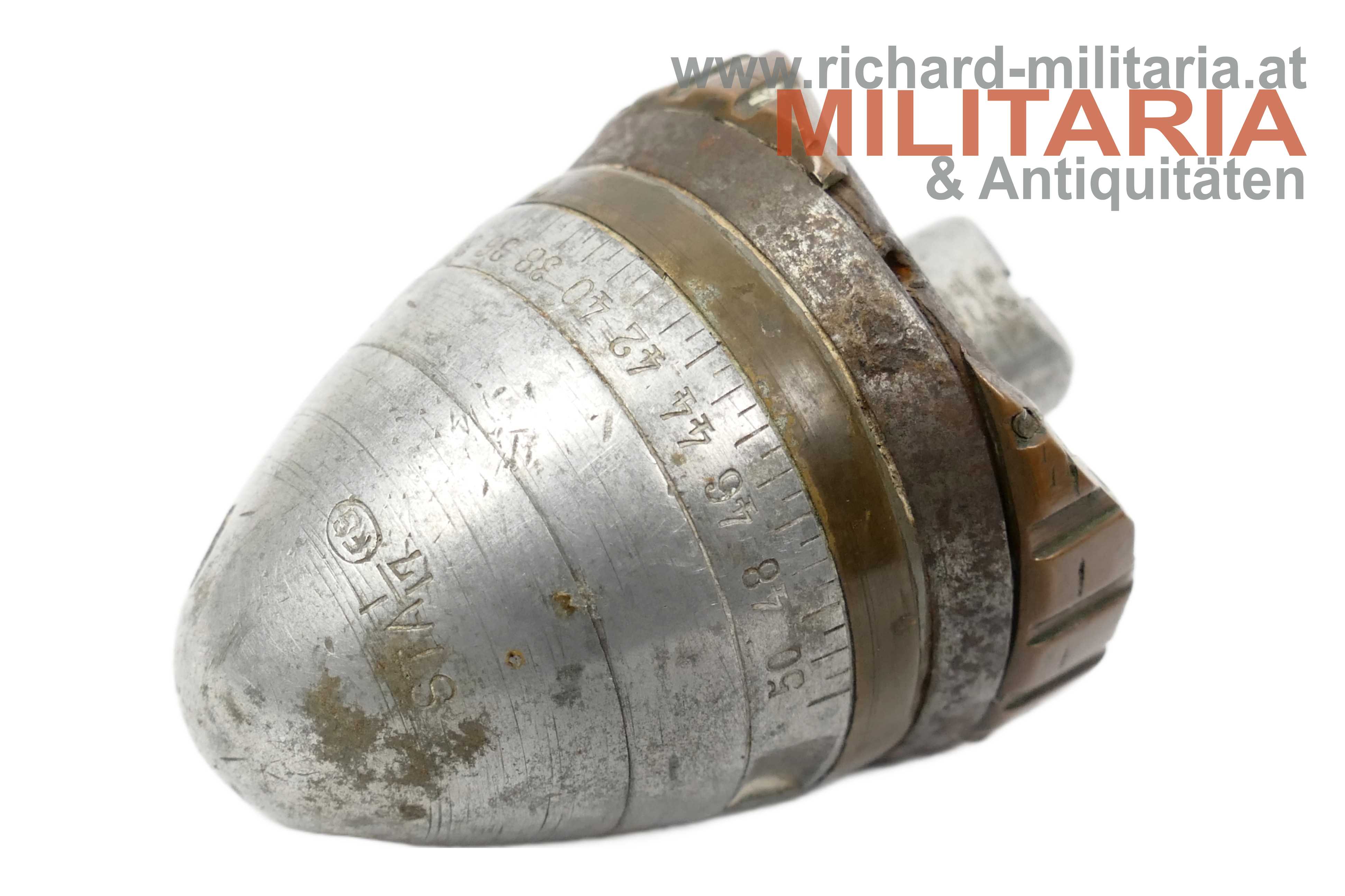 Schnittmodell eines Granaten-Sprengkopfes aus dem 1. Weltkrieg; Durchmesser des Laufringes 60,3 mm; Markierung am Sprengkopf: STA I/17