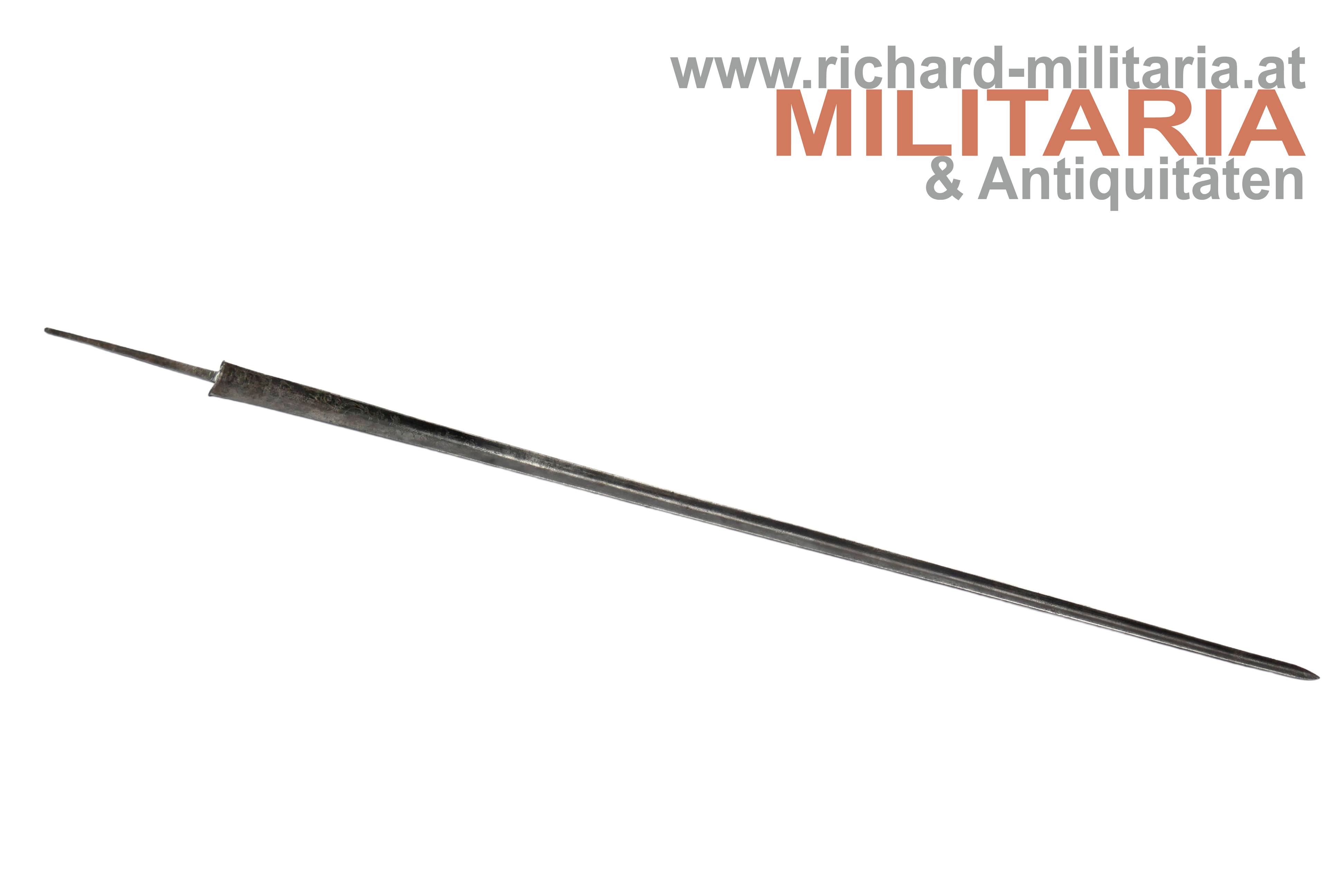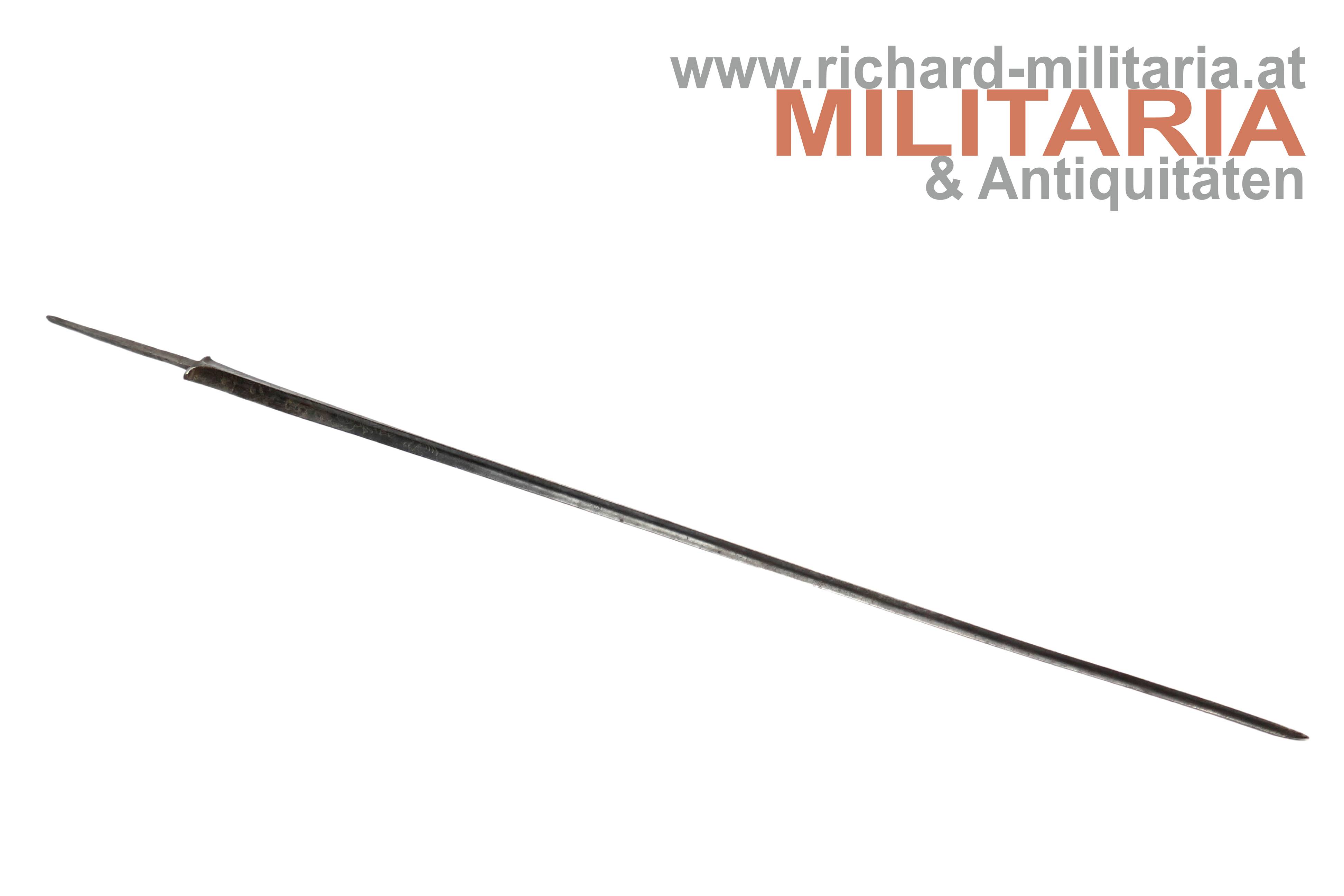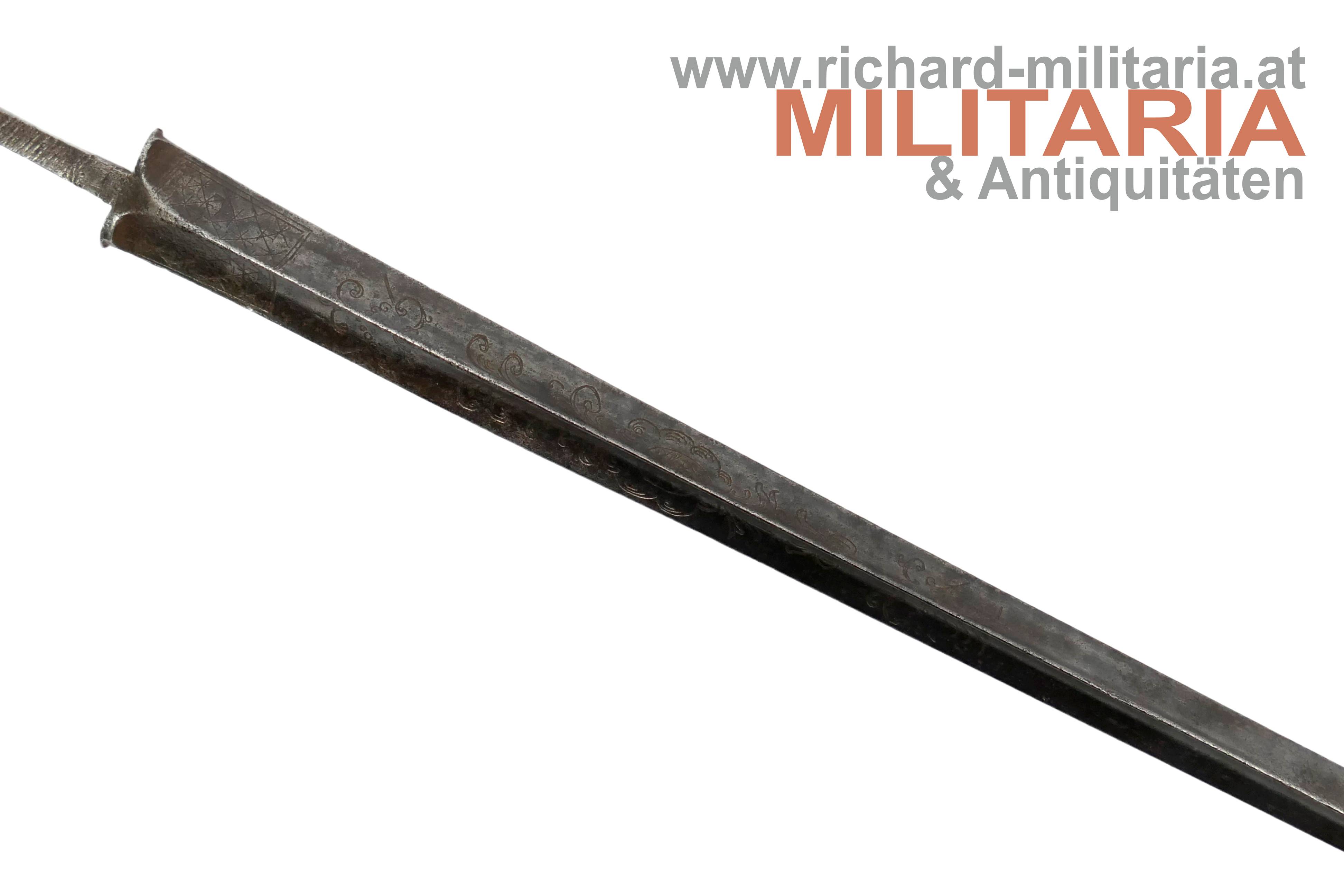 17./18. Jahrhundert - Dreikantklinge für einen Degen; im oberen Teil reich graviert mit Rankenmustern; Schaft 12,4 cm lang; gesamte Länge 79,9 cm