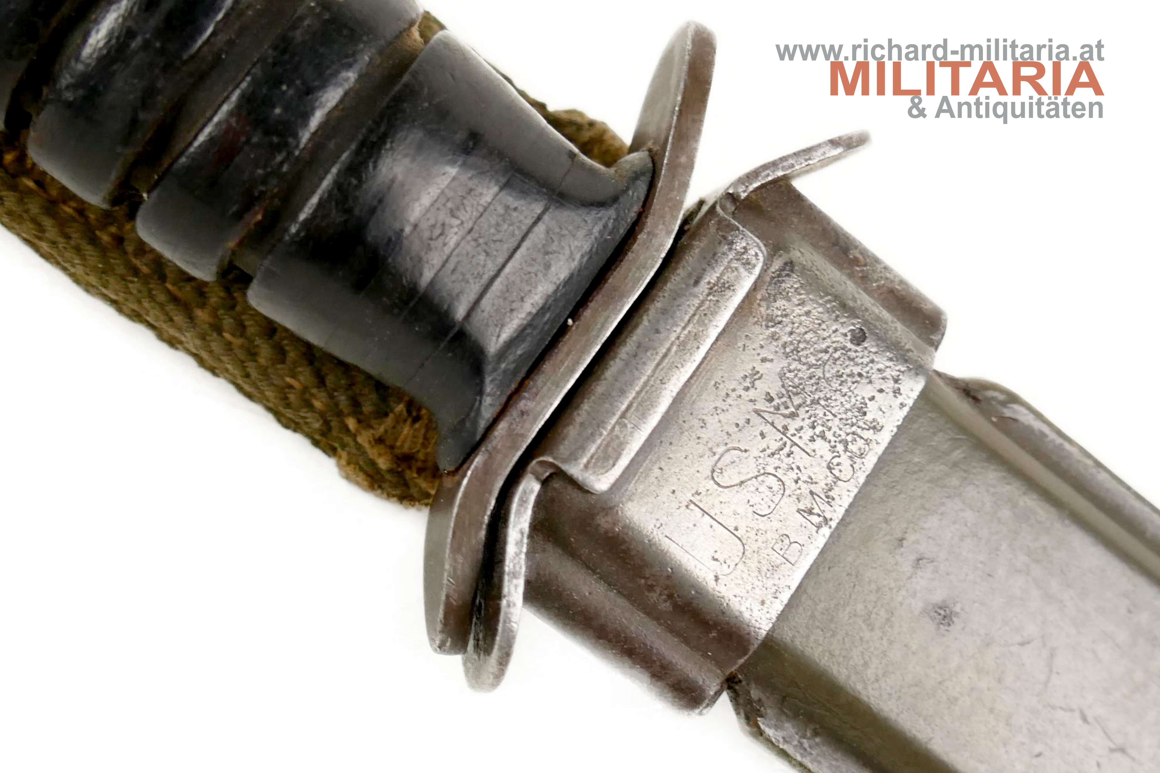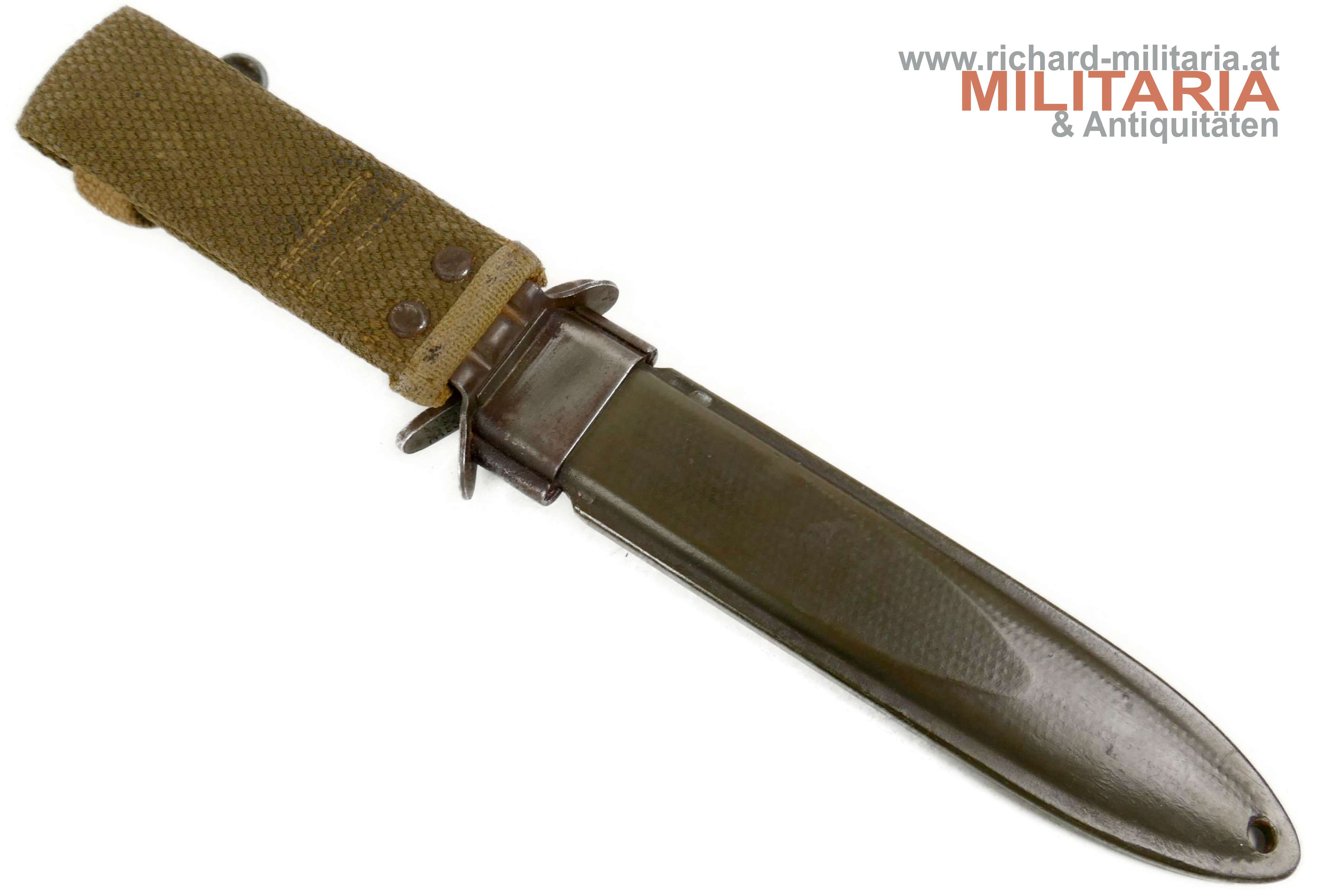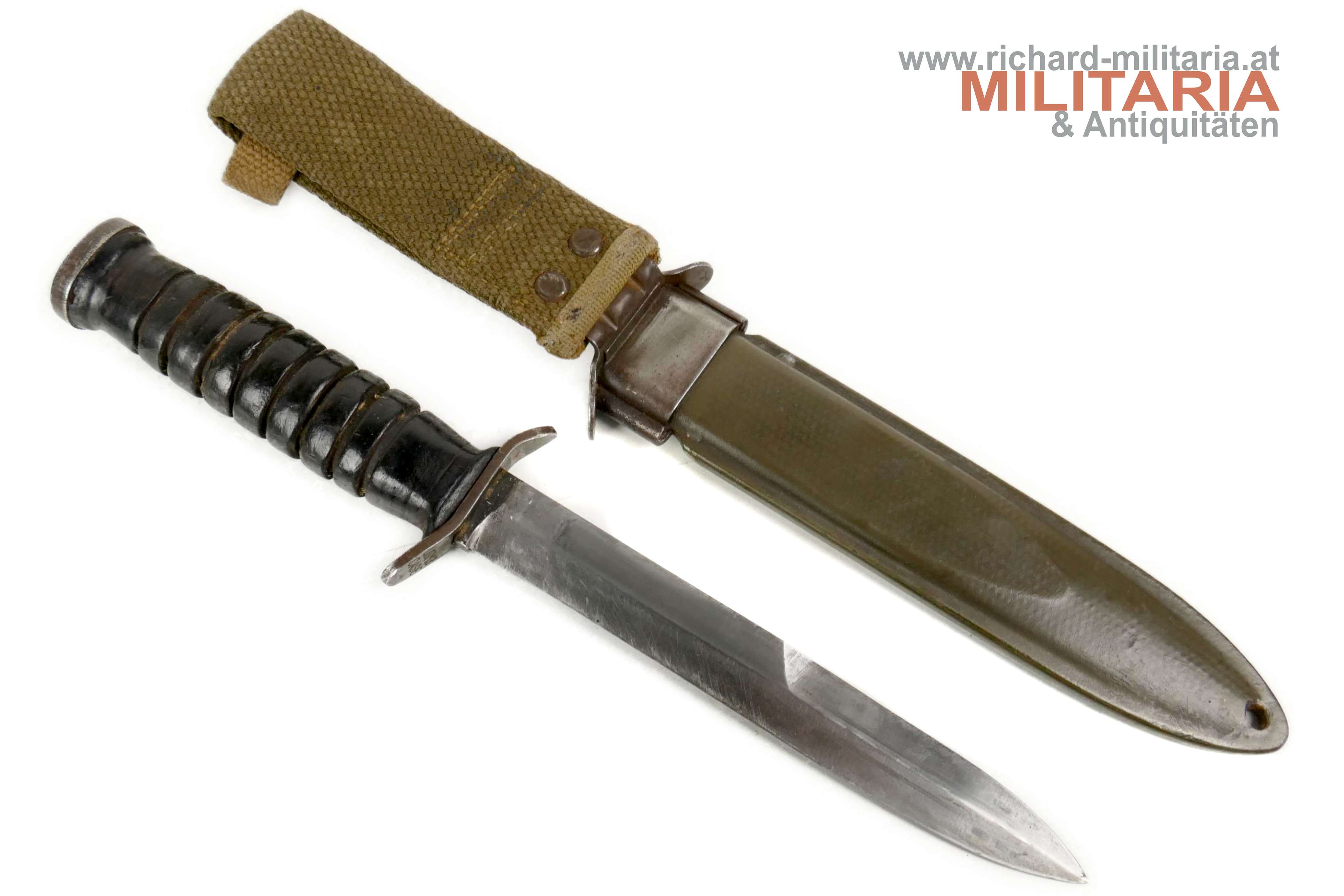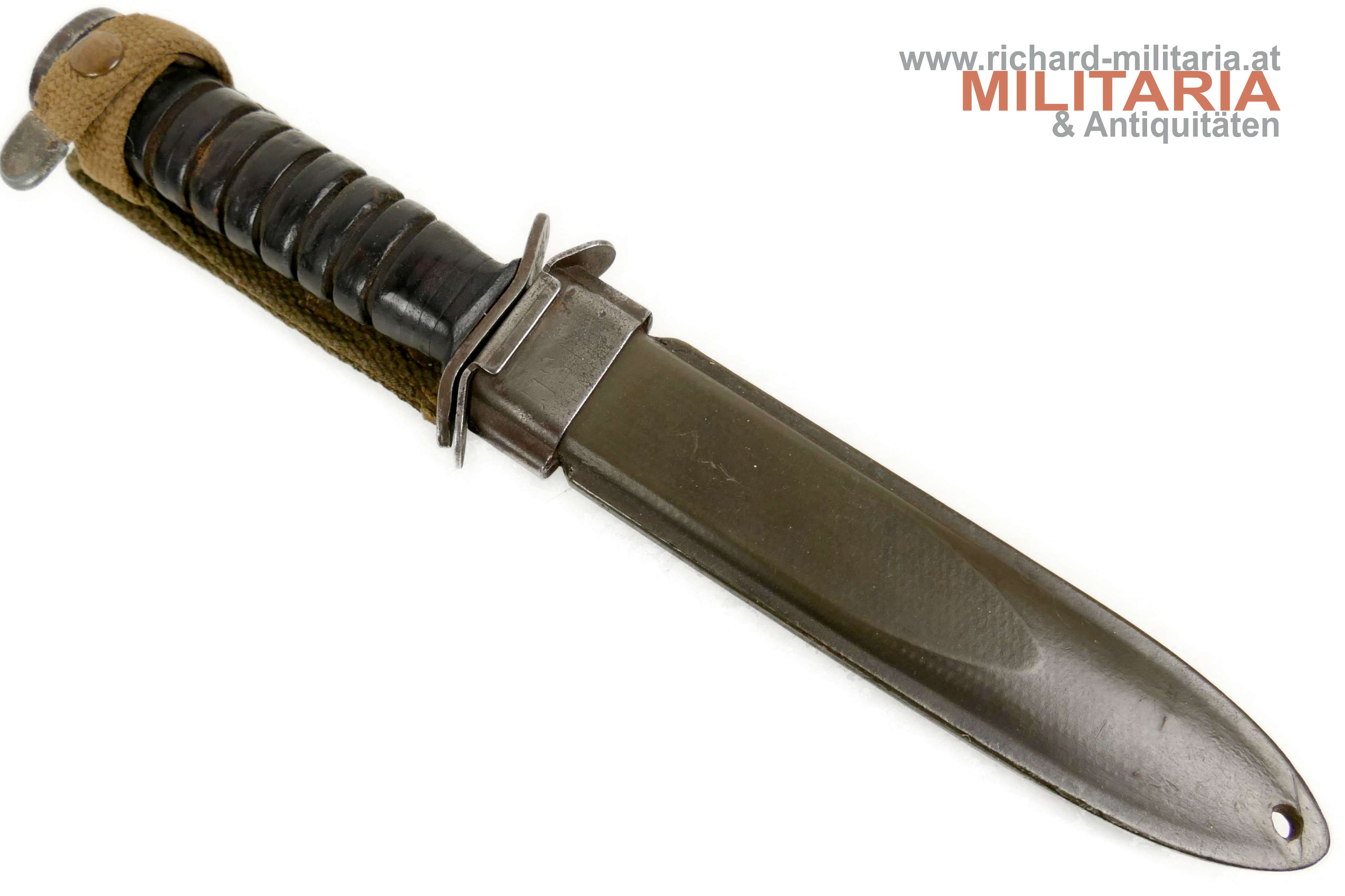 2. Weltkrieg - USA - Kampfmesser M3; gut erhaltene Klinge ohne Stempel; am Stichblatt mit "U.S.M.3 Case" gestempelt; geriffelter schwarzer Griff; mit der M8 Scheide mit aufgenieteter grünen Leinentragelasche mit Druckknopfverschluss; Eisenbeschlag der Scheide leicht narbig;