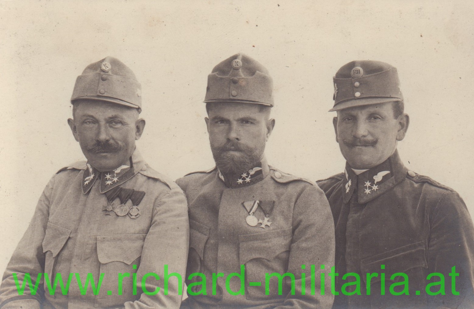 Foto von 3 Feldwebel der k.u.k. Kraftfahrtruppe - aufgenommen 1917/18 (Kappenrose Kaiser Karl) - rechter trägt eine Feldbluse aus CORD-Stoff (!!);