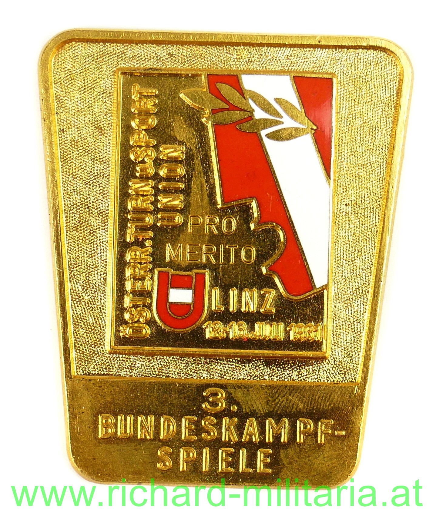 3. Bundeskampfspiele 1961 - Linz - Plakette, Österr. Turn u. Sport Union, Linz, 12.-16. Juli 1961, Tombak vergoldet teilweise emailliert;