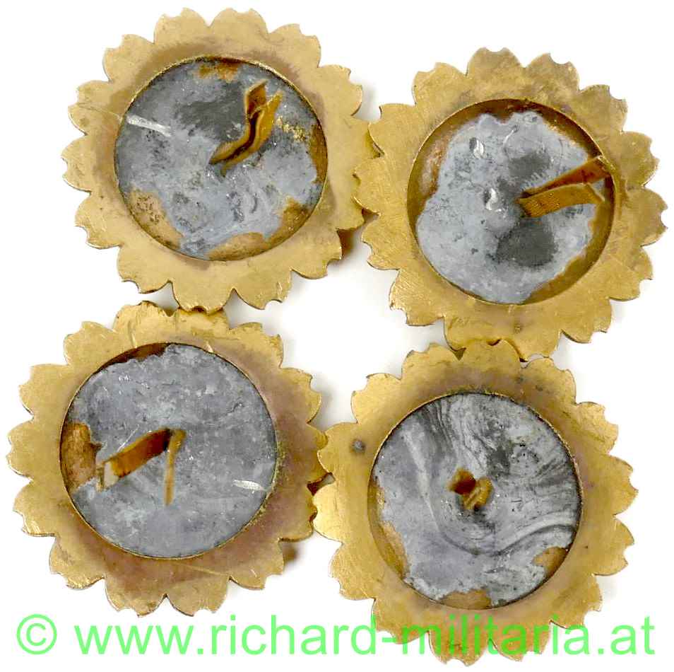 4 Auflagen aus Messing in Blütenform - mittige der kaiserliche Doppeladler ohne Brustschild; auf der Rückseite aufgelöteter massiver Doppelsplint