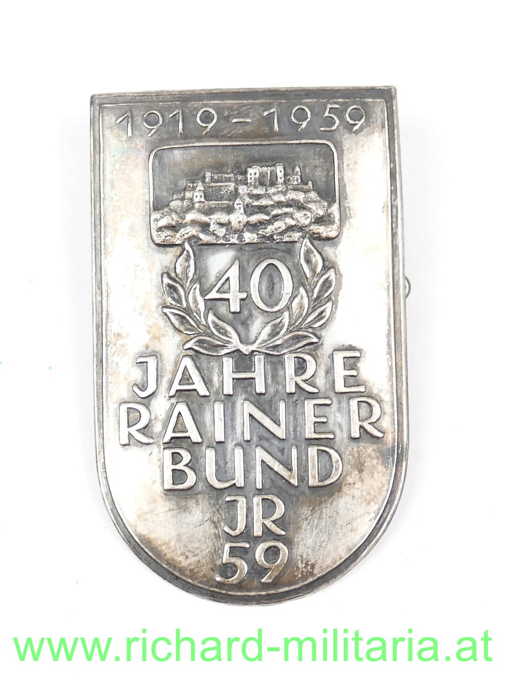 Abzeichen zum 40 jährigen Bestand des Rainerbundes JR 59 1919-1959, Weißmetall, originale Nadel;