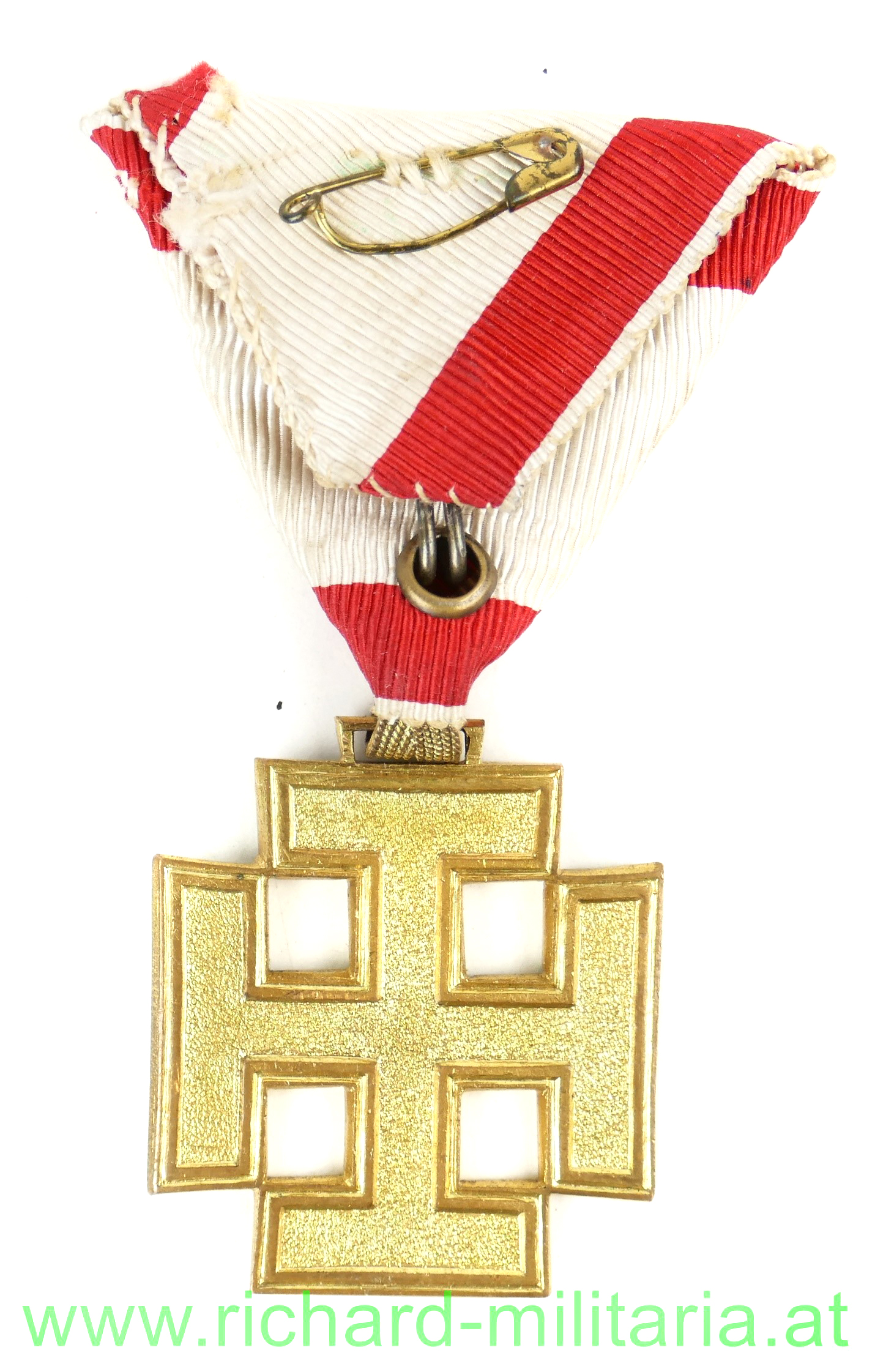 Goldenes Verdienstzeichen um den Österreichischen Bundesstaat, Buntmetall vergoldet, ohne Hersteller mit originalem Band, am Band kleine Tragenadel vernäht; guter leicht getragener Zustand