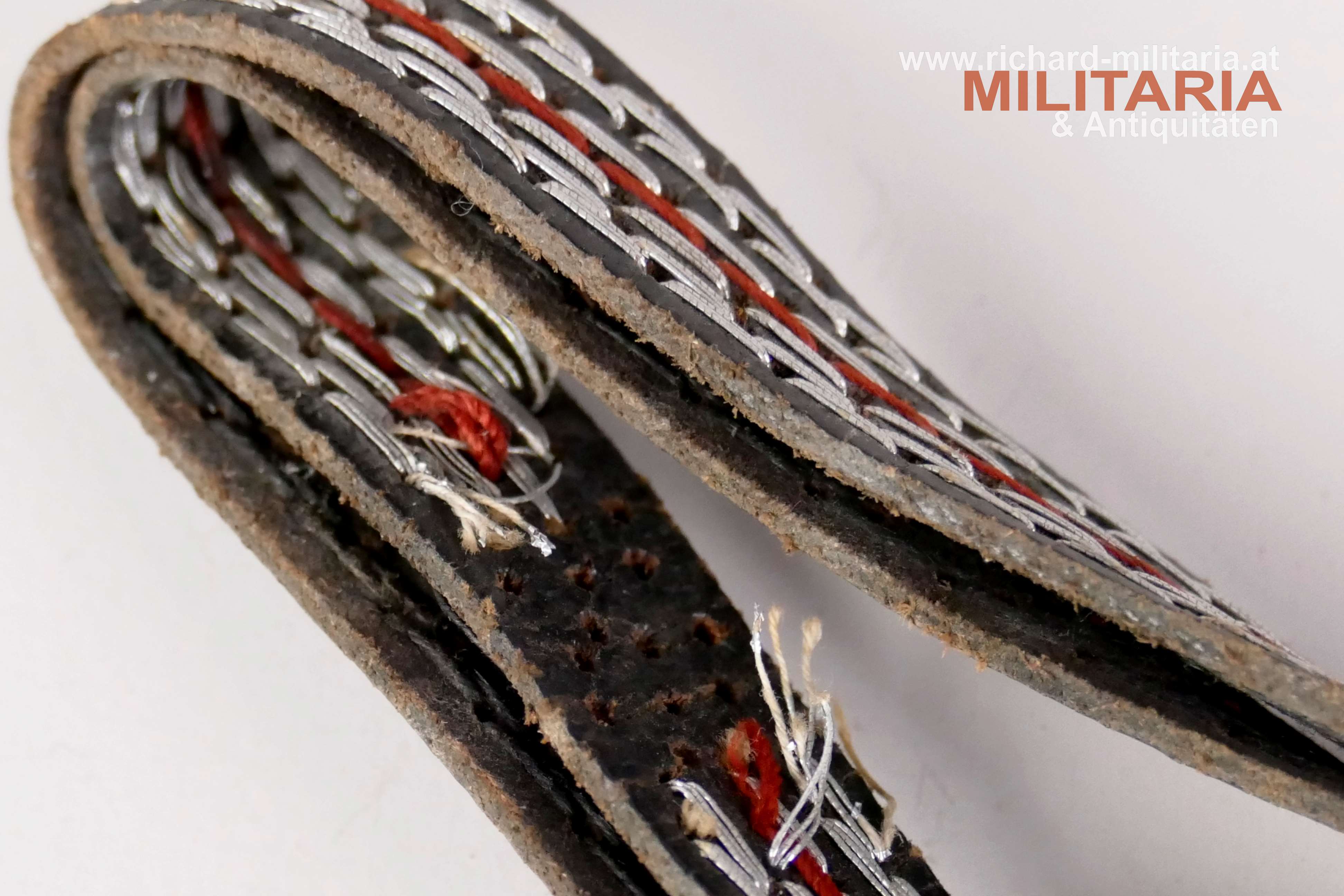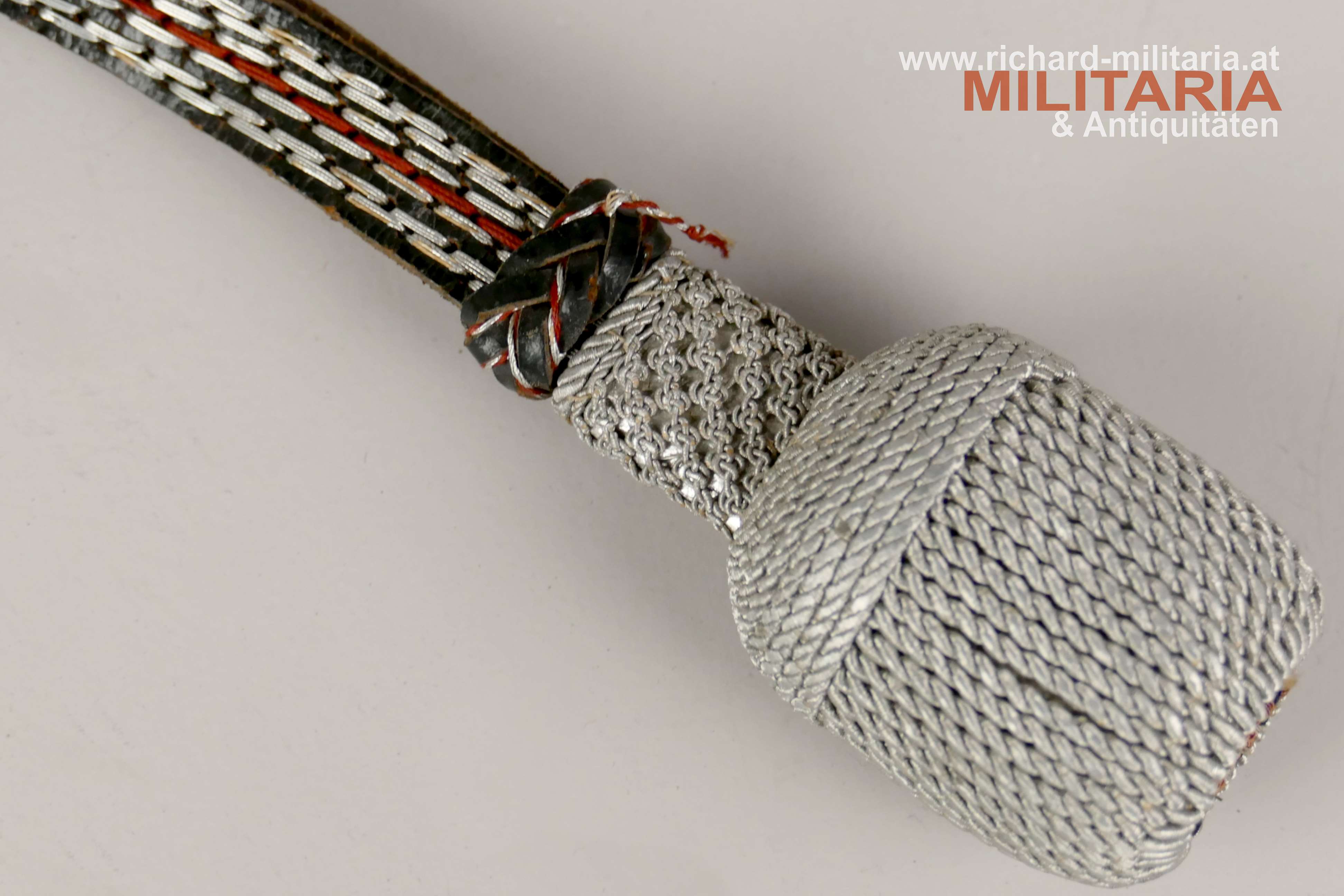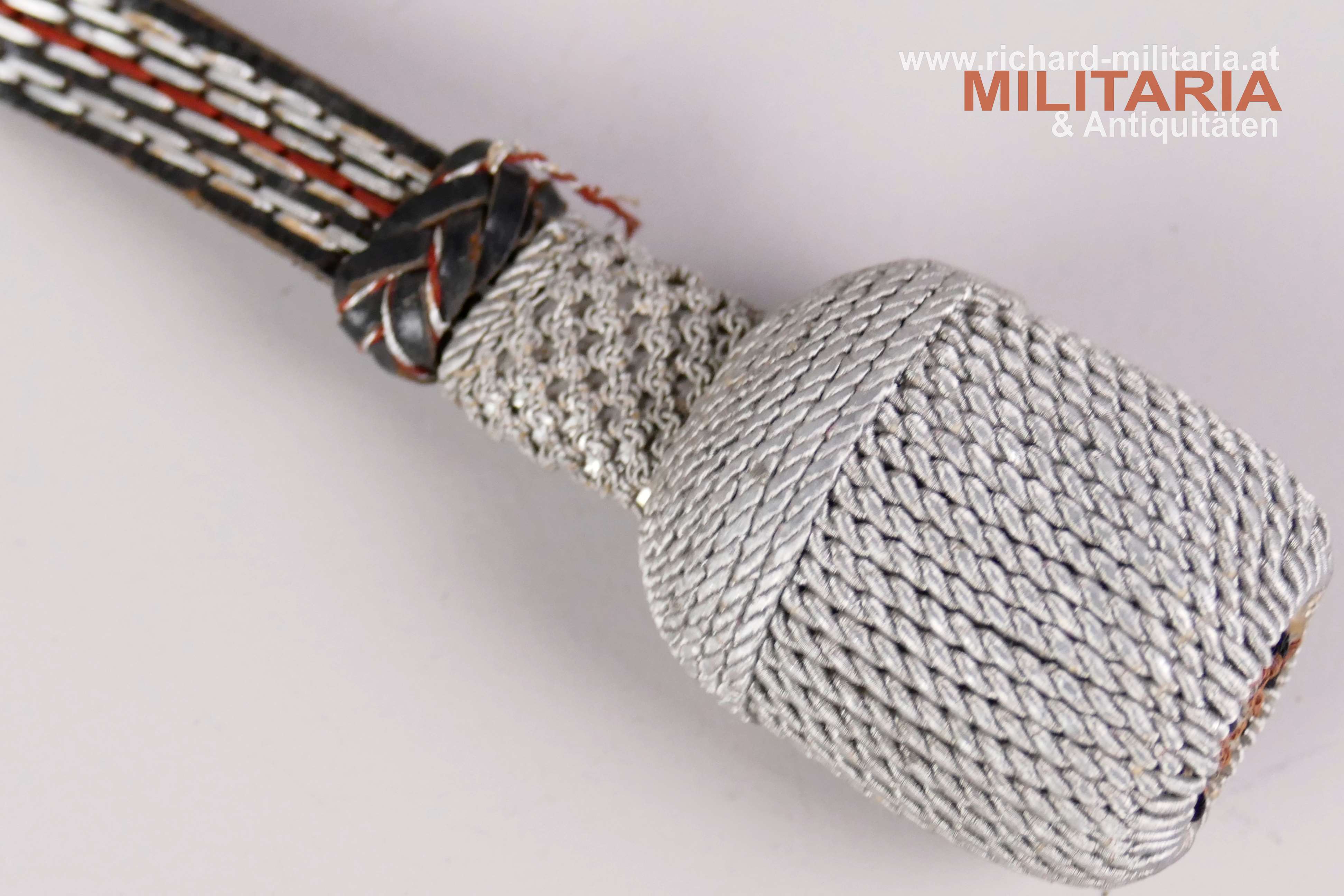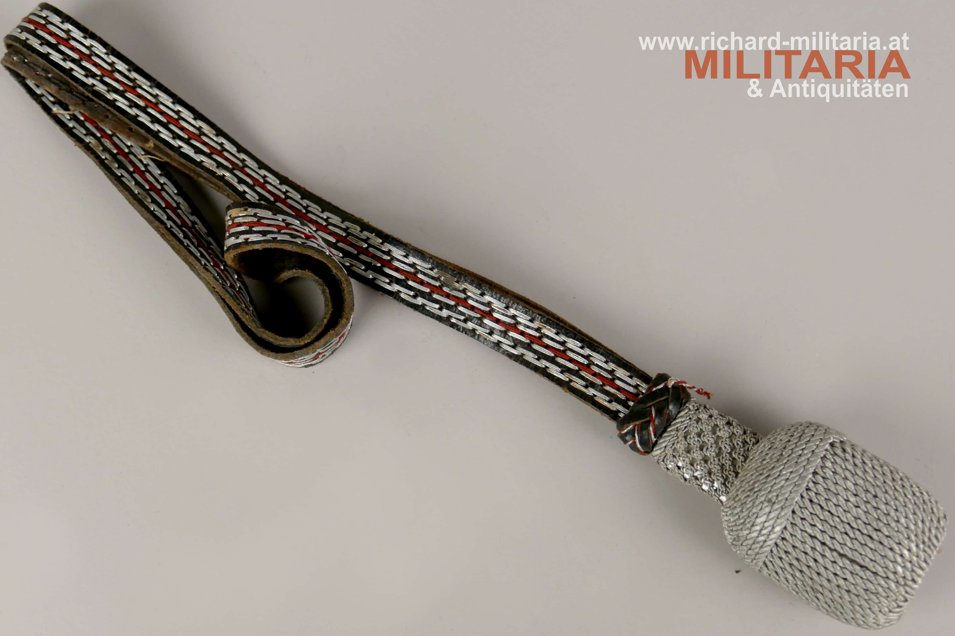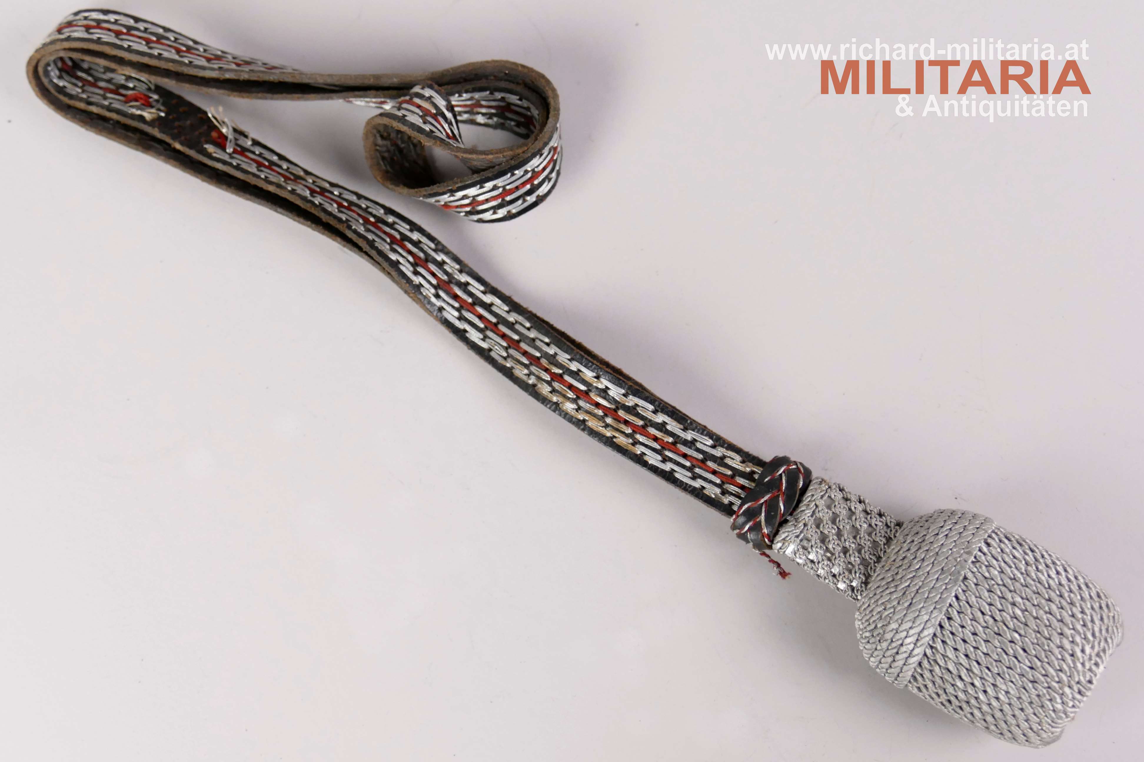 Deutsches Reich - Polizei Portepee für den Führerdegen, schwarzes Lederband mit Silberdrahtdurchzügen und rotem Stoffdurchzug, Eichel/Quaste komplett aus Silberfaden; Länge ca.: 43 cm