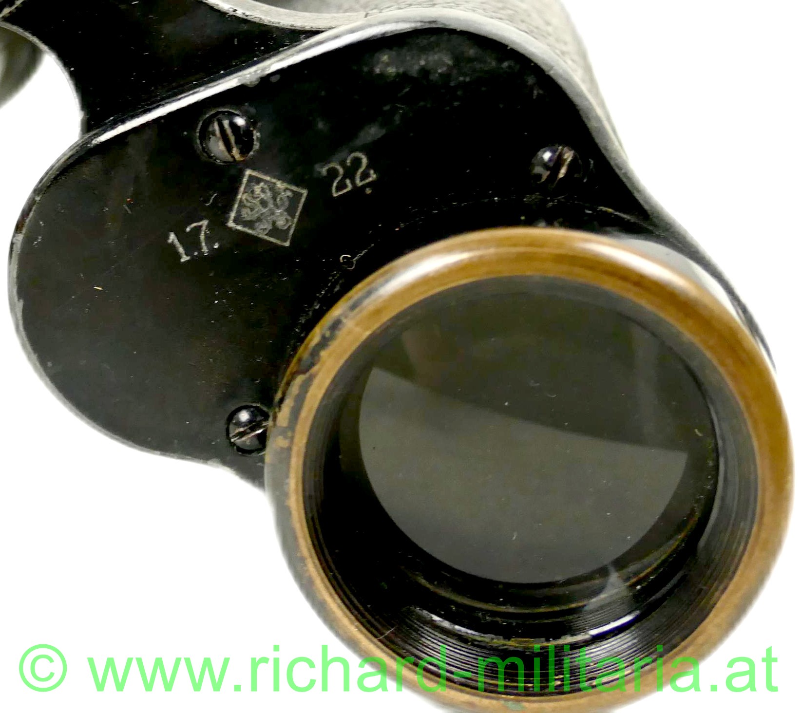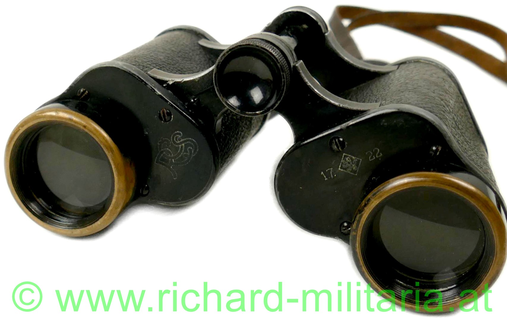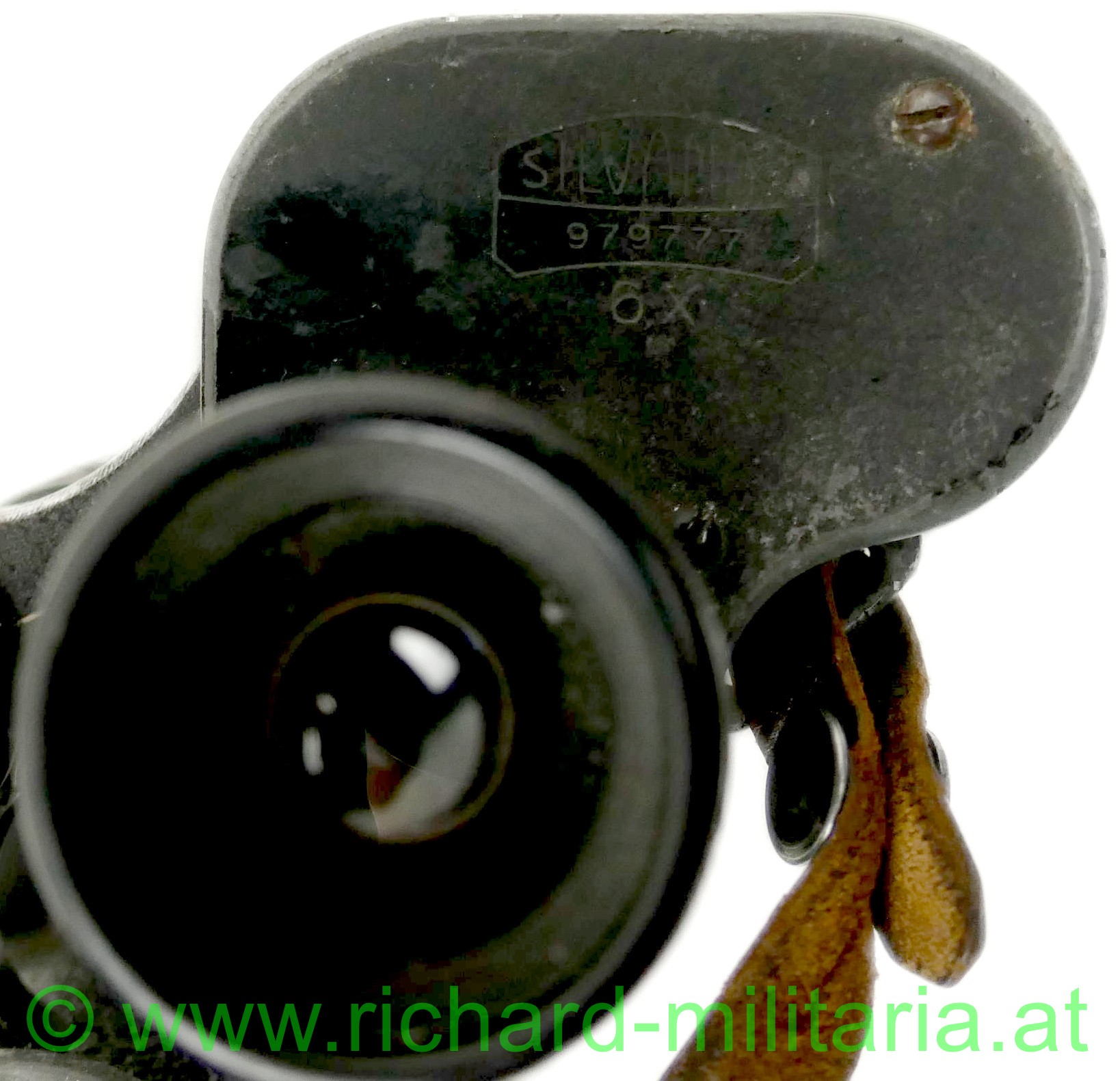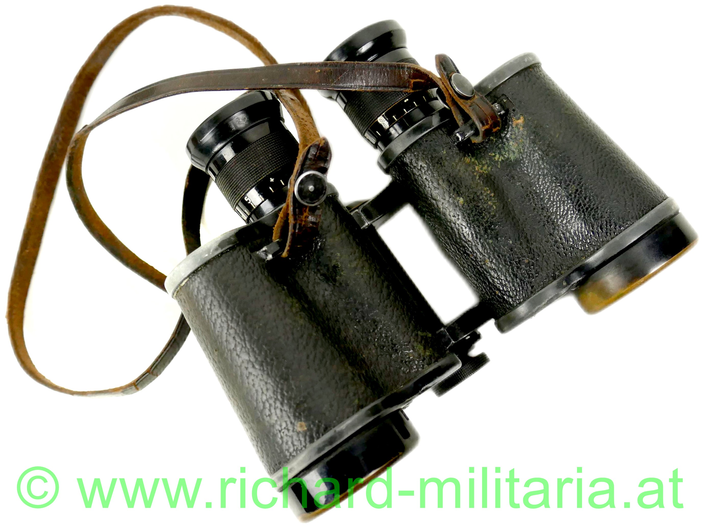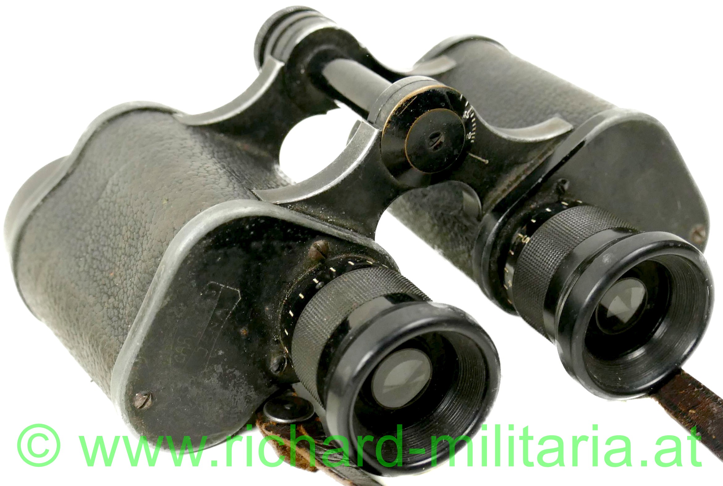 Dienstglas - Tschechoslowakei - Abnahmestempel, Hersteller: "Carl Zeiss Jena" - "SILVAMAR 979777 - 6x", mit Strichabkommen, Gehäuse mit schwarzem Leder überzogen, Metallteile geschwärzt - teilweise abgewetzt, schwarzer Ledertrageriemen, auf der rechten Frontabdeckung tschechoslowakischer Abnahmestempel mit Datum: "1.7.22", auf der linken Seiten gestichelte Buchstaben: "RCS";