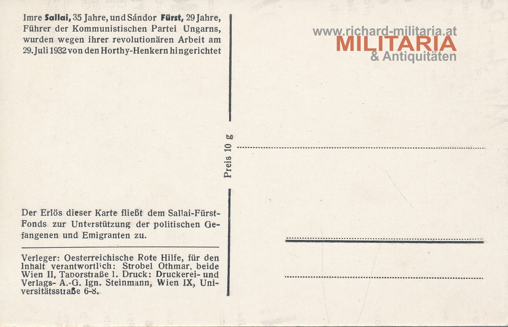 Postkarte z.B. des Sallai-Fürst-Fonds zur Unterstützung der politischen Gefangenen und Emigranten; Darstellung von Imre Sallai und Sándor Fürst, Führer der Kommunistischen Partei Ungarns, wurden wegen ihrer revolutionären Arbeit am 29.Juli 1932 von den Horthy- Henkern hingerichtet; Verlag: Österreichische Rote Hilfe Zustand 2 Richard Dawkins - Richard Militaria ℹ️