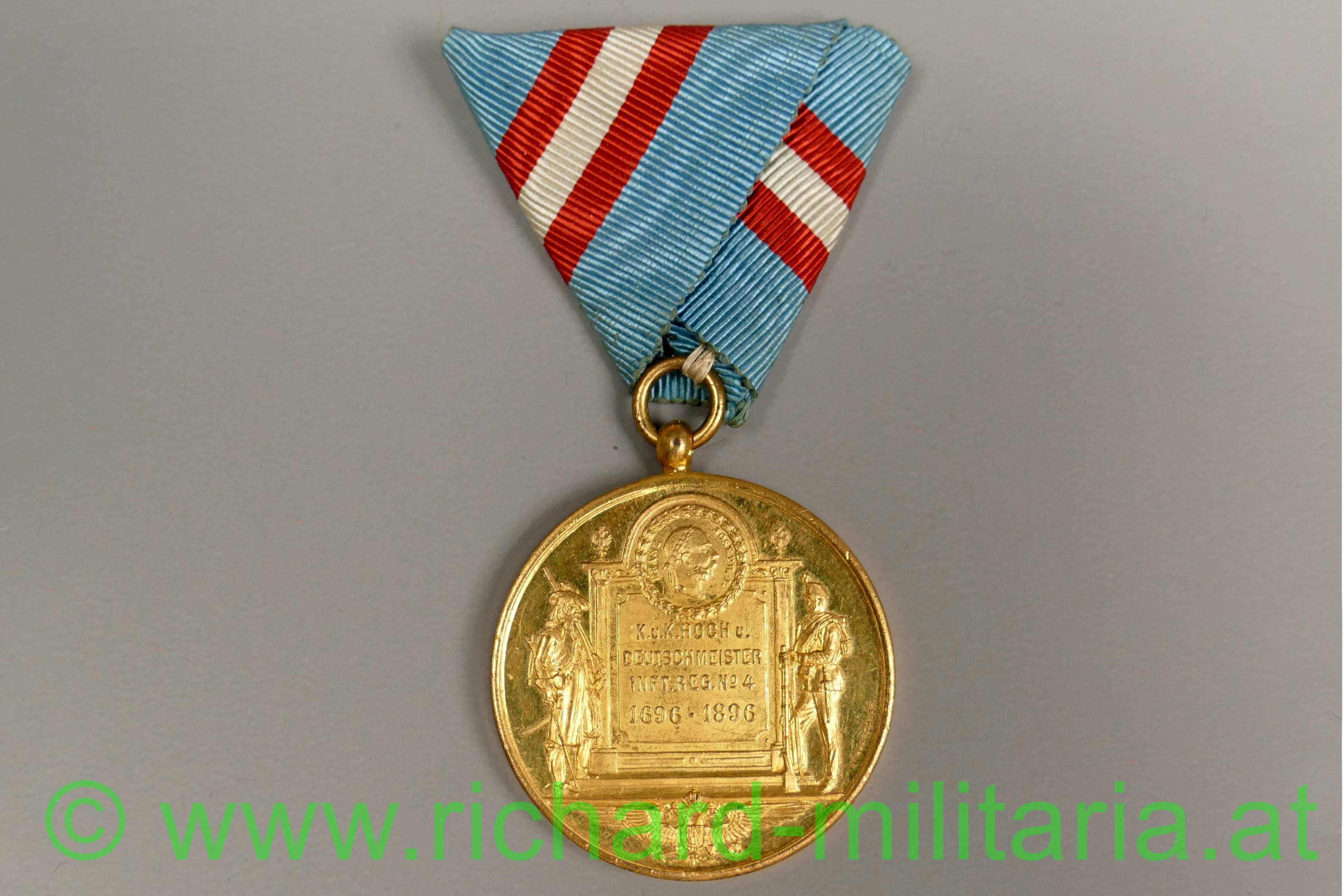k.u.k. Jubiläumsmedaille anläßlich 200 Jahre des IR Nr. 4 Hoch- und Deutschmeister, 1696-1896, Tombak vergoldet - prägefrisch (!!), original vernähtes Band;