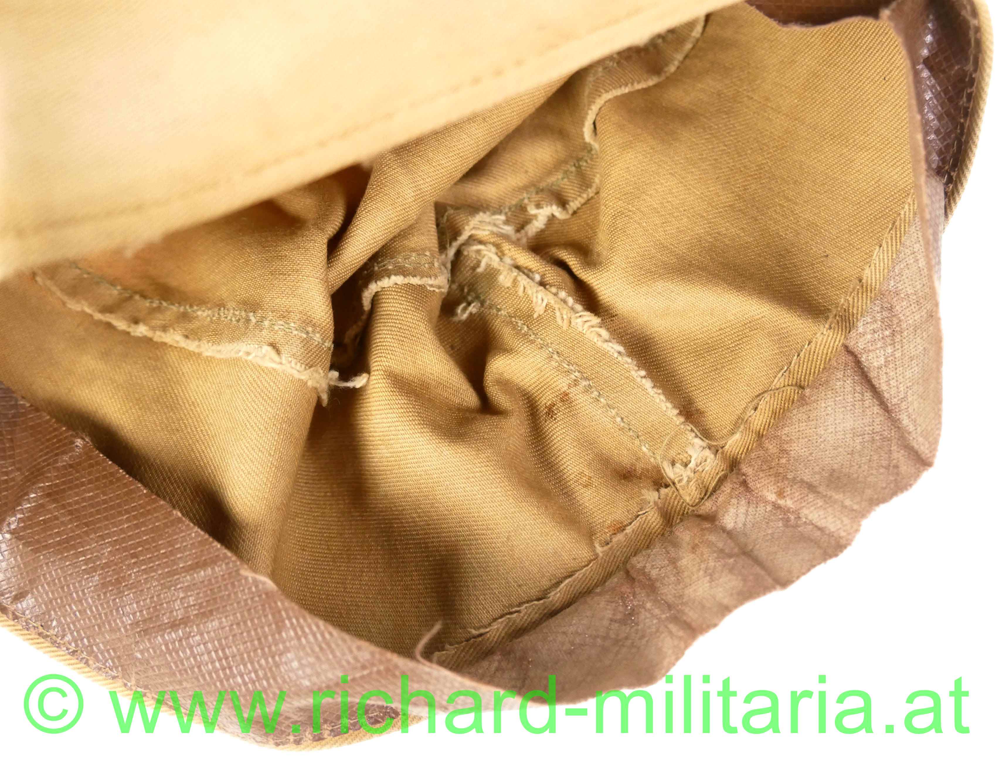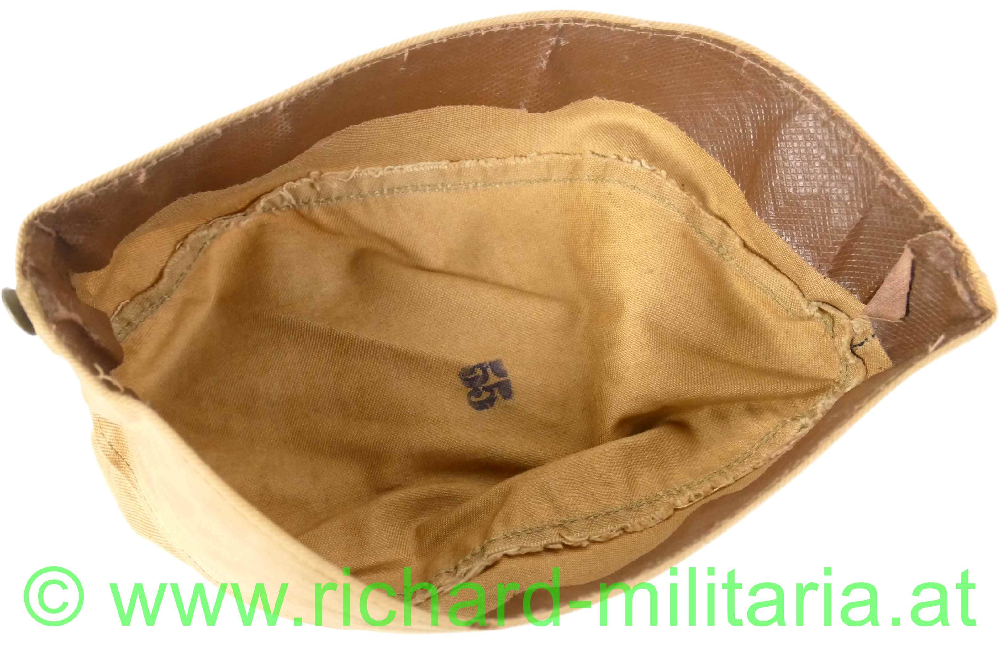 Jung Vaterland / Heimwehr - sandbraune Lagermütze, feine sandbraune Baumwolle, der abklappbare Ohrenschutz wird vorne mit 2 messingfarbenen Splintknöpfen gehalten, dunkelbraunes Schweißleder aus Ersatzmaterial, Größenstempel "55"; deutliche Sitzspuren einer fehlenden Kokarde;