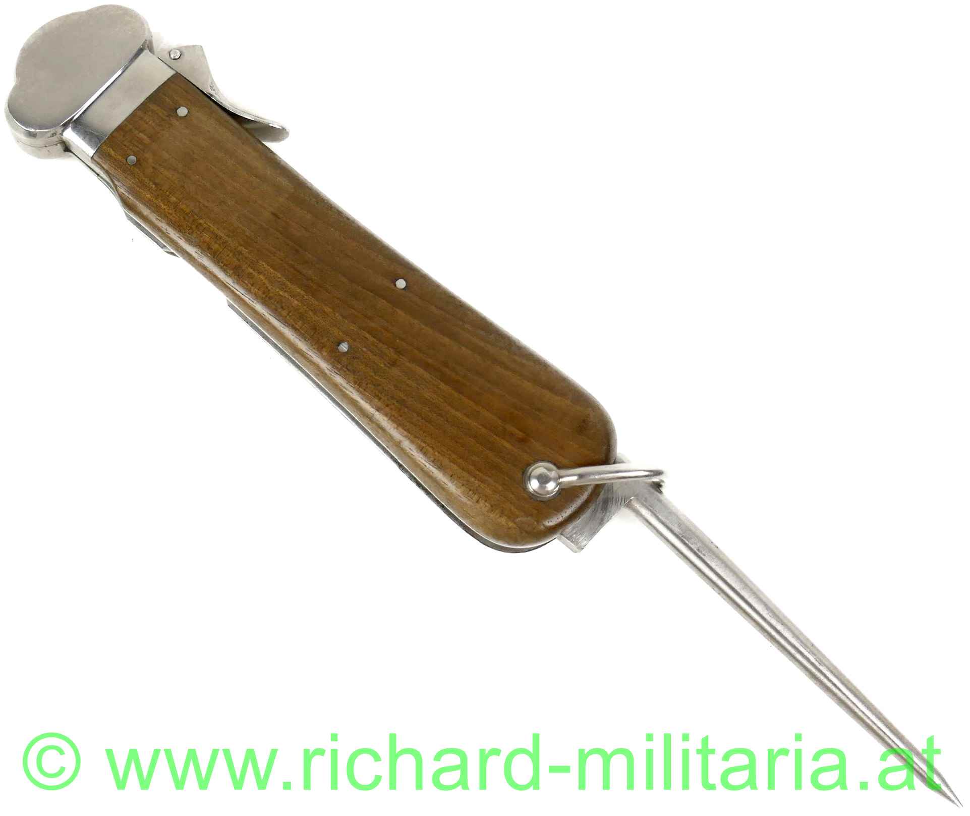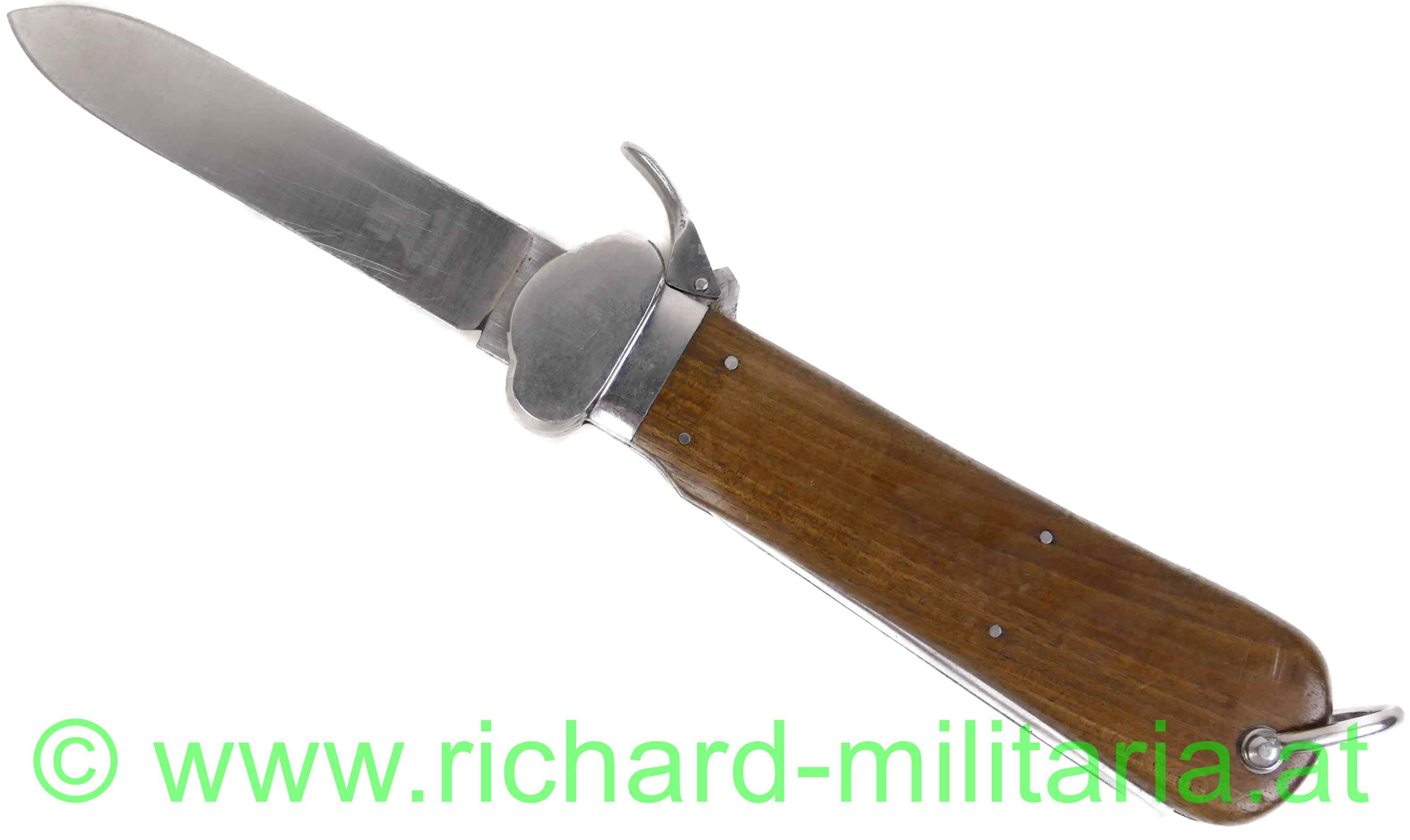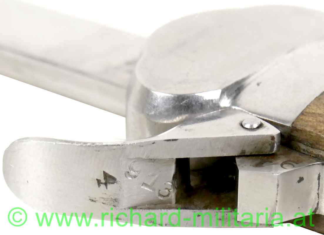 Flieger-Kappmesser der Deutschen Luftwaffe aus dem 2. Weltkrieg; 1. Modell - nicht zerlegbar; voll funktionstüchtig; am Dorn LW-Abnahme "5"; am Fixierbügel eingeschlagene Nummer "913"; gleich daneben die Nummer "4" geprägt; auf der Halterung des Fixierbügels ebenfalls die eingeschlagene Nummer "913"; Klinge mit Hersteller: "SMF-Solingen Rostfrei"; Klinge ungeschärft; original vernietete Holzgriffschalen; gut funktionierender Mechanismus;