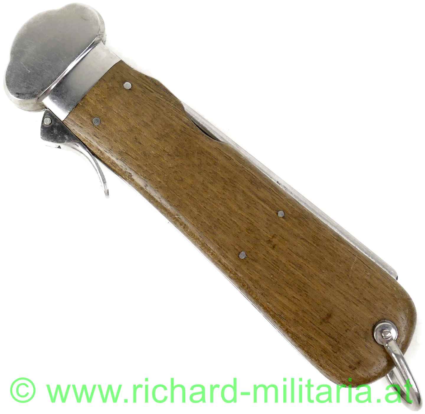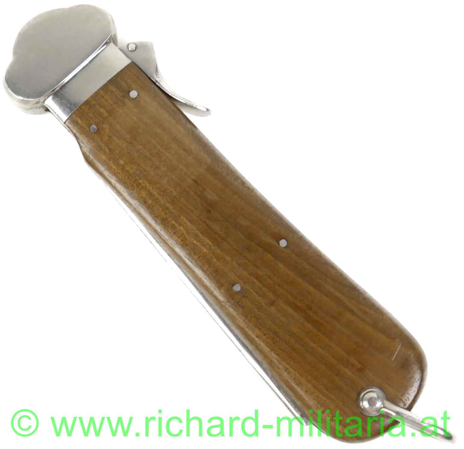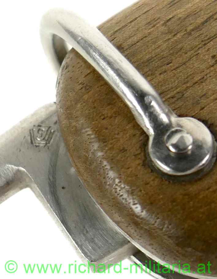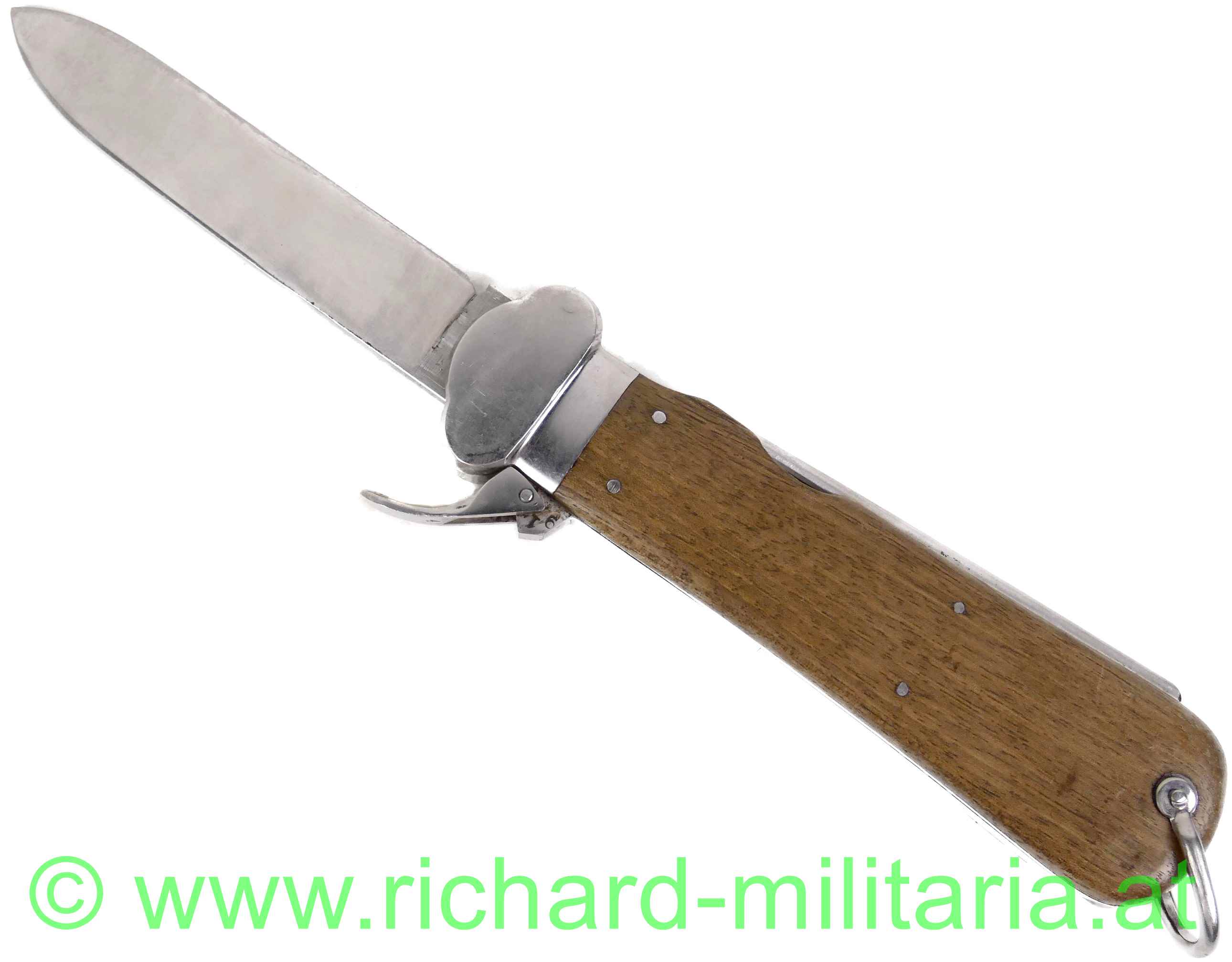 Flieger-Kappmesser der Deutschen Luftwaffe aus dem 2. Weltkrieg; 1. Modell - nicht zerlegbar; voll funktionstüchtig; am Dorn LW-Abnahme "5"; am Fixierbügel eingeschlagene Nummer "913"; gleich daneben die Nummer "4" geprägt; auf der Halterung des Fixierbügels ebenfalls die eingeschlagene Nummer "913"; Klinge mit Hersteller: "SMF-Solingen Rostfrei"; Klinge ungeschärft; original vernietete Holzgriffschalen; gut funktionierender Mechanismus;