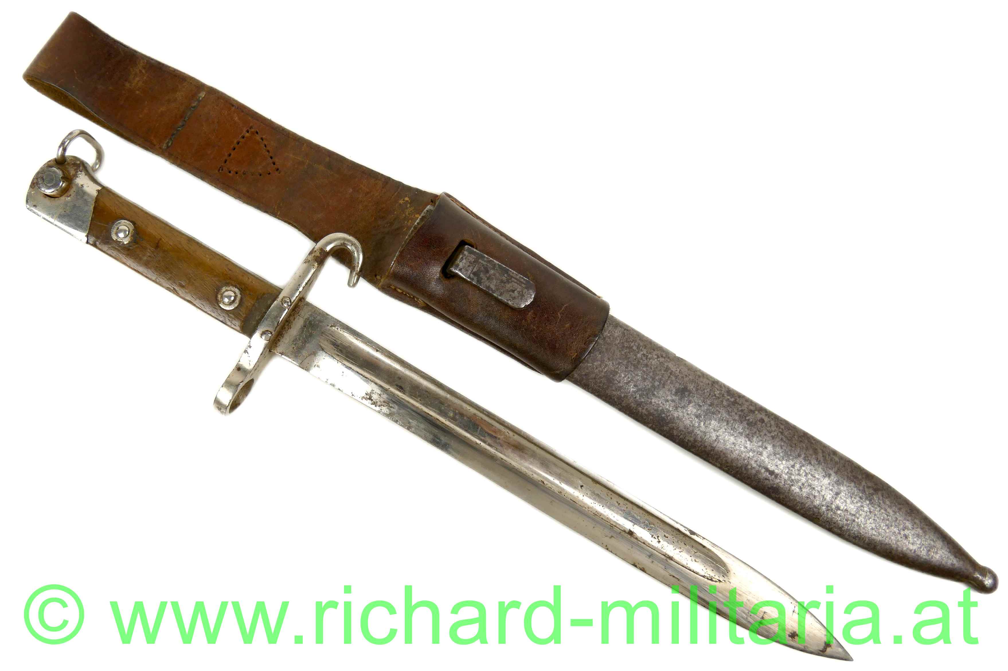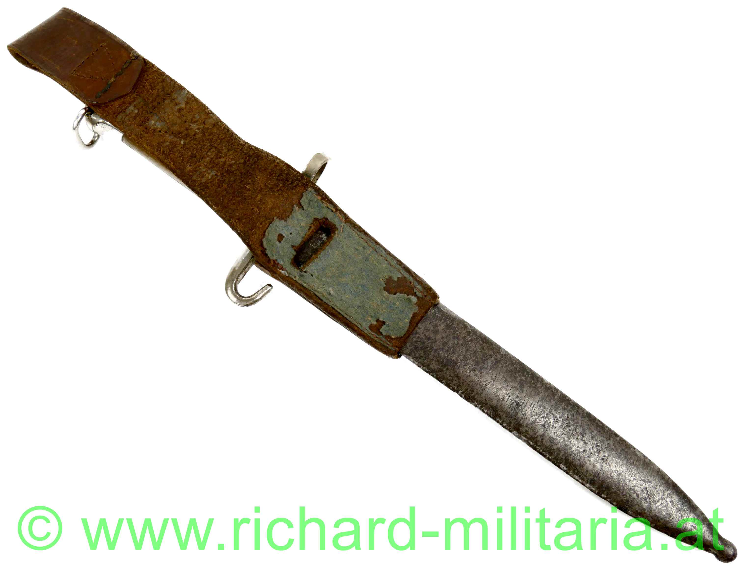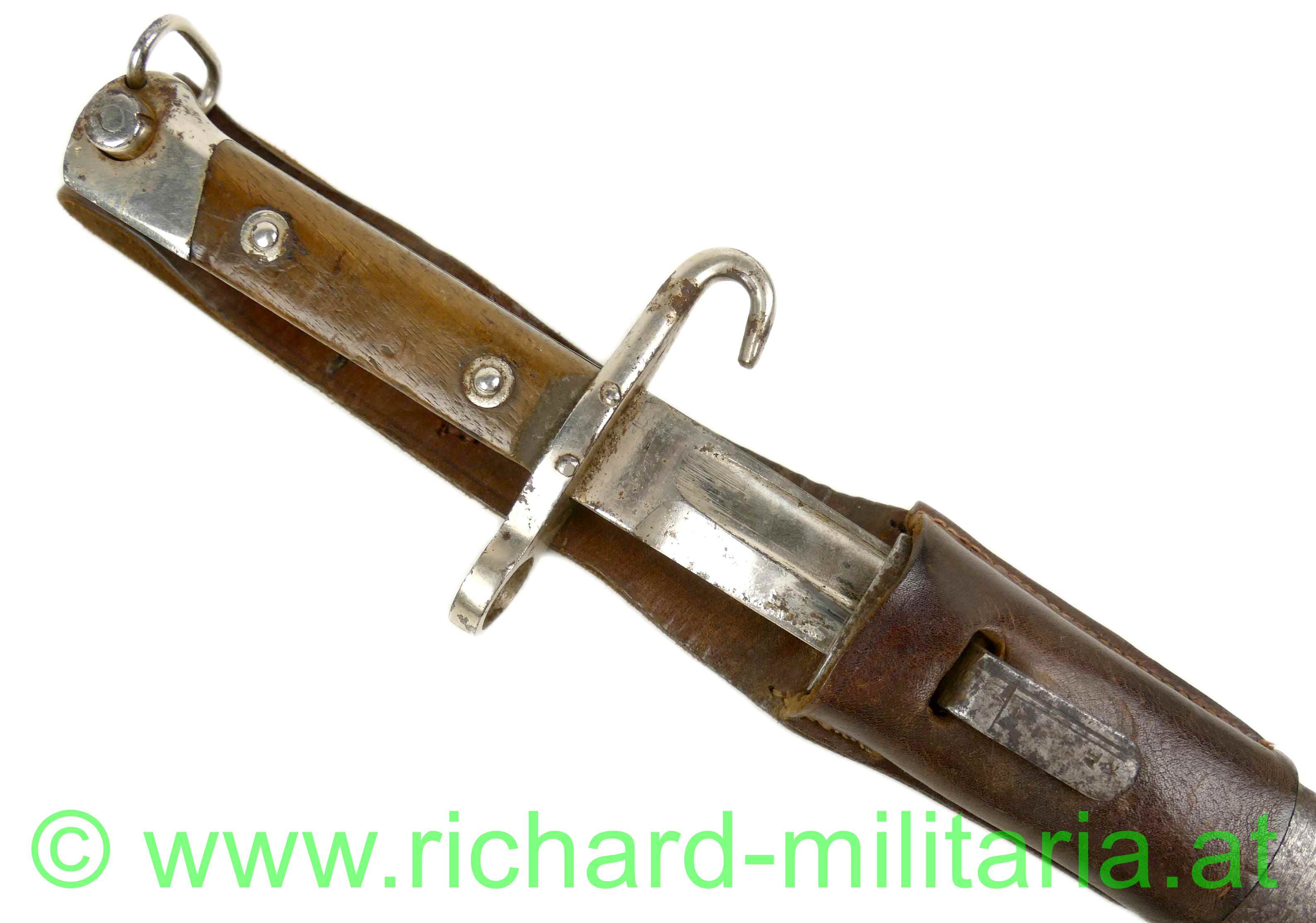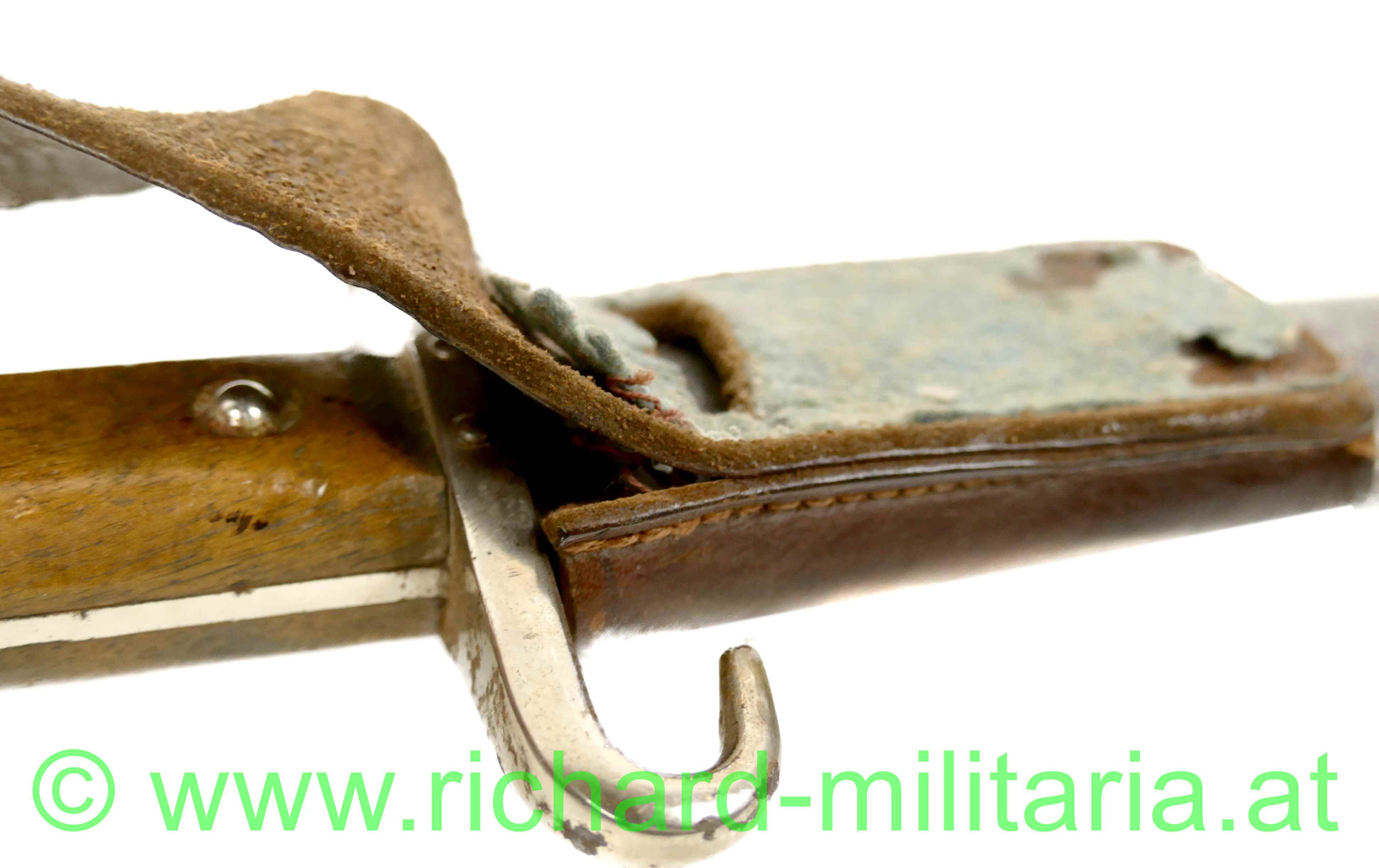 k.u.k. Messerbajonett M1895 für Offiziere; komplett vernickeltes Bajonett ohne Hersteller und teilweise flugrostig, keine Armeeabnahme, mit Kugelkopfnieten 2fach vernietete braune Holzgriffschalen, Scheide mit Hersteller: AE u. Armeeabnahme - so gut wie keine Lackierung mehr erkennbar - teilweise flugrostig, braune Seitengewehrtasche in typischer Offiziersausführung - auf der Rückseite noch Reste vom hellgrauen Filz ersichtlich - zusätzlicher Schlitz auf der Rückseite des Leders (?);