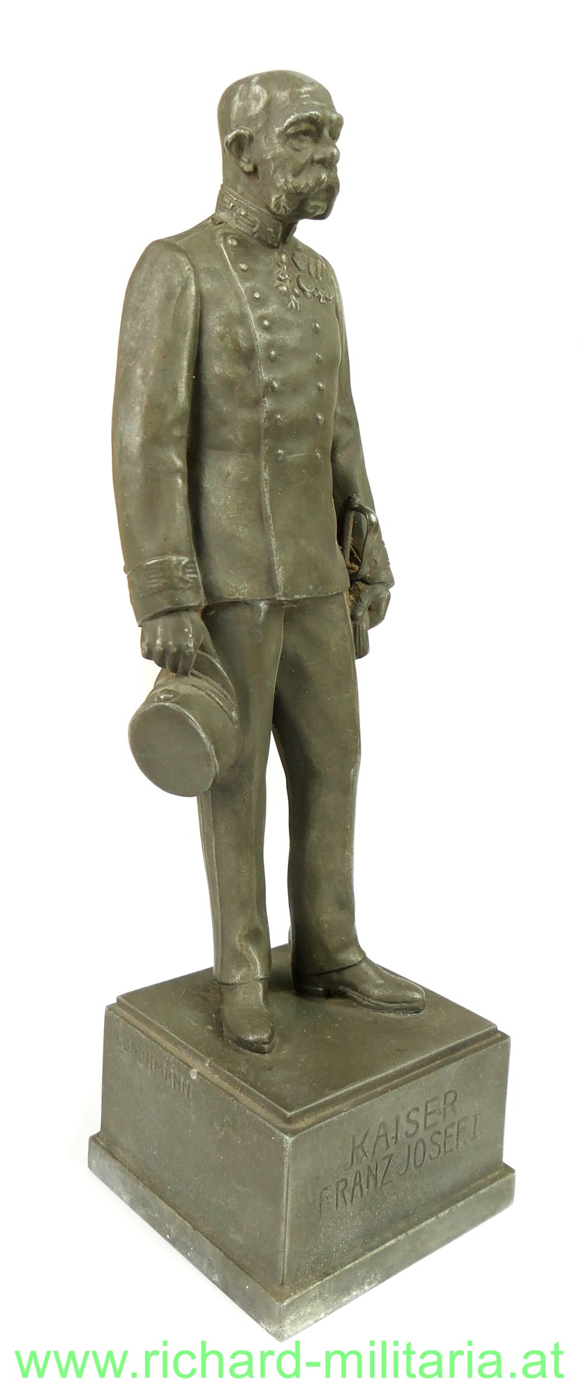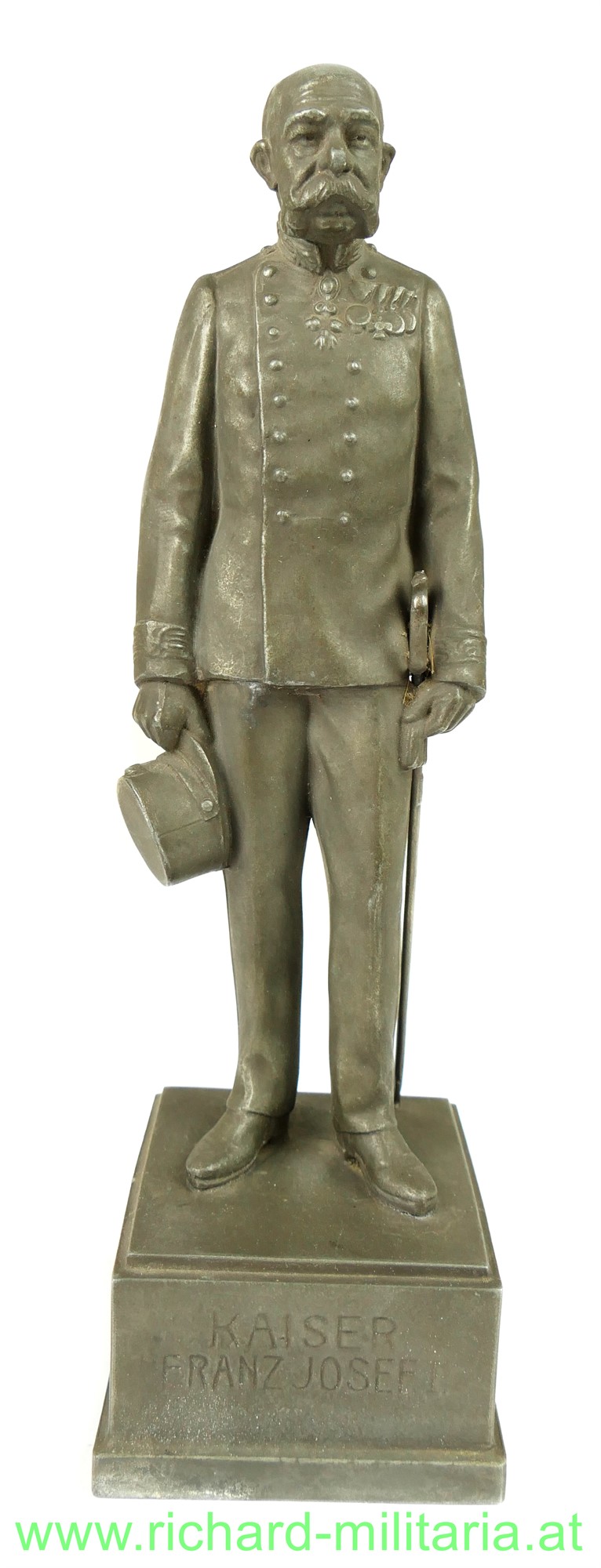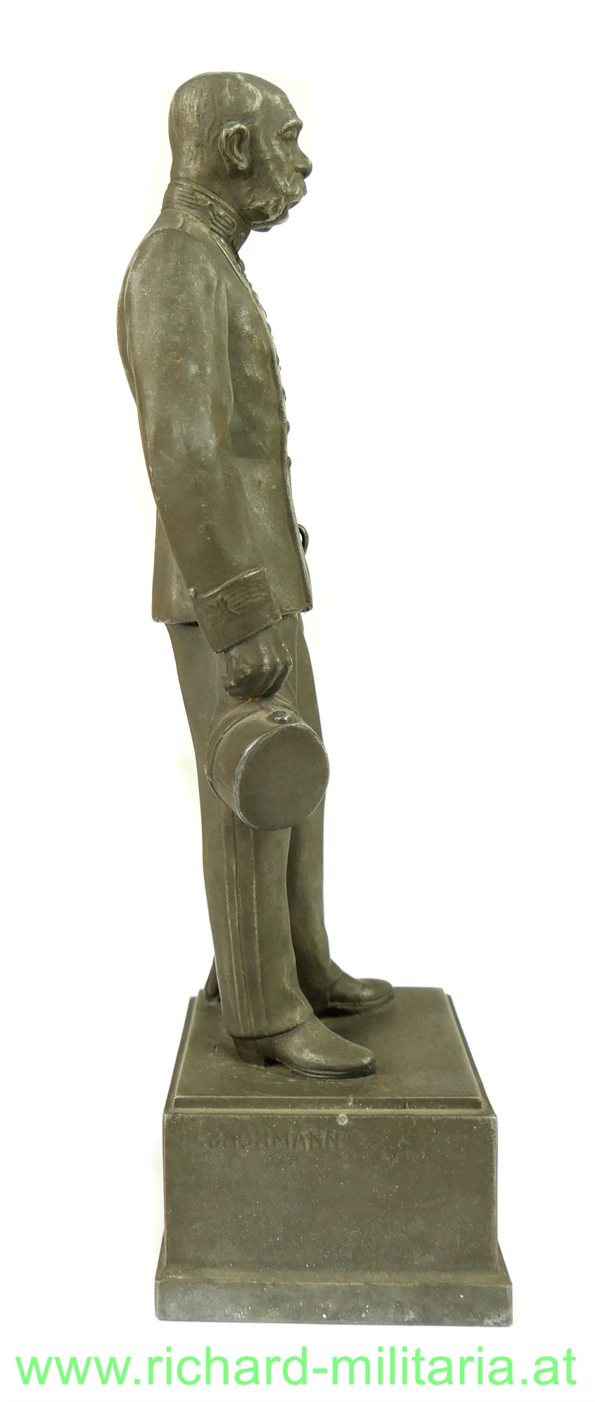 Offizielle Kriegsfürsorge - Figur von Kaiser Franz Josef in Uniform mit abgenommener Kappe, Darstellung von "R. Bachmann", Zinkguss, 26,5 cm Höhe