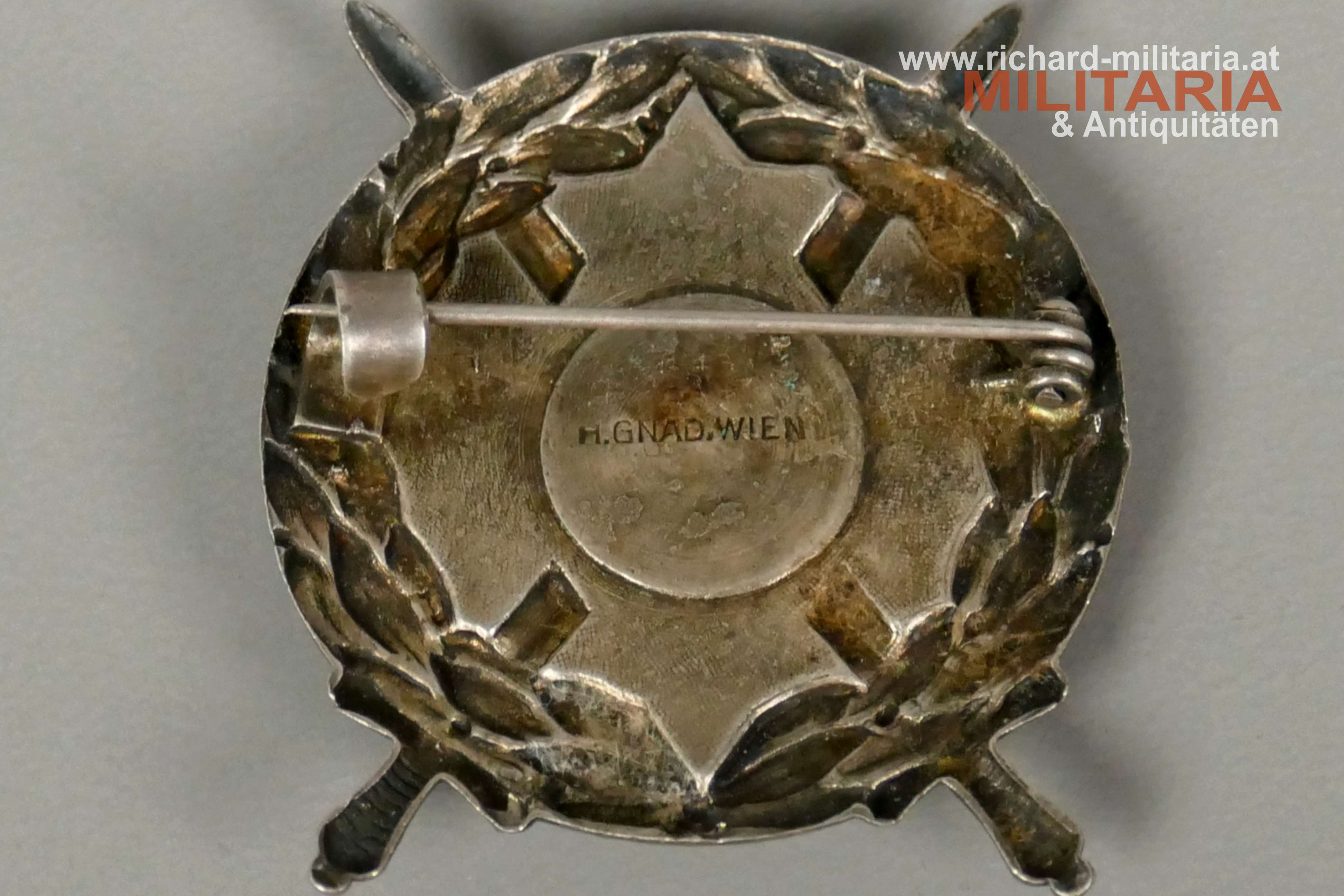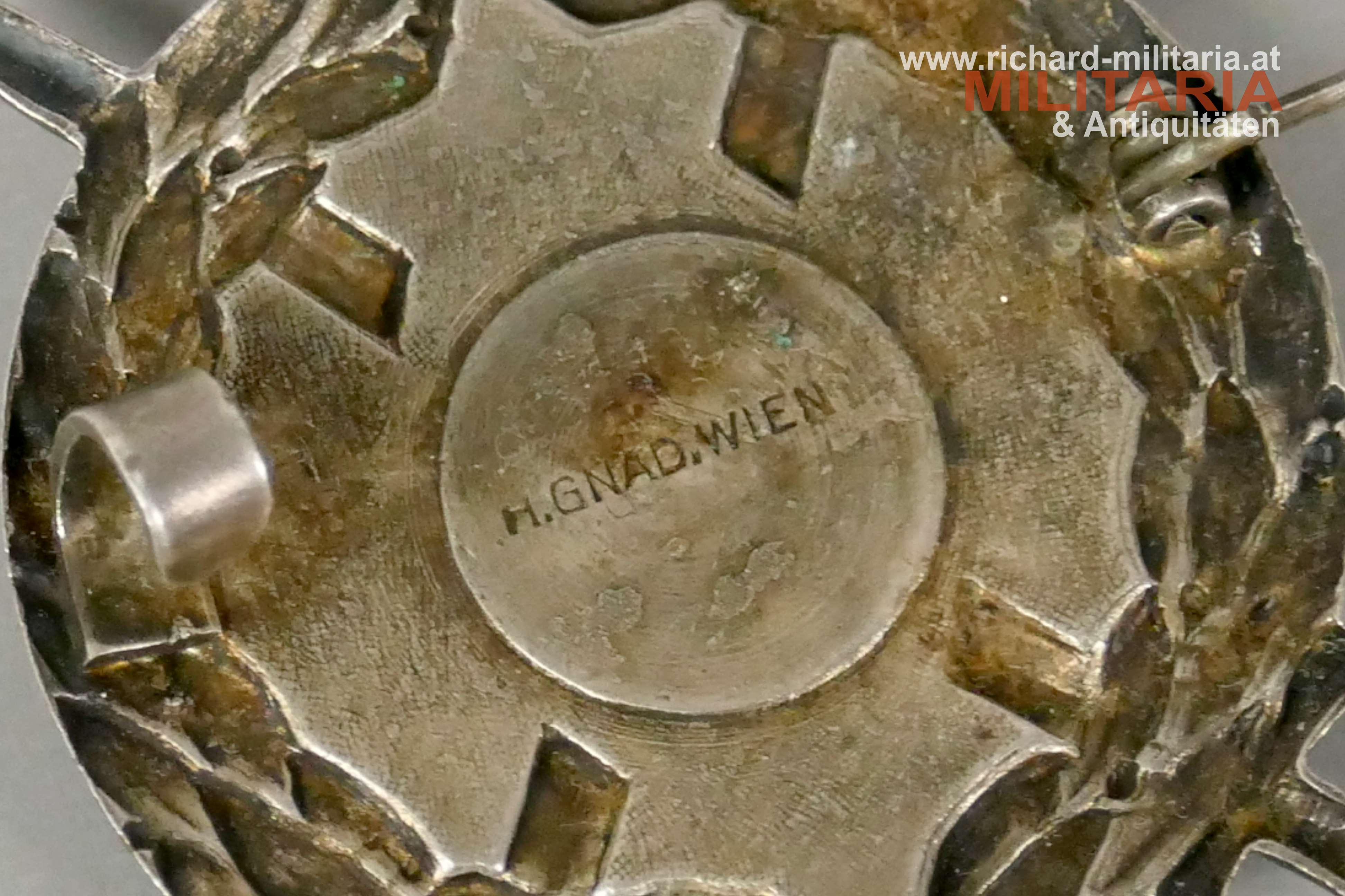 Silbernes Ehrenzeichen für Angehörige der Ostmärkischen Sturmscharen, Tombak hohl geprägt versilbert und mit emaillierter Mittelauflage, Hersteller: "H. Gnad, Wien", originales Nadelsystem;
