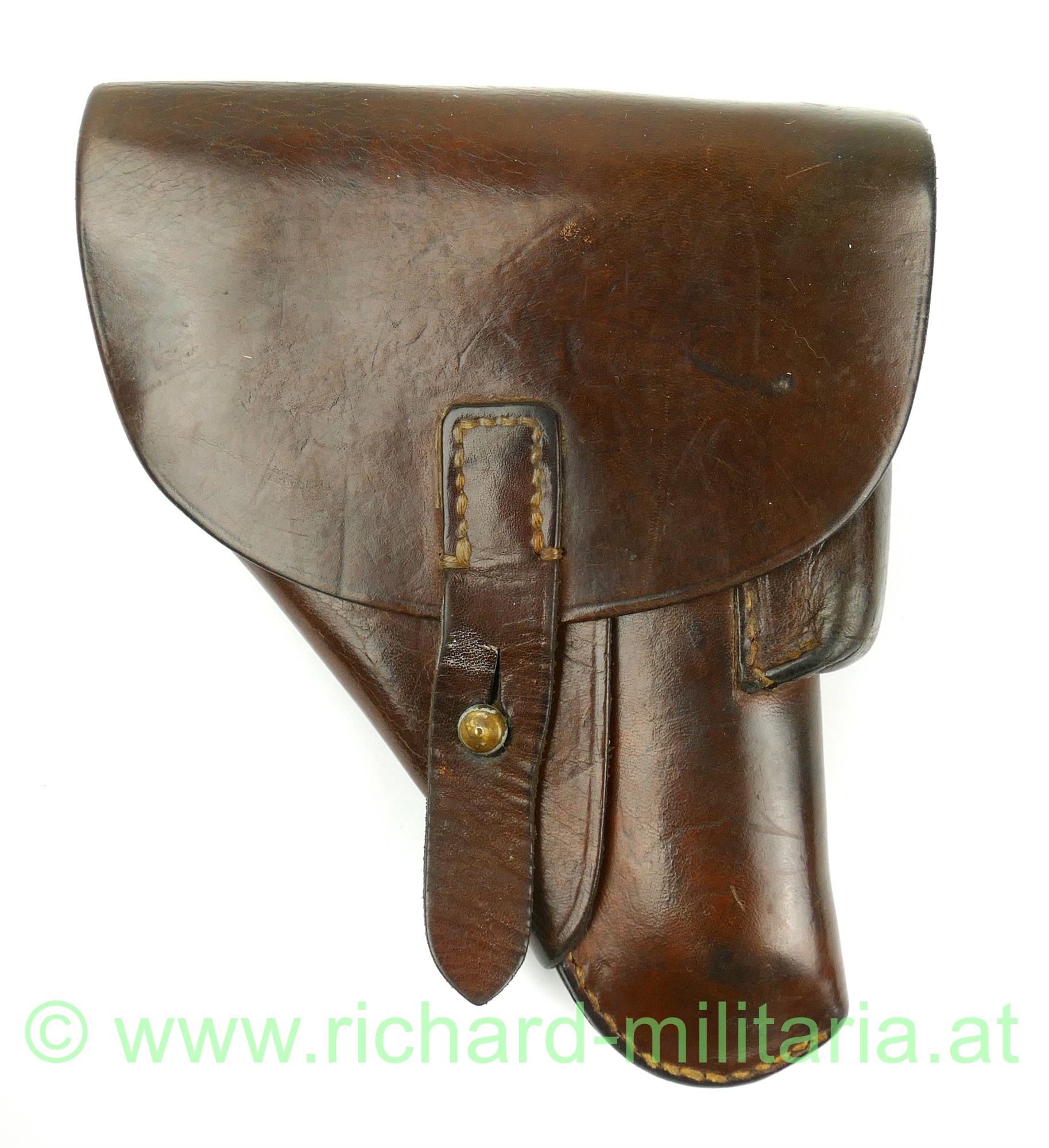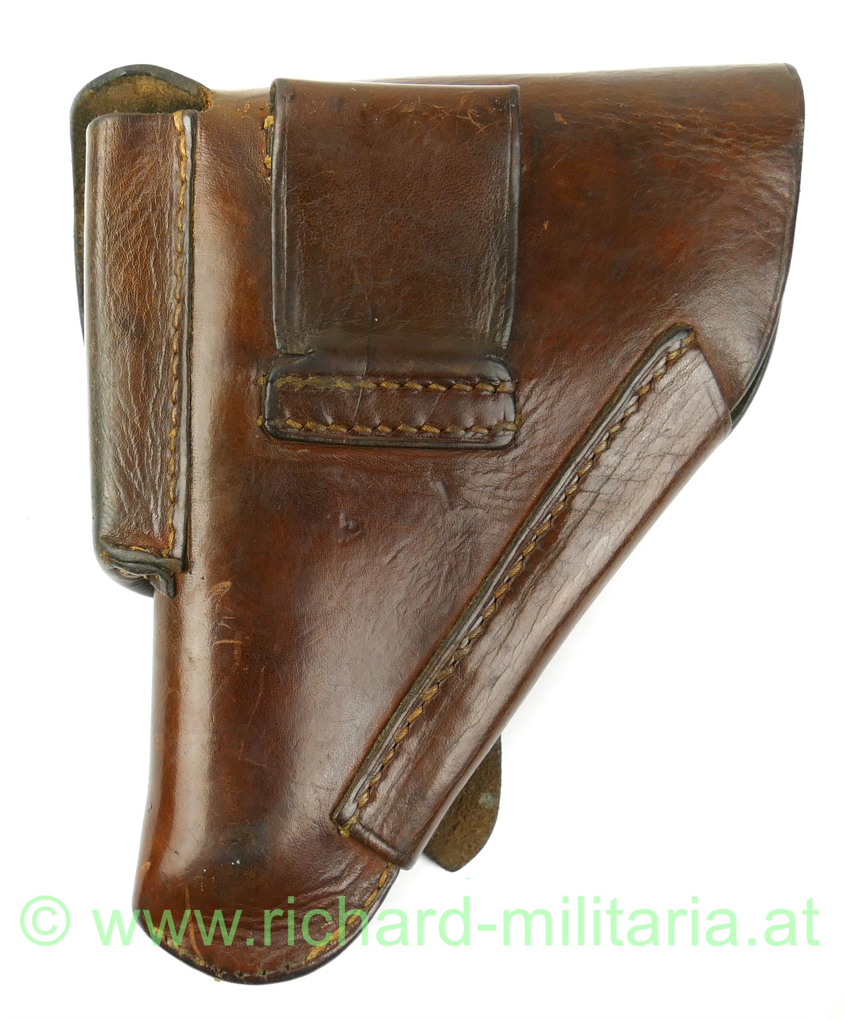 Pistolentasche Kal. 7,65mm, braunes starkes Leder, alle Nähte, auf der Rückseite breite Trageschlaufe (typisch deutsche Ausführung aus dem 2. Weltkrieg), keine Abnahme- bzw. Herstellerstempel;