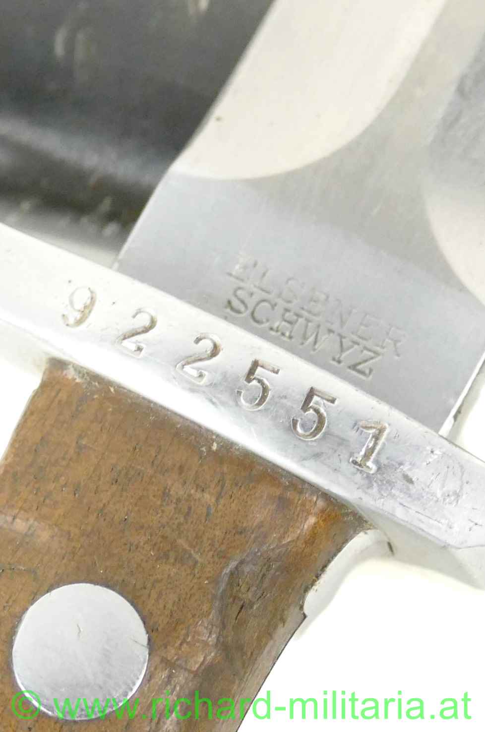 Schweiz Bajonett Modell 1918 komplett mit Scheide und Lederschlaufe, Hersteller: "Elsener Schwyz" auf der dolchartigen zweischneidigen Klinge, original vernietete Holzgriffschalen, Waffennummer "922551" und Schweizer Kreuz in der Parierstange, Markierung an der Scheide,