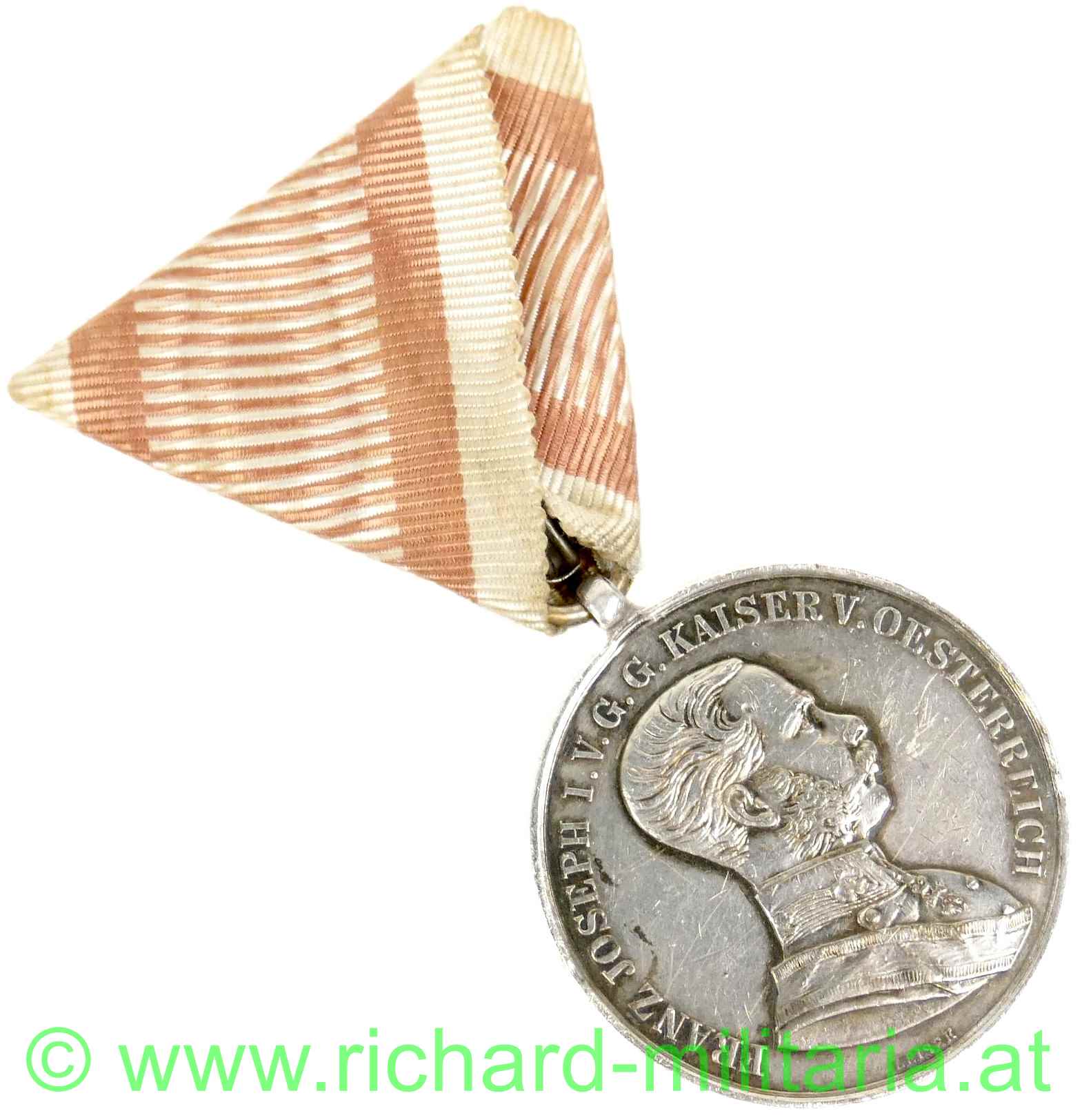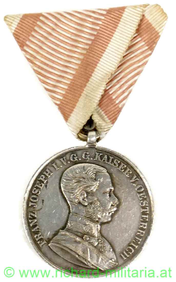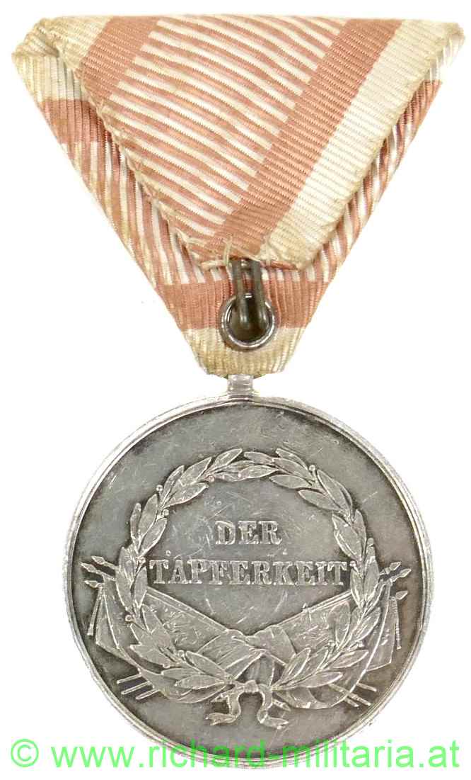 Silberne Tapferkeitsmedaille 1. Klasse Kaiser Franz Josef, Silber mit Randpunzierung "A", originales Band