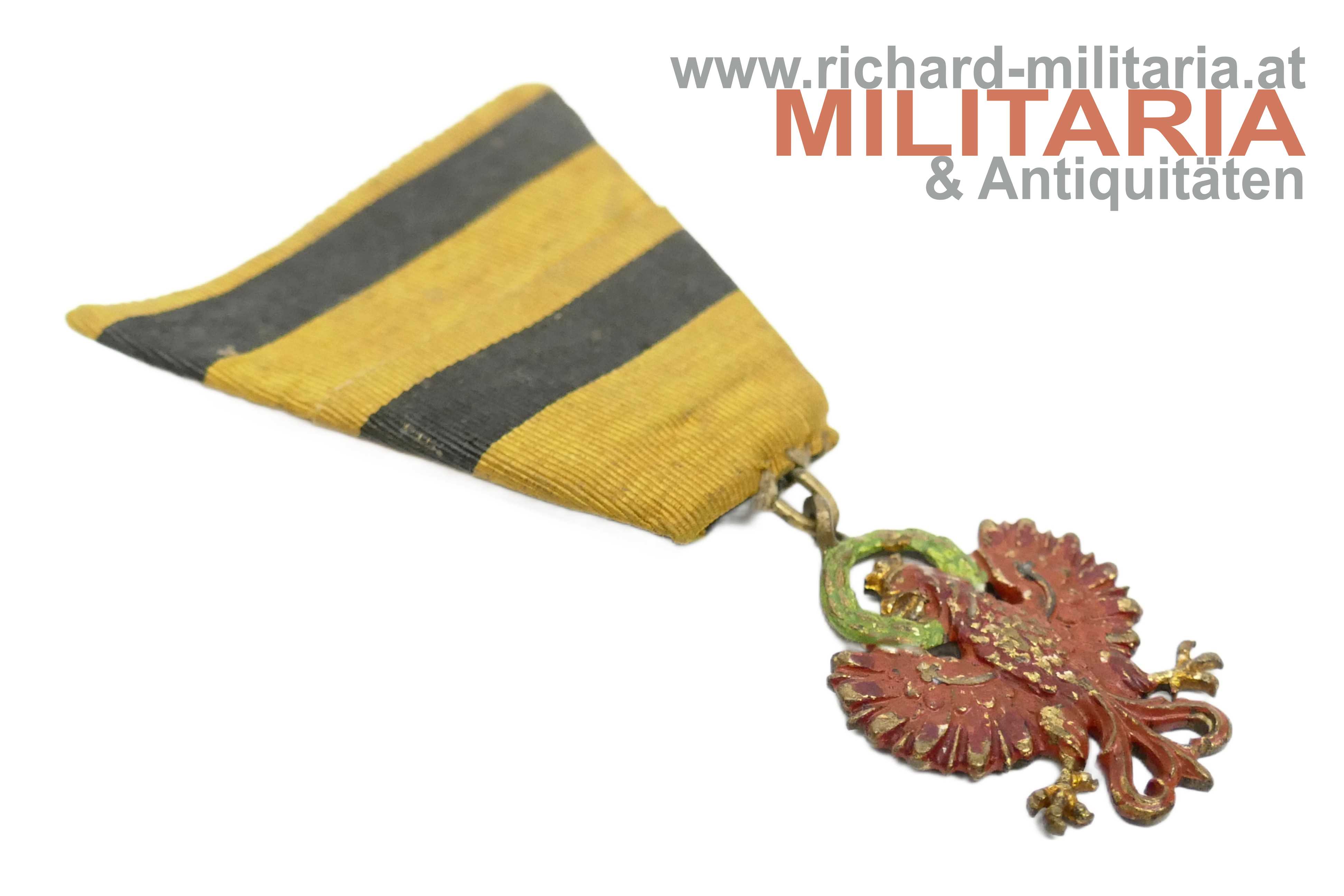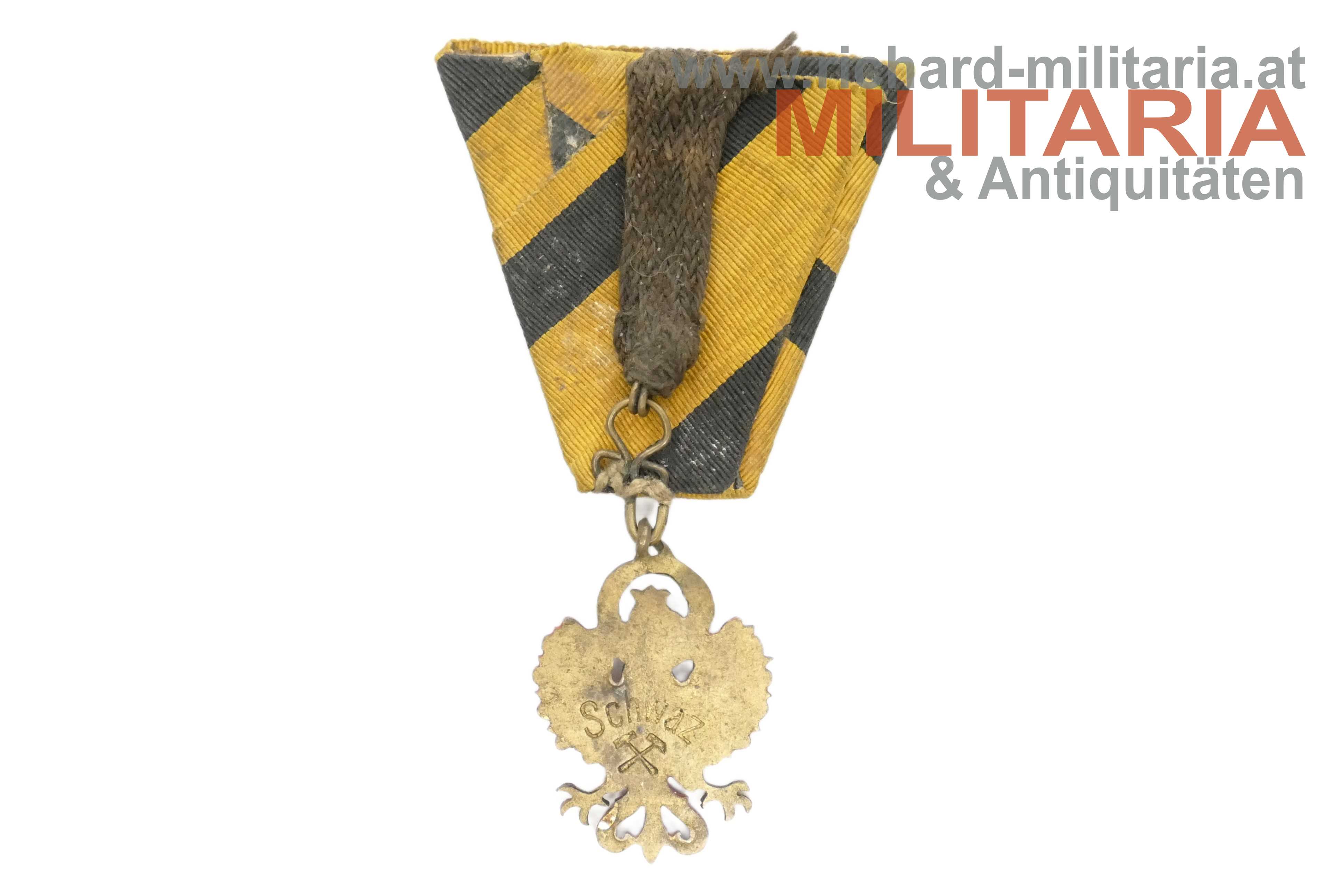 Abzeichen - Tiroler Adler - Bergbau Schwaz; Tombak avers lackiert; mit schwarz-gelben Band mit Stoffschlaufe auf der Rückseite zum Einhängen; revers am Adler "Schwaz" und ein Symbol für Bergbau;