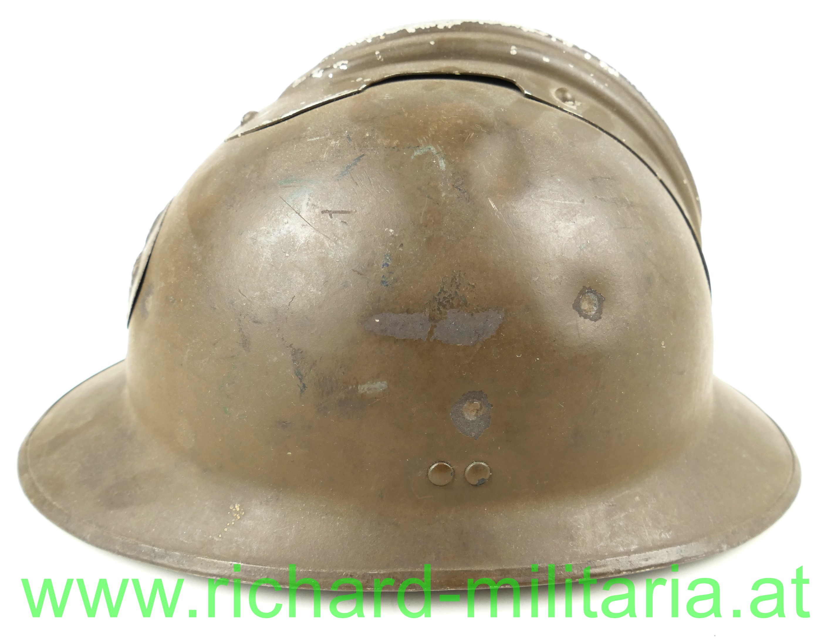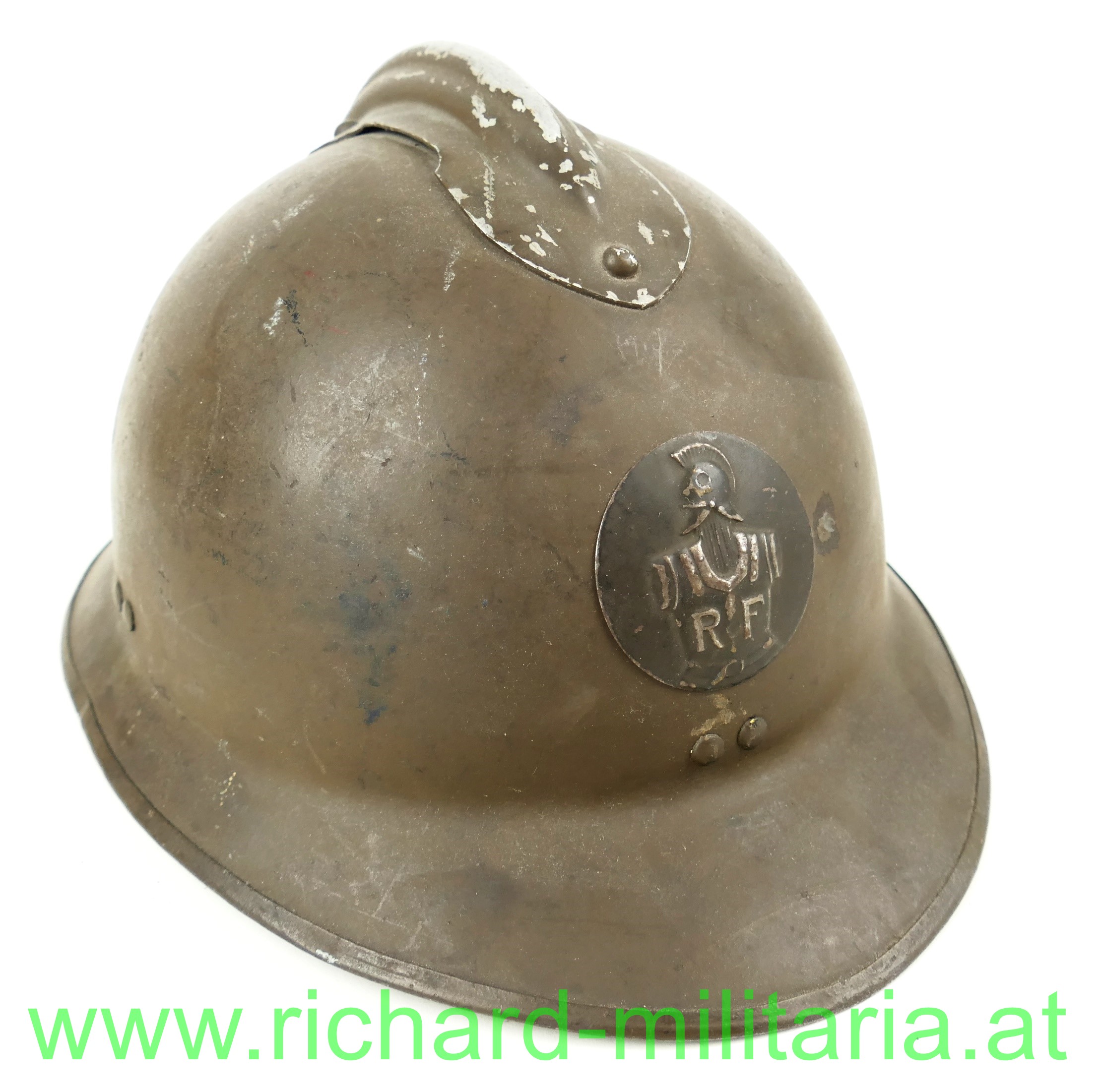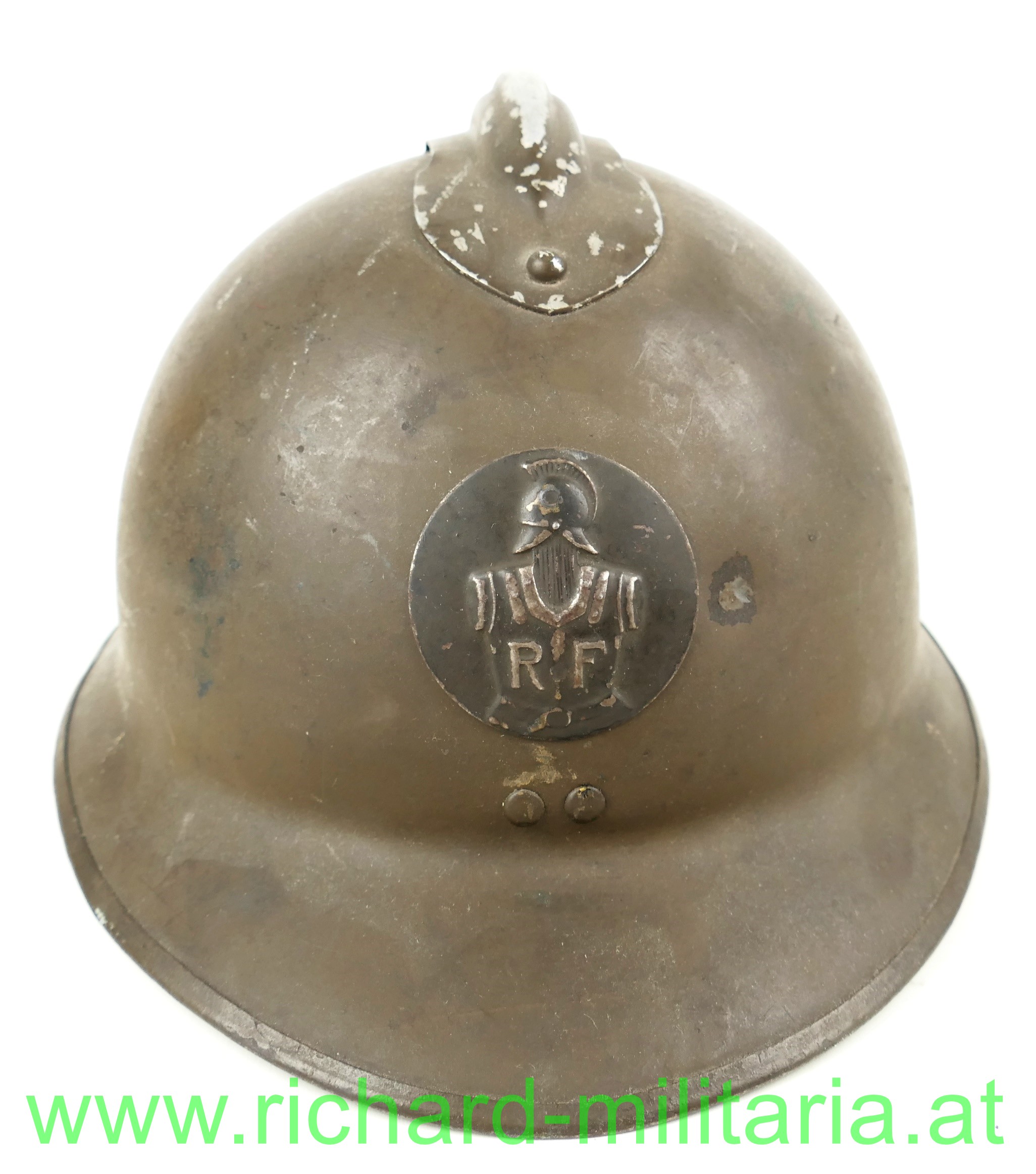 Adrianhelm - Frankreich - Pionier, originaler feldgrauer Anstrich; mit aufgenietetem Kamm und Emblem der Pioniere, mit originalem Innenhelm und Tintenstempel des Herstellers, Kinnriemen fehlt; mit Bleistift am Nacken beschriftet (schwer lesbar); 3 kleine Dellen