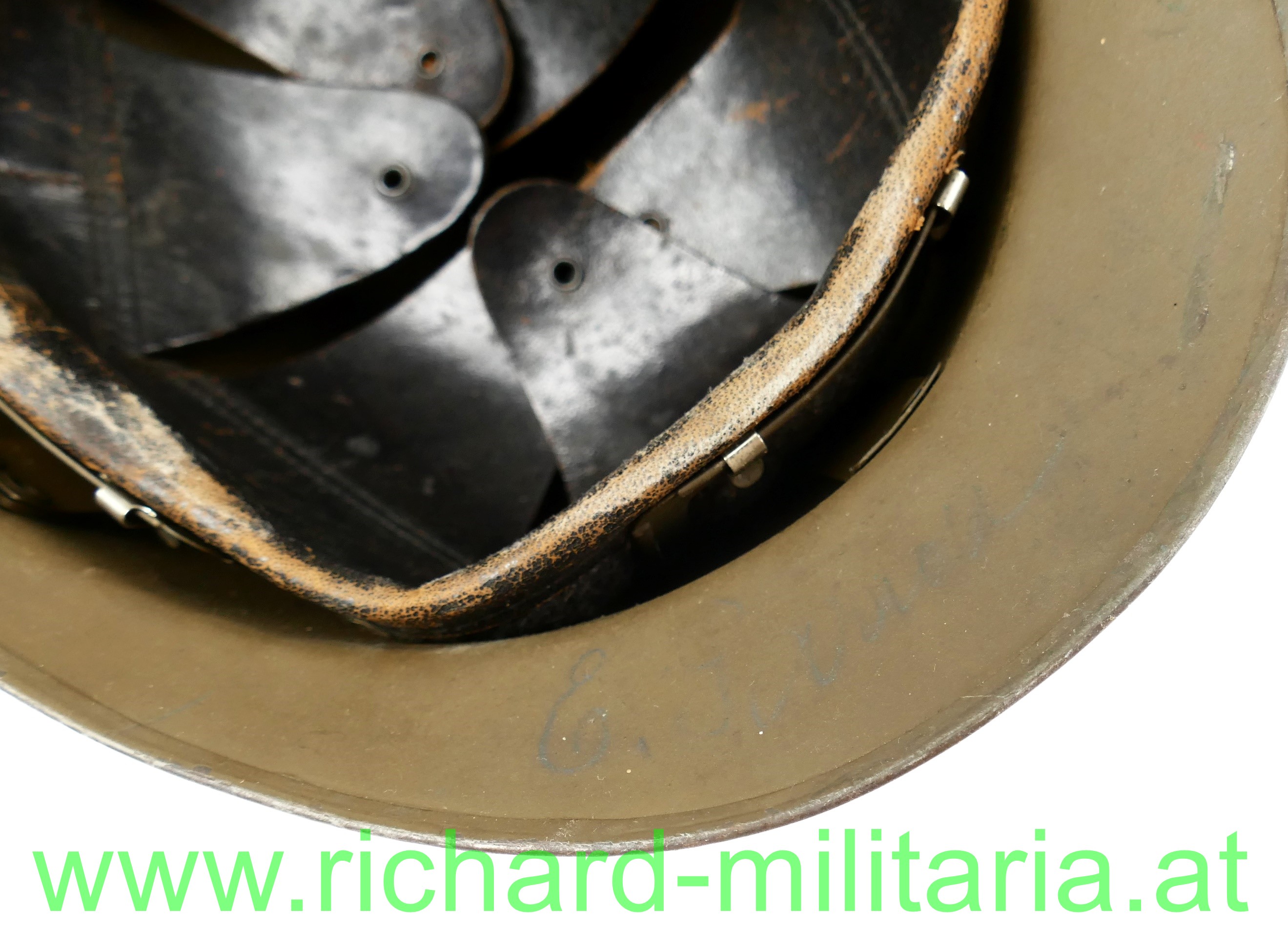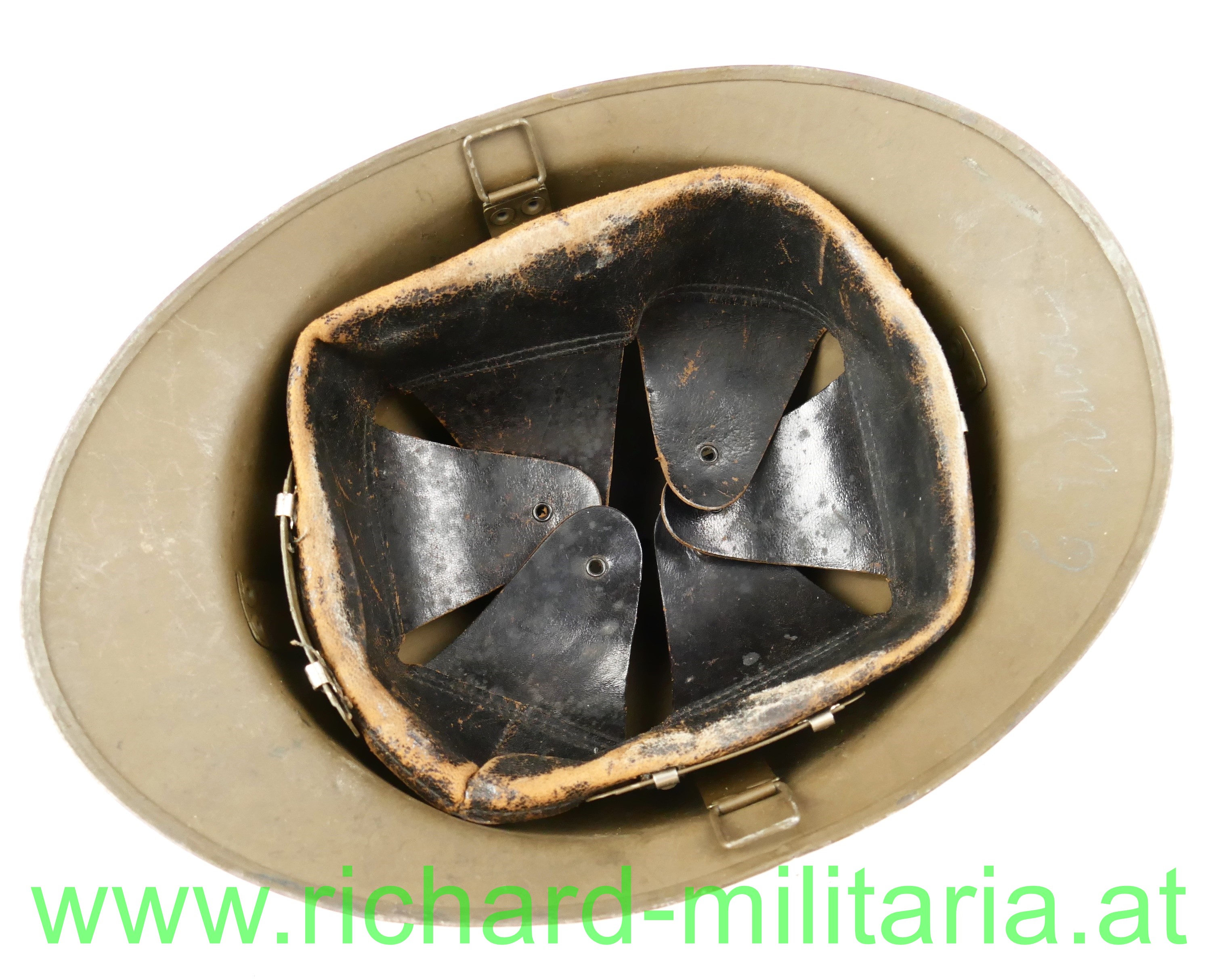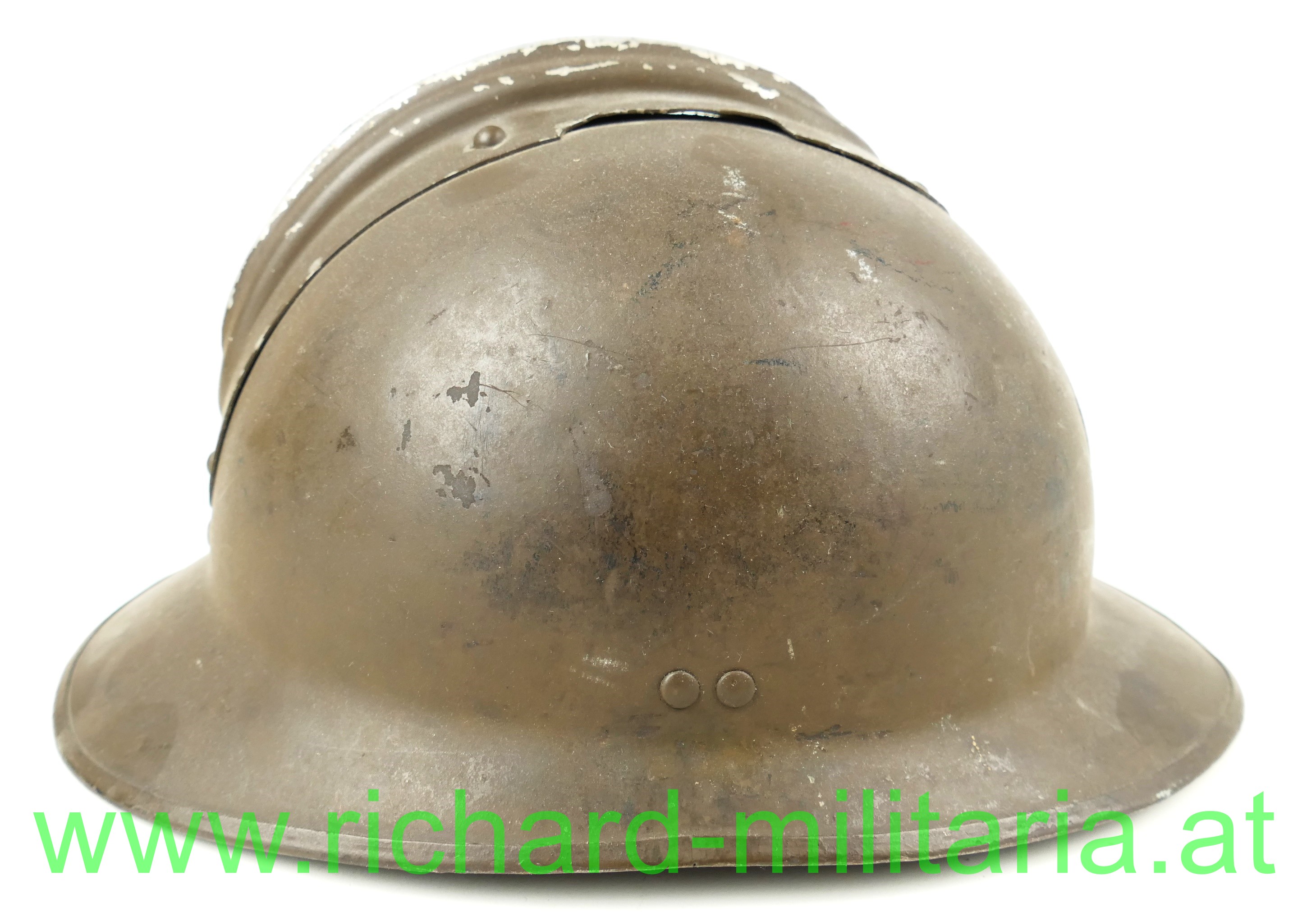 Adrianhelm - Frankreich - Pionier, originaler feldgrauer Anstrich; mit aufgenietetem Kamm und Emblem der Pioniere, mit originalem Innenhelm und Tintenstempel des Herstellers, Kinnriemen fehlt; mit Bleistift am Nacken beschriftet (schwer lesbar); 3 kleine Dellen