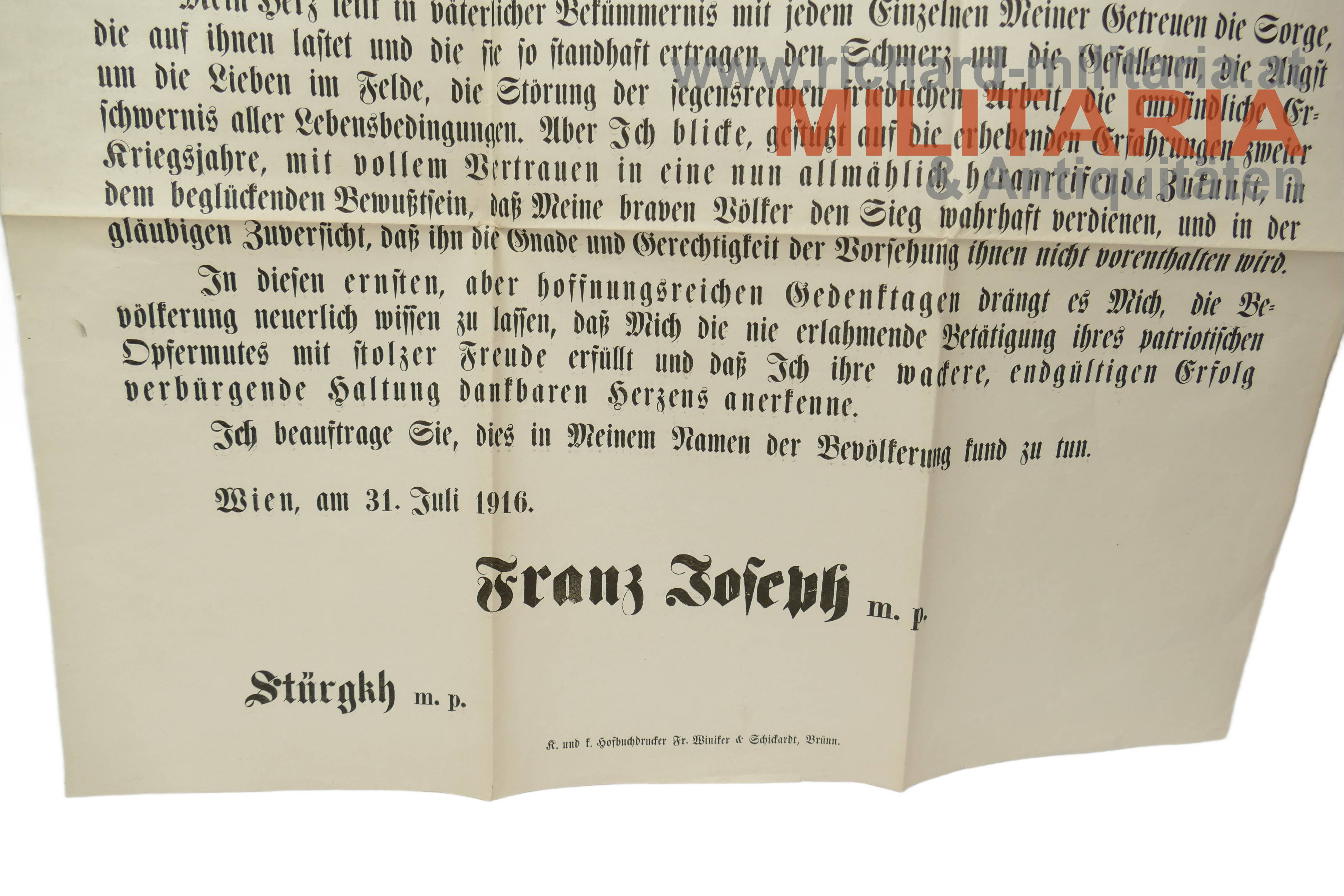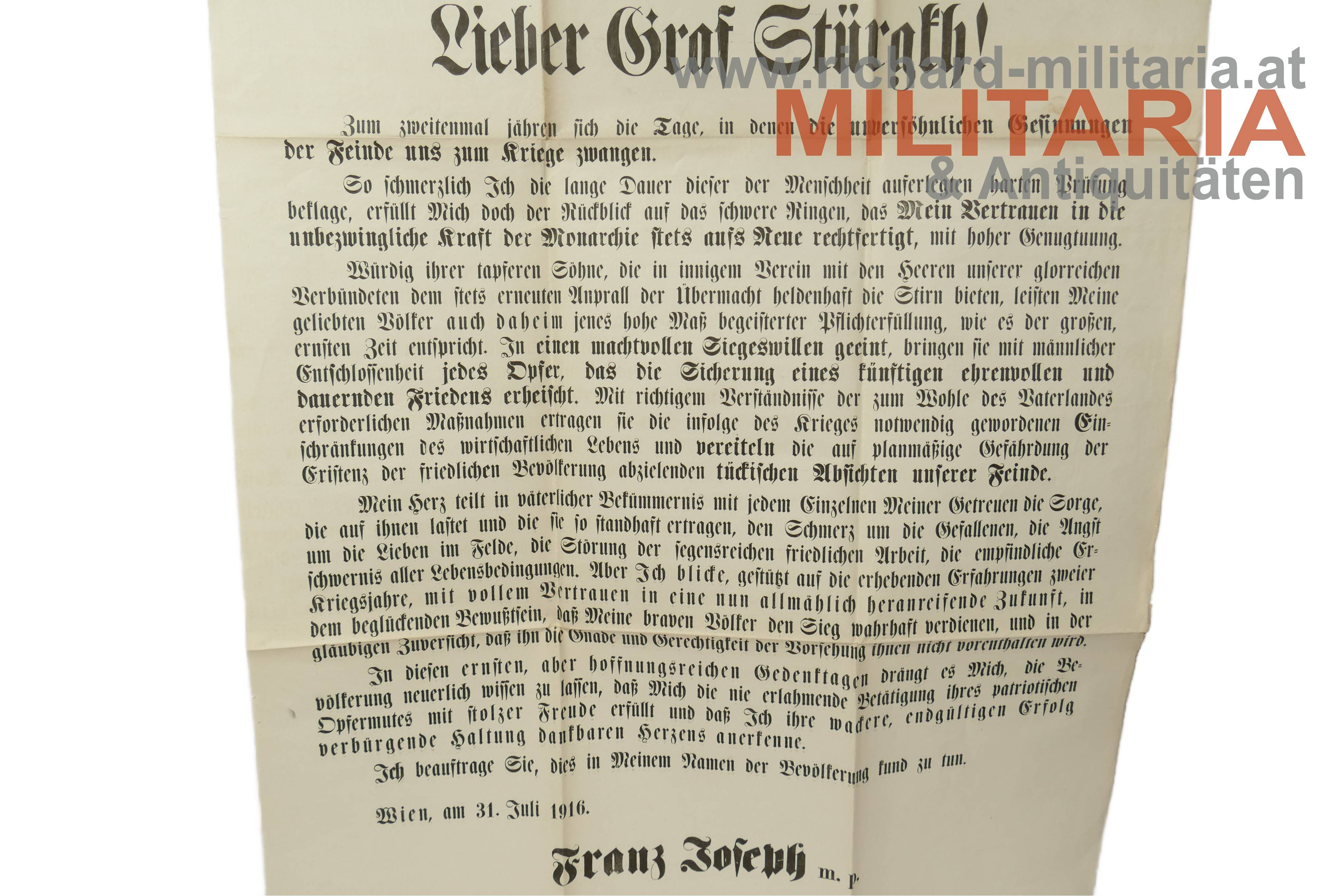 Allerhöchstes Handschreiben an den k.k. Ministerpräsidenten Karl Graf Stürgkh zur zweiten Jährung des Krieges; datiert auf 31. Juli 1916; gestempelt "Stadtgemeinde Göding 11. August 1916"; gelocht und gefaltet;
