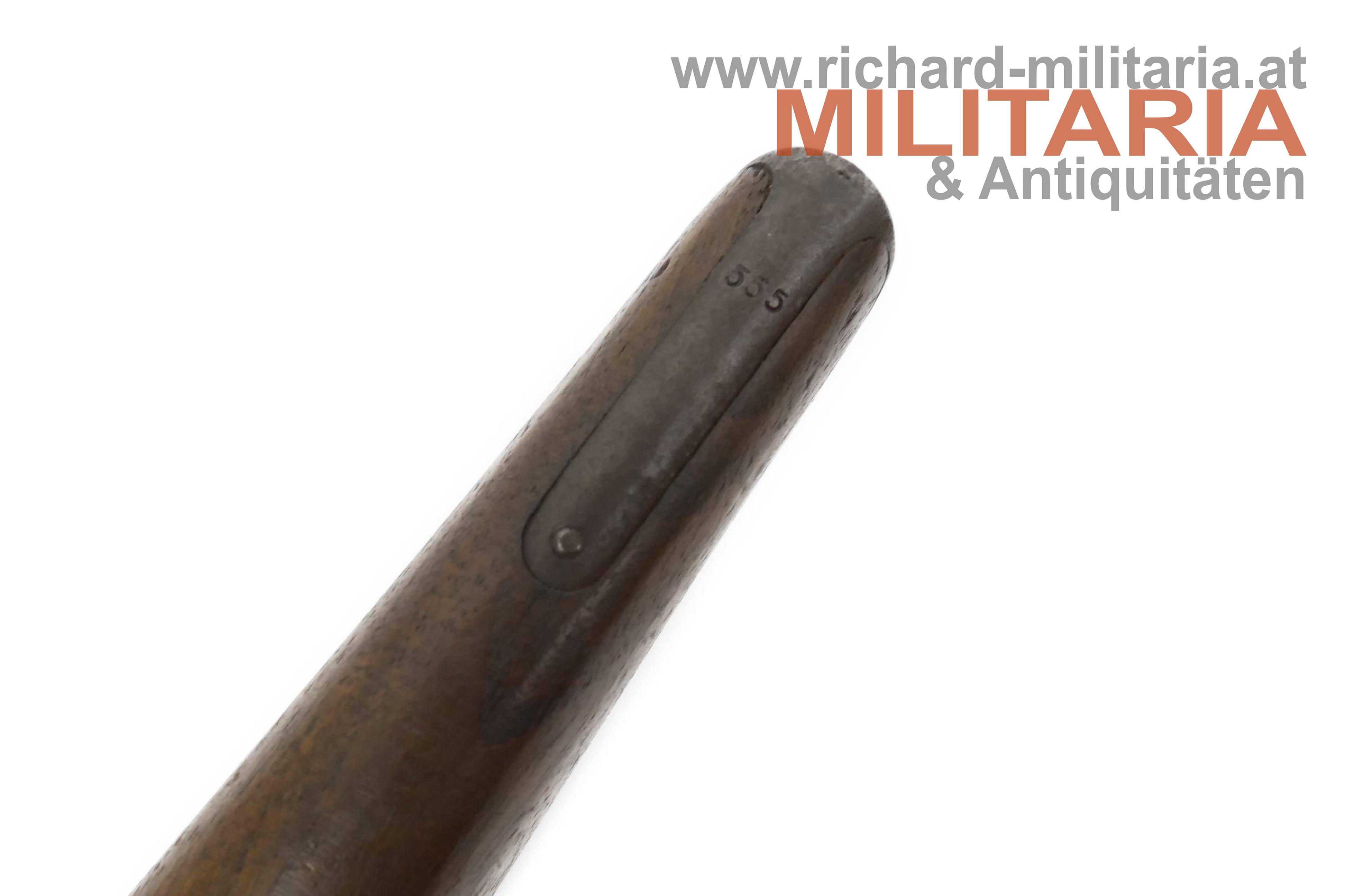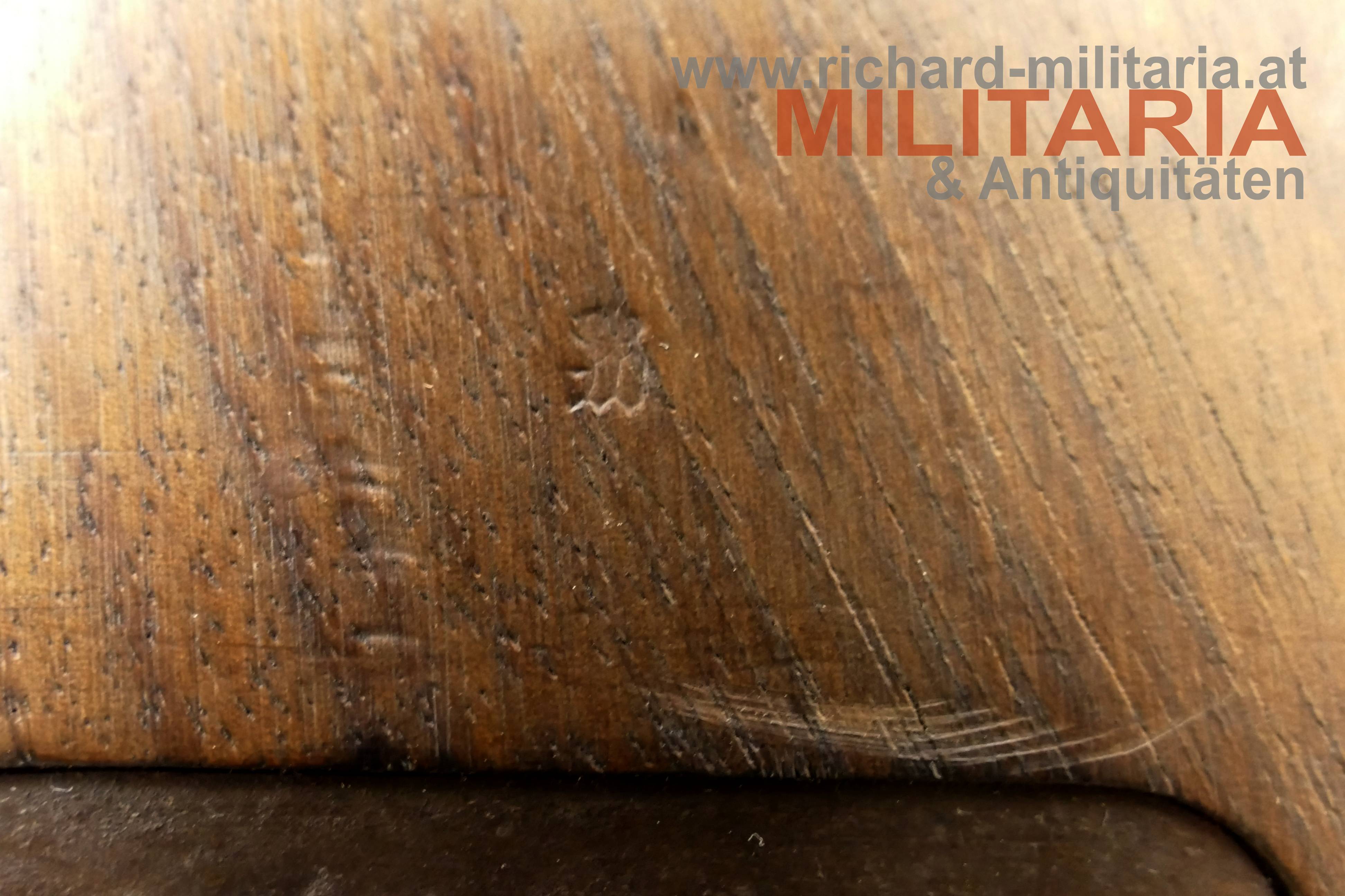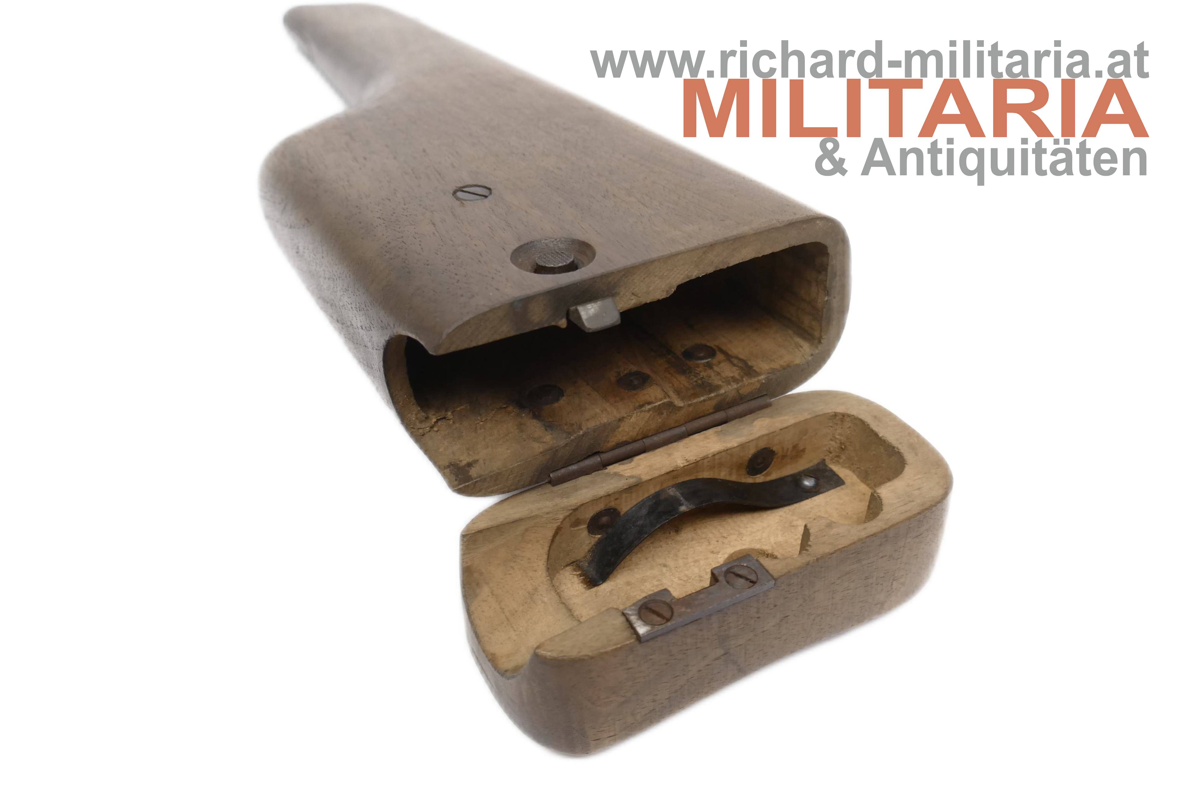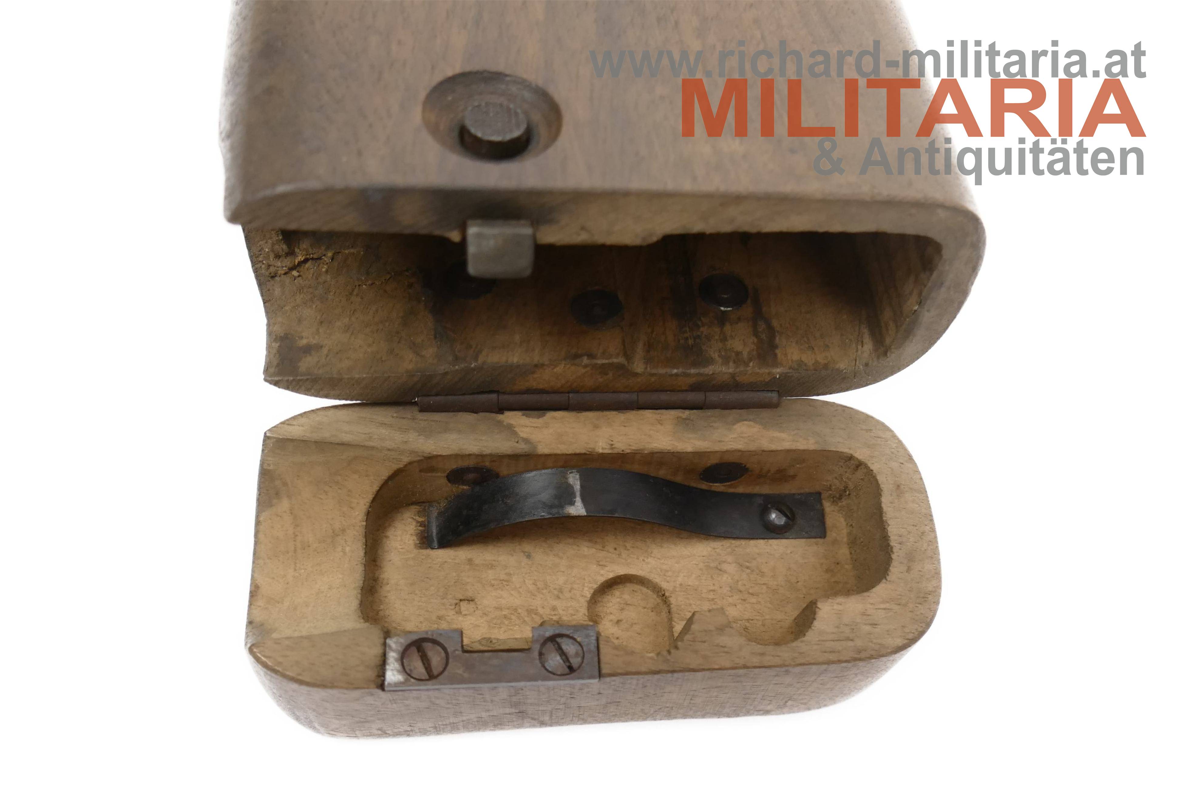 Anschlagkasten zur Mauser C96; aus Holz ohne Spannungsrisse (!); Druckknopf gängig - schließt einwandfrei; Seriennummer "555"; auf der Rückseite unter dem Schanier Abnahmestempel "W" mit Krone ins Holz geschlagen;