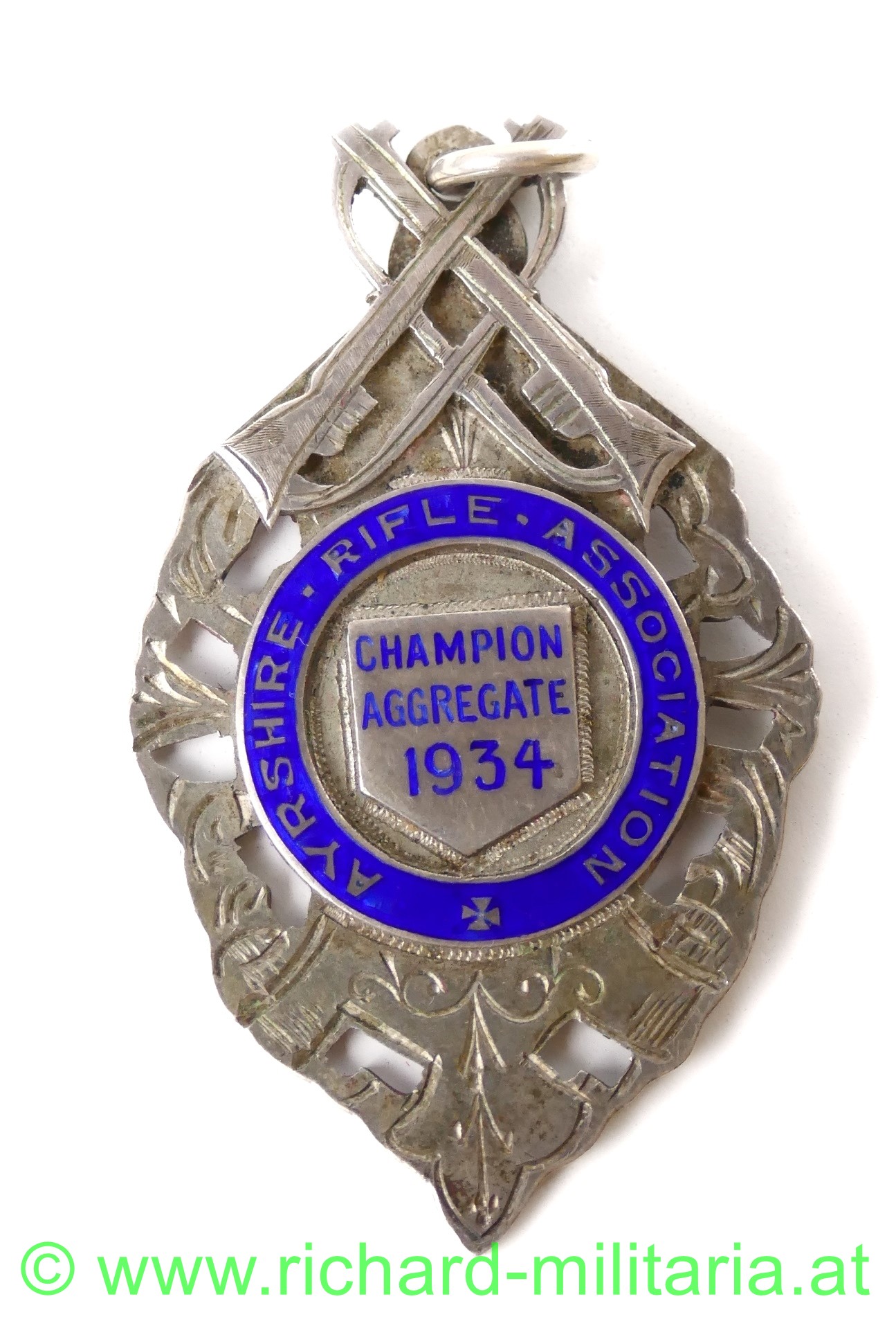 Ayrshire Rifle Association 1934 Champion Aggregate, Silber, mit Öse, teilweise emailliert, Höhe 52mm,