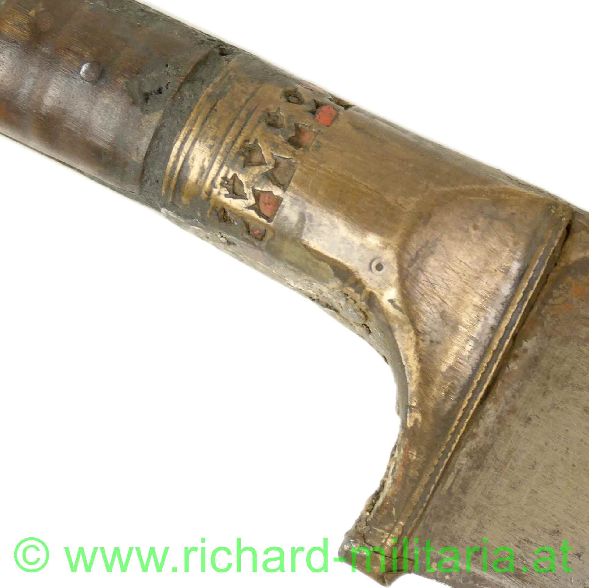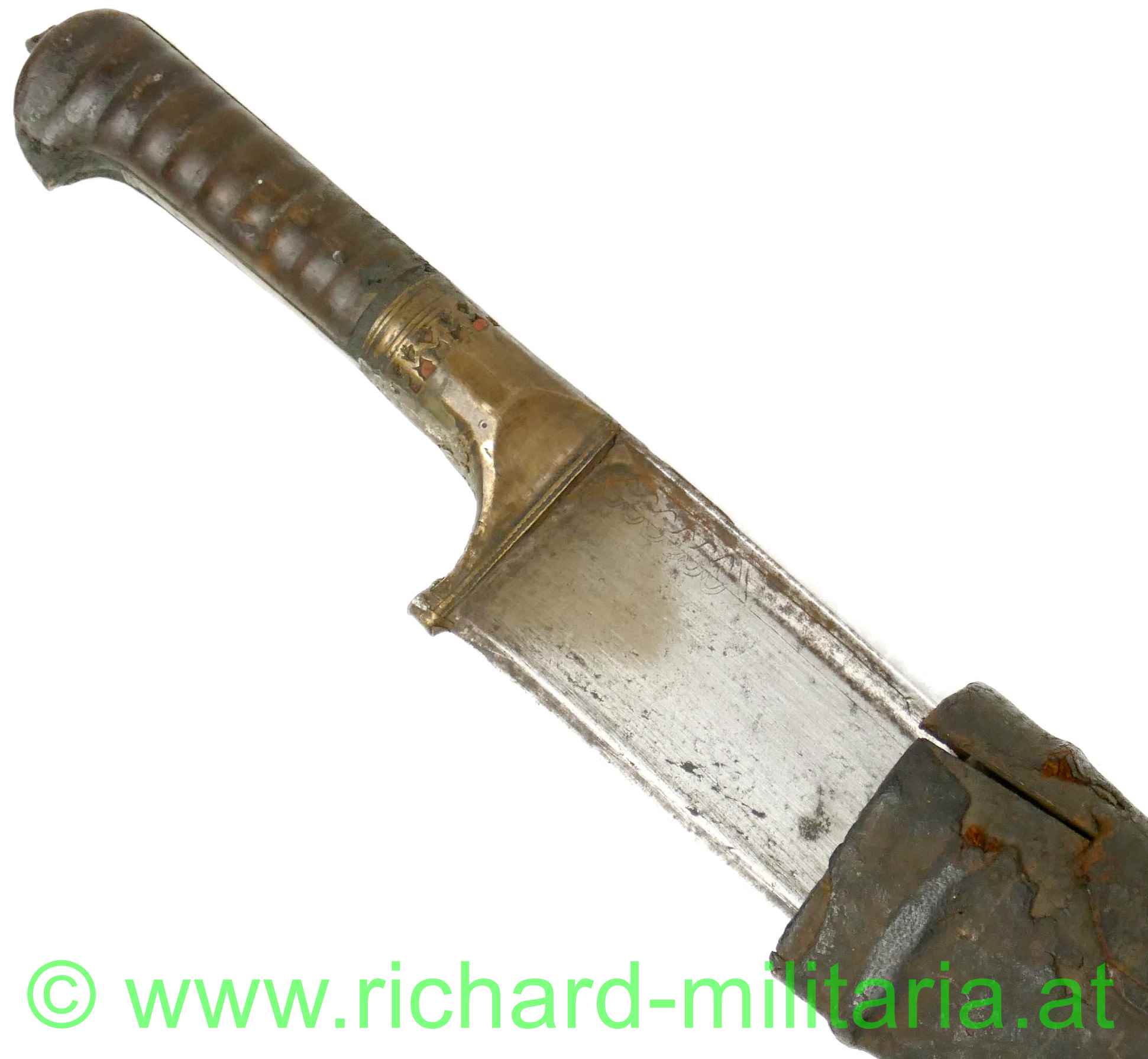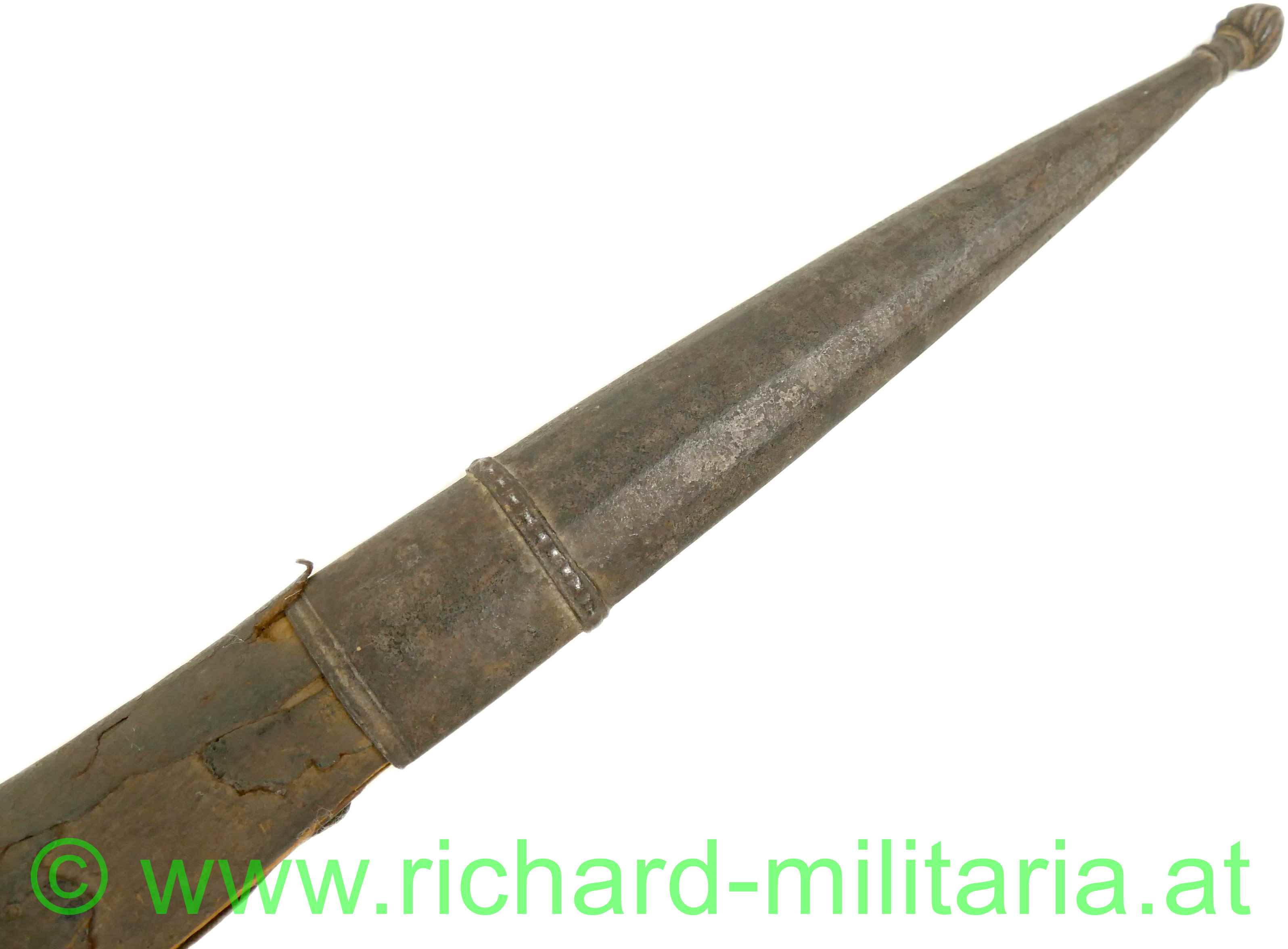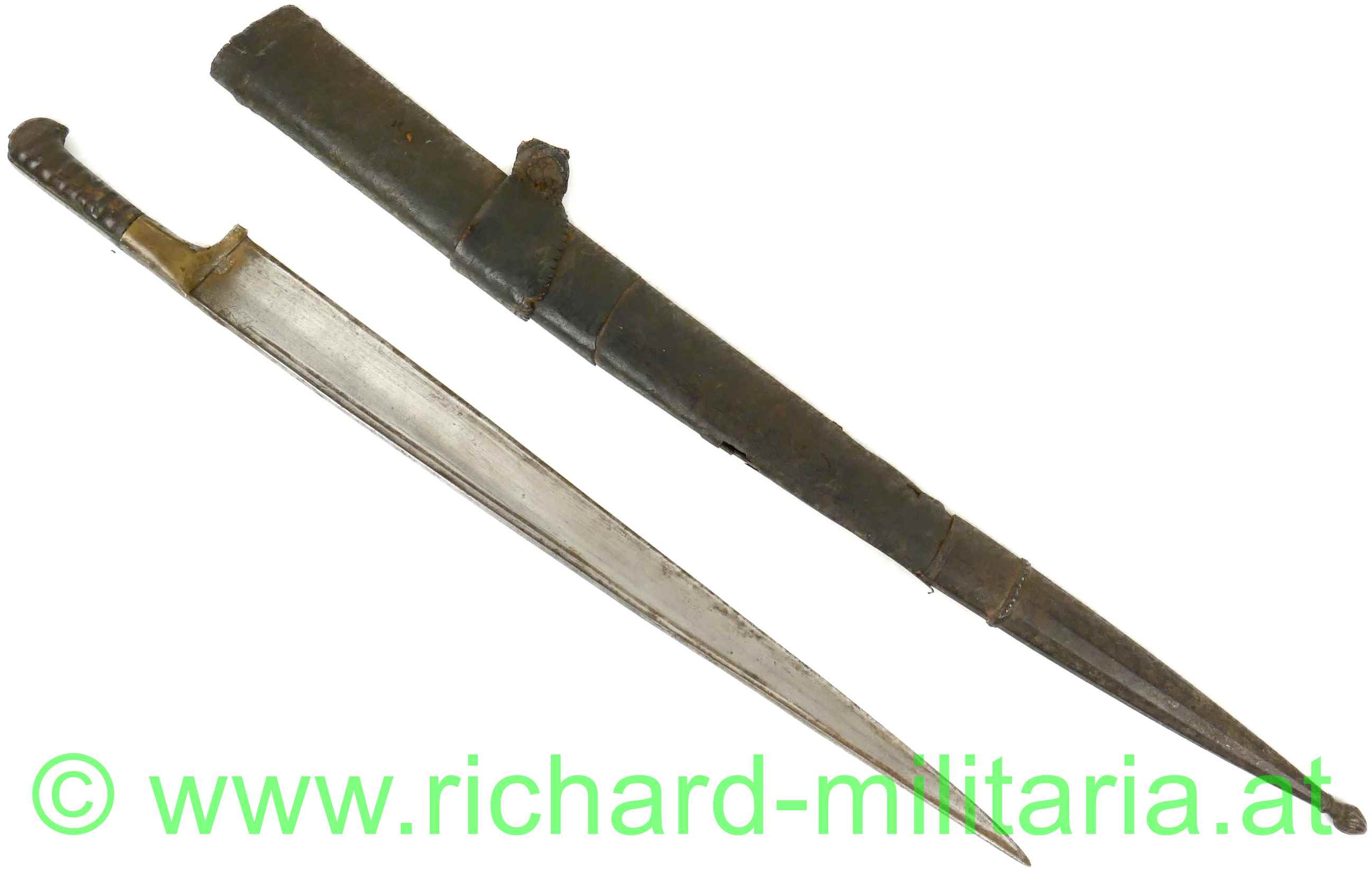 Balkan / Osmanien - Schwert (um 1800); gerippter Holzgriff mit Messingverzierungen; auf einer Seite in die Verzierungen eingesetzte Korallenstücke; sehr massive in gerader Linie spitz zulaufende Klinge; außergewöhnlicher Klingenquerschnitt mit sehr breitem Klingenrücken und direkt darunter liegender Hohlkehle; sehr scharfe Klinge (!); am Kingenrücken-Ansatz beidseitige Verzierungsgravuren; Oxidationen am Griff (Messing); dazu eine massive, belederte Holzscheide in gleicher Keilform; große Abschlusskappe aus Eisen (angerostet) mit verziertem Abschluss-Knopf und Längsrillen sowie Querbänder-Verzierung; aus dickem Leder gefertigte Trageschlaufe (Halterungsriemen fehlt); an der Scheide fehlt das Mundblech.