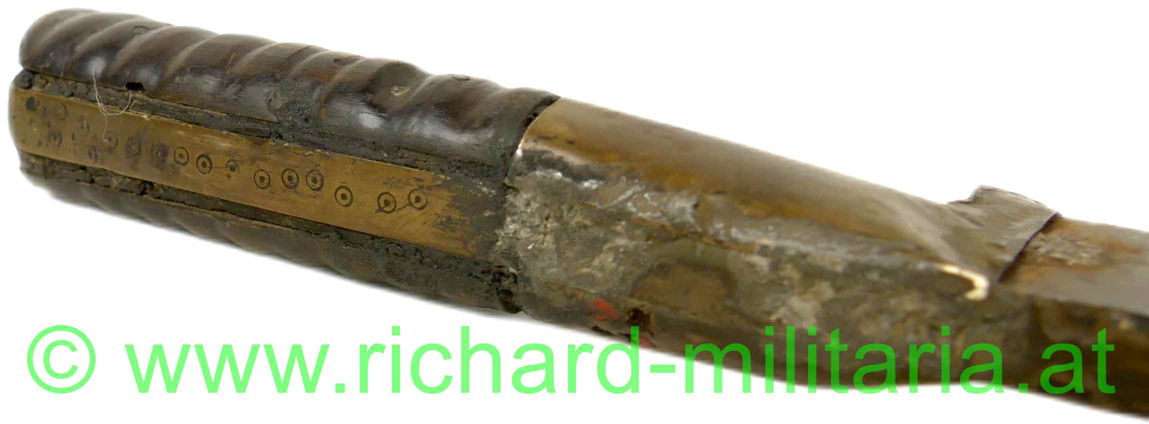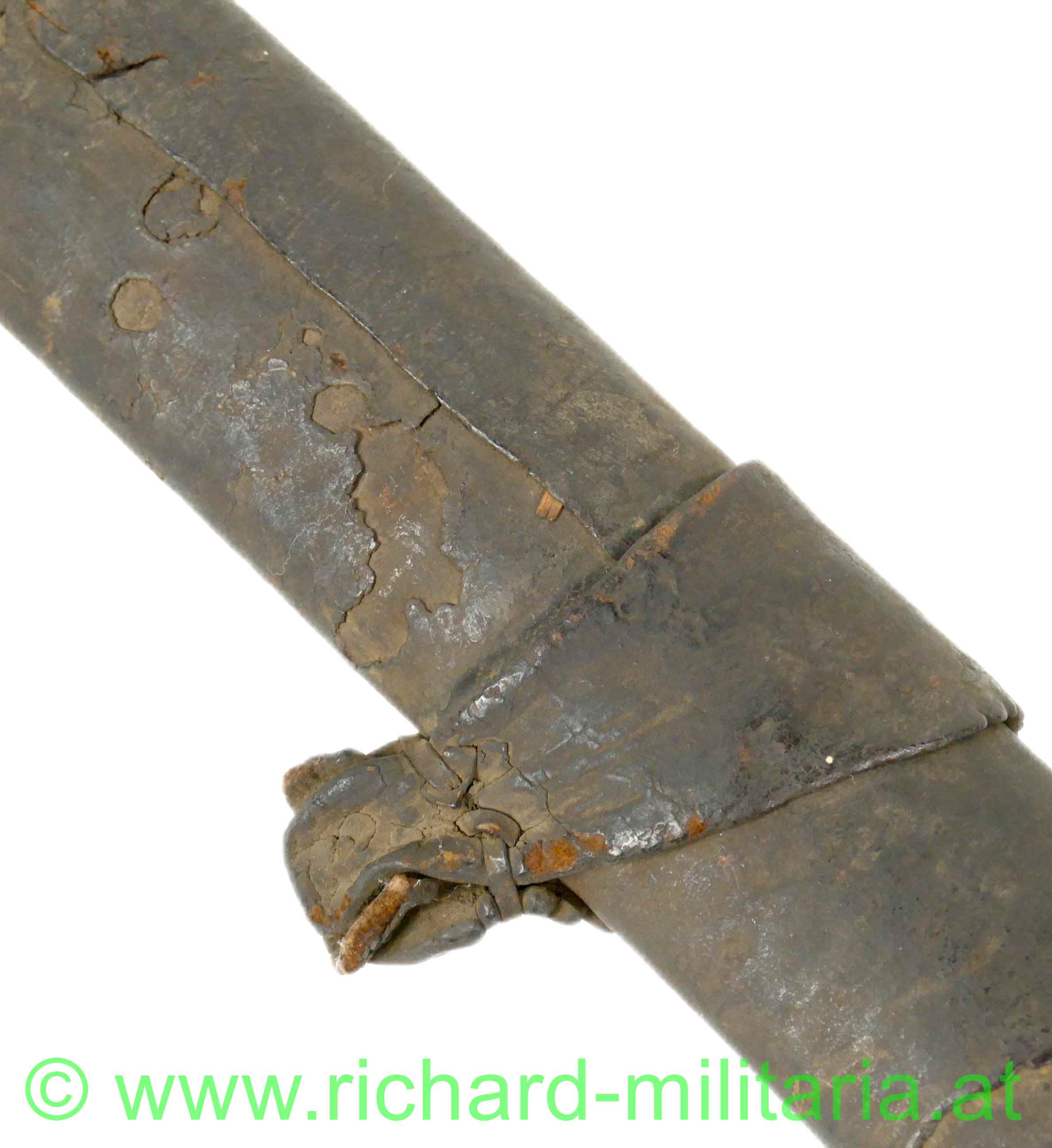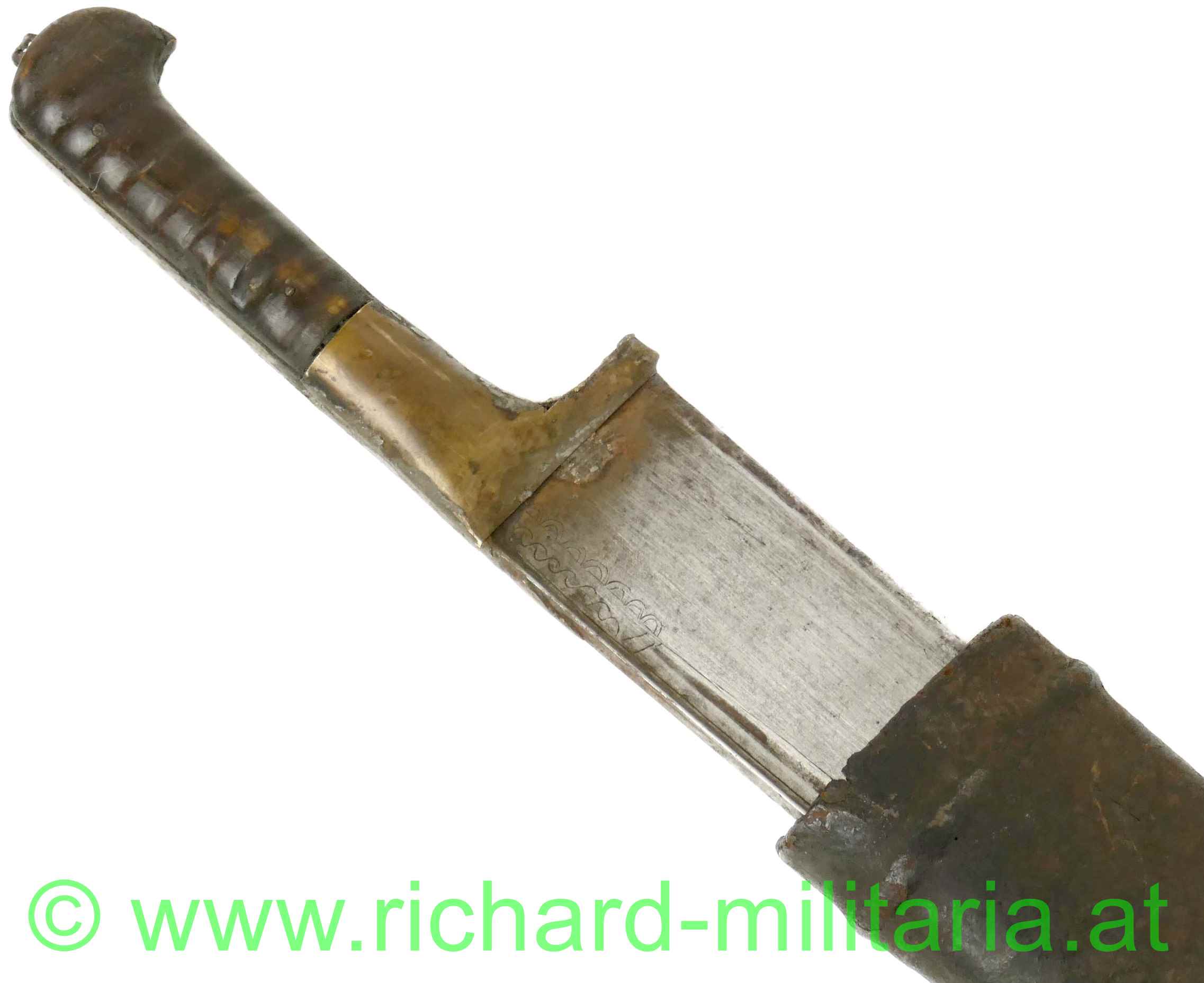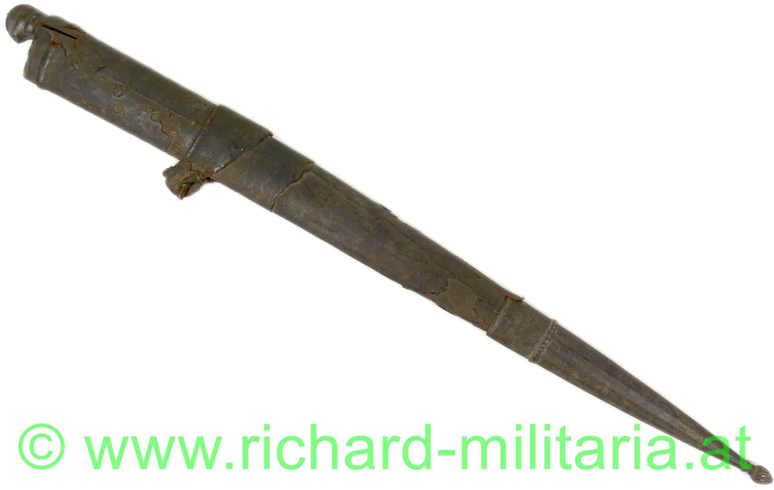 Balkan / Osmanien - Schwert (um 1800); gerippter Holzgriff mit Messingverzierungen; auf einer Seite in die Verzierungen eingesetzte Korallenstücke; sehr massive in gerader Linie spitz zulaufende Klinge; außergewöhnlicher Klingenquerschnitt mit sehr breitem Klingenrücken und direkt darunter liegender Hohlkehle; sehr scharfe Klinge (!); am Kingenrücken-Ansatz beidseitige Verzierungsgravuren; Oxidationen am Griff (Messing); dazu eine massive, belederte Holzscheide in gleicher Keilform; große Abschlusskappe aus Eisen (angerostet) mit verziertem Abschluss-Knopf und Längsrillen sowie Querbänder-Verzierung; aus dickem Leder gefertigte Trageschlaufe (Halterungsriemen fehlt); an der Scheide fehlt das Mundblech.