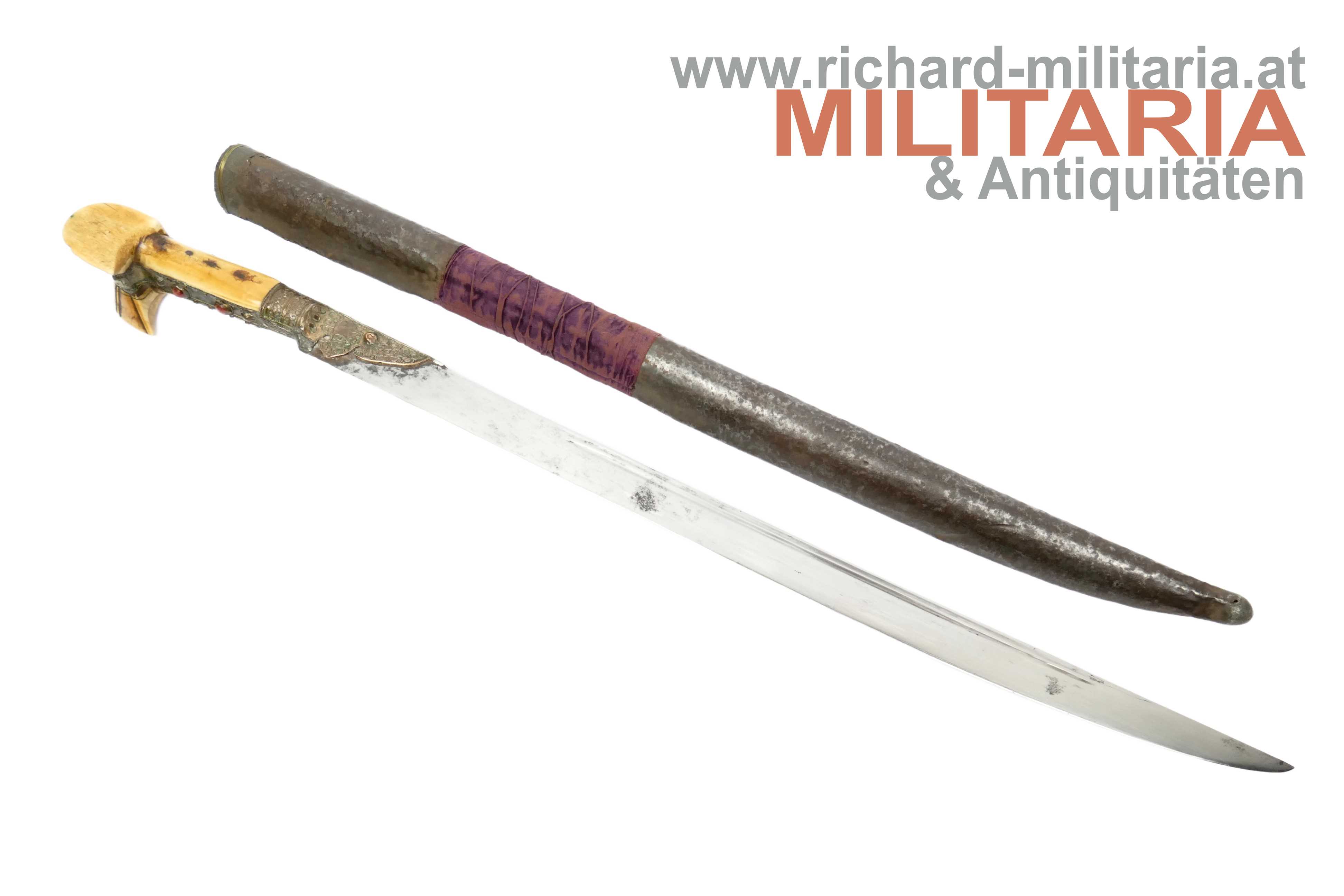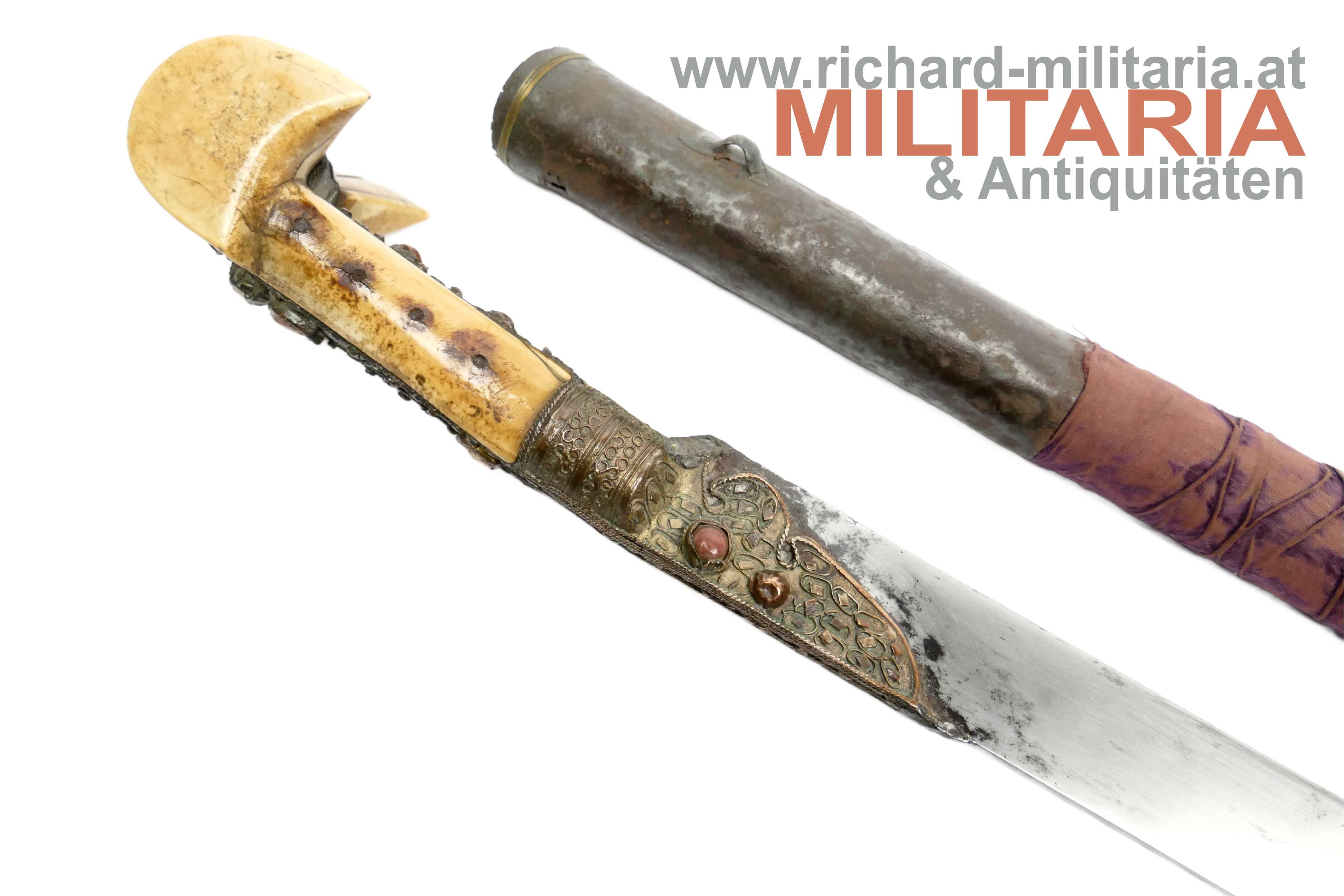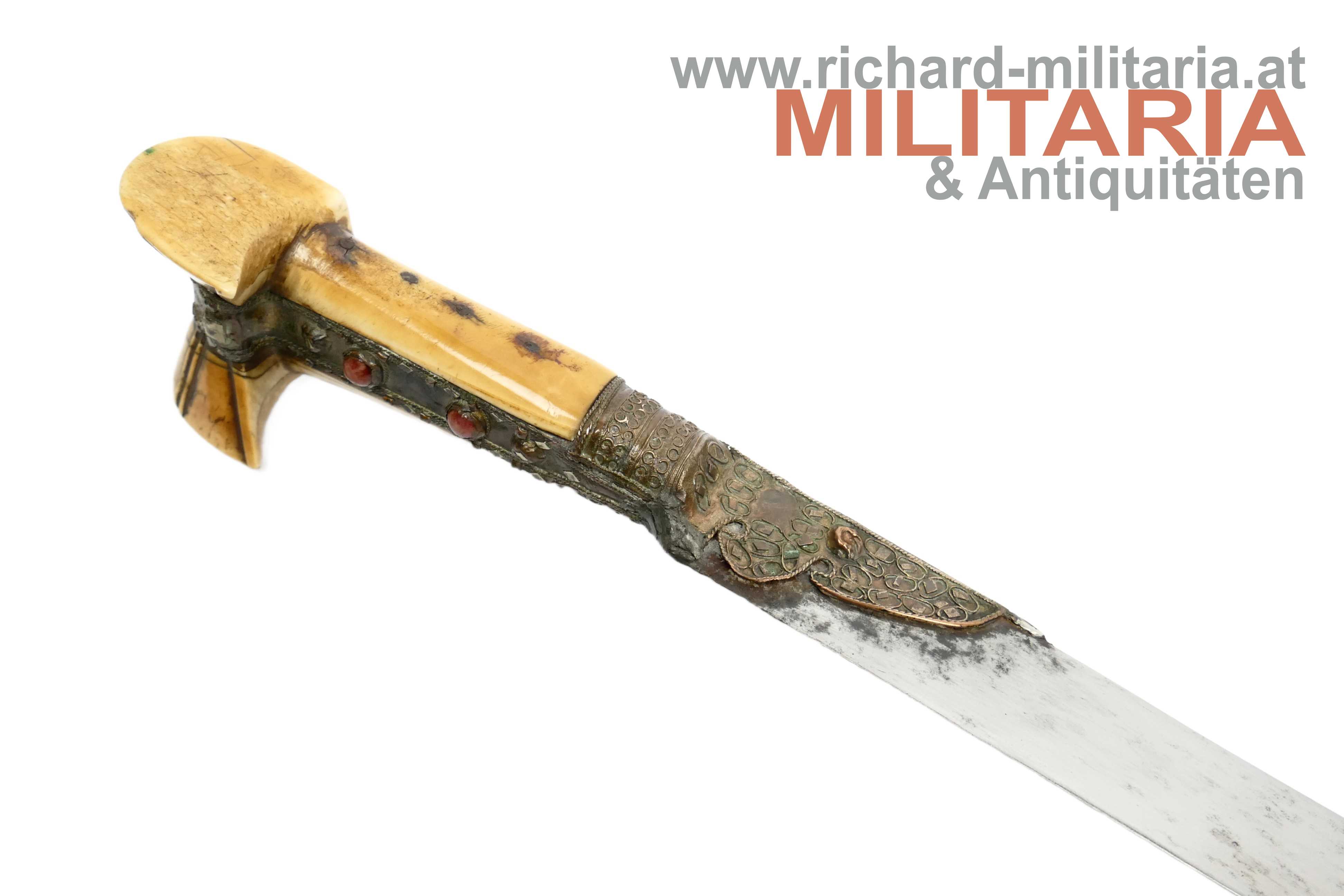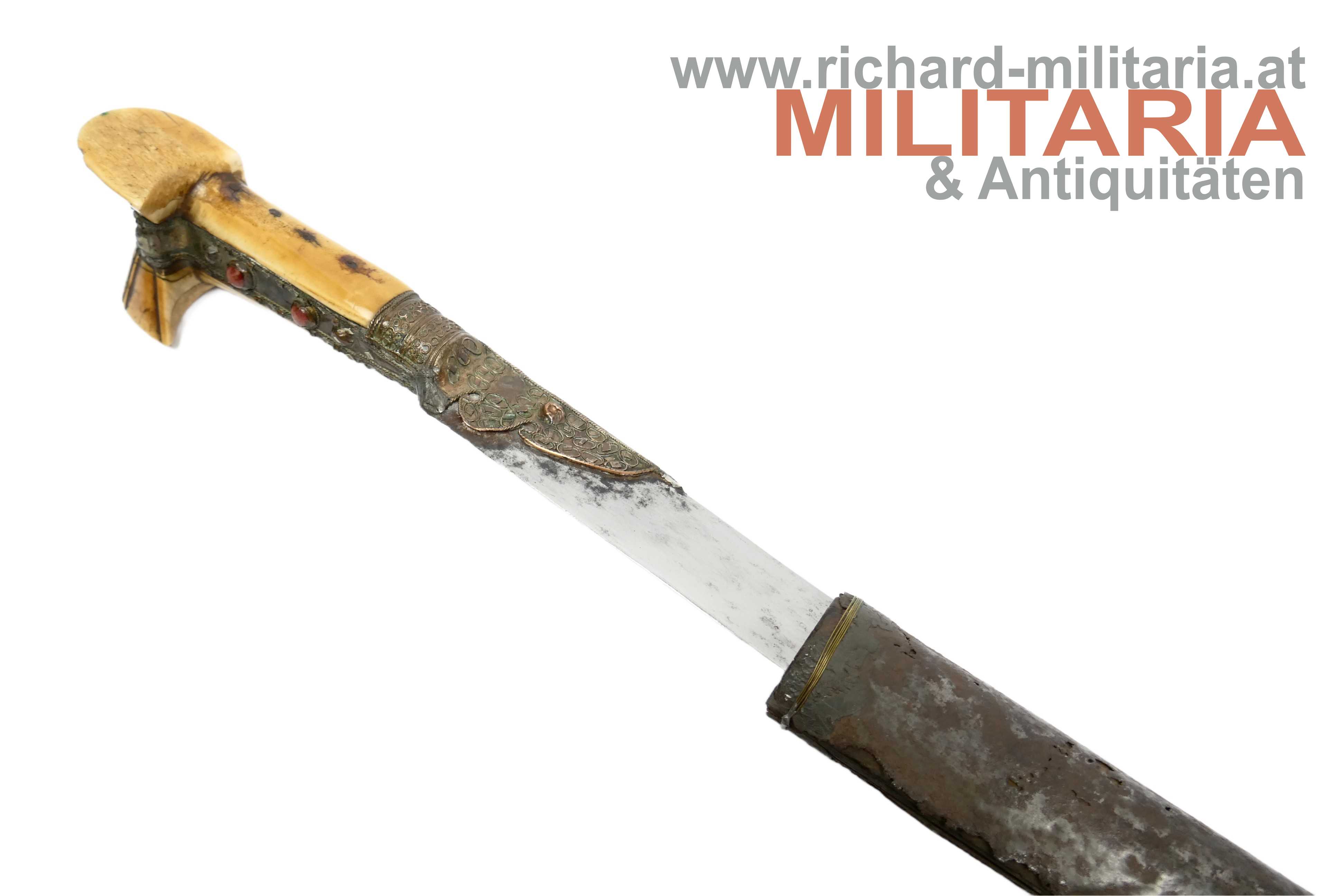 Balkan/Türkei - Jatagan; leicht fleckige vernickelte Rückenklinge in einem für einen Jatagan hervorragendem Zustand; im Rückenbereich beidseitig schmal gekehlt; Klingen- und Griffeinfassung aus Gelbmetall; Metall im Griffbereich auf Ober- und Unterseite mit roten Steinen besetzt; auf der Oberseite fehlt ein Stein; auf der Griffeinfassung ursprünglich beidseitig jeweils ein roter Zierstein; auf der rechten Seite fehlt dieser; genagelter Beingriff im typischen "Ohrenschliff"; dieser im Ohrenbereich mit dezenten Ziergravuren; Holzscheide mit einer dünnen Eisenschicht überzogen; mittig auf der Scheide ein weinroter Samtüberzug; am oberen Ende mit einer dünnen Golddrahtwicklung; der Eisenüberzug im Bereich oberhalb des Samtes etwas löchrig; auf der linken Seite der Scheide ein angelöteter Tragehaken;
