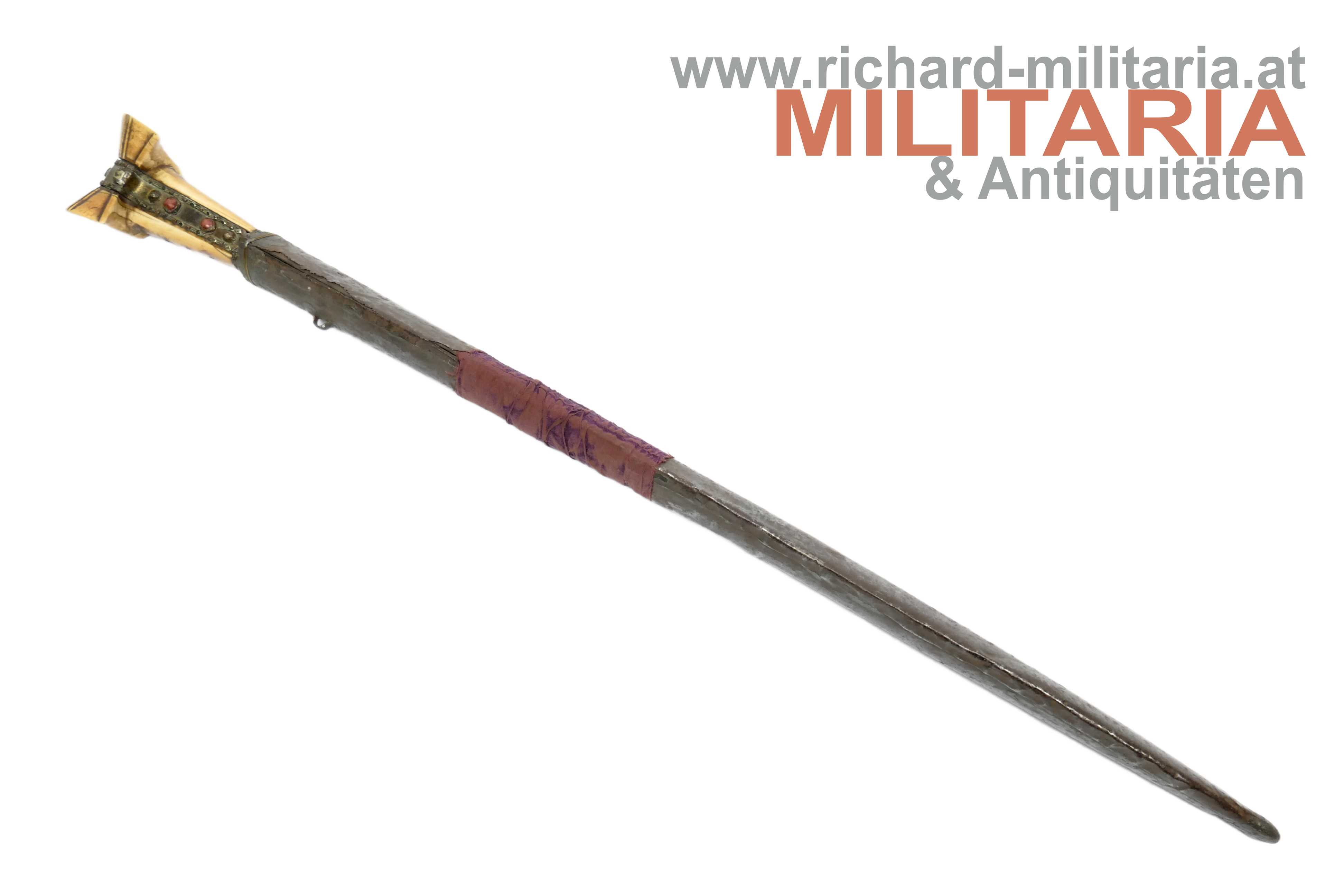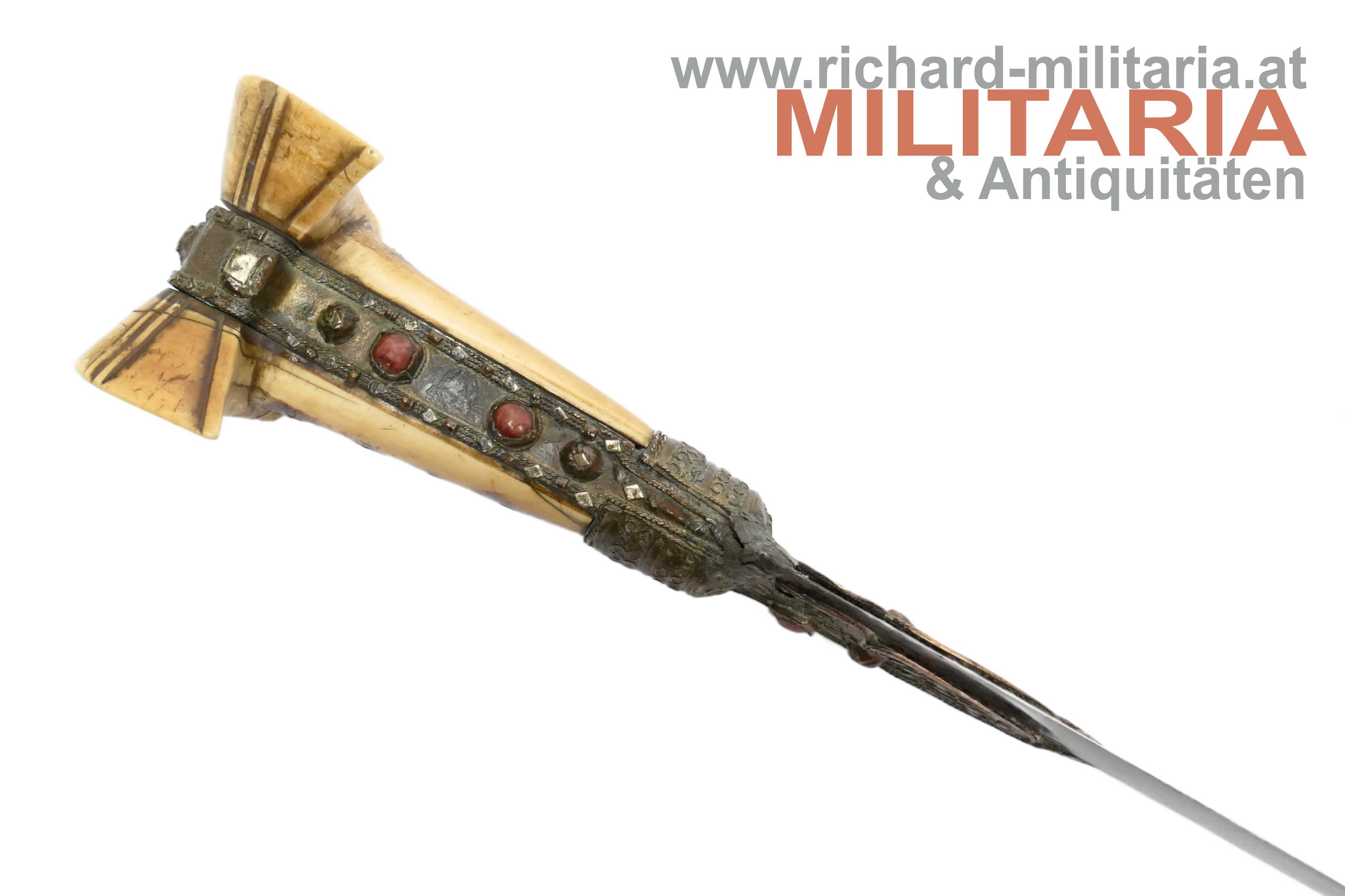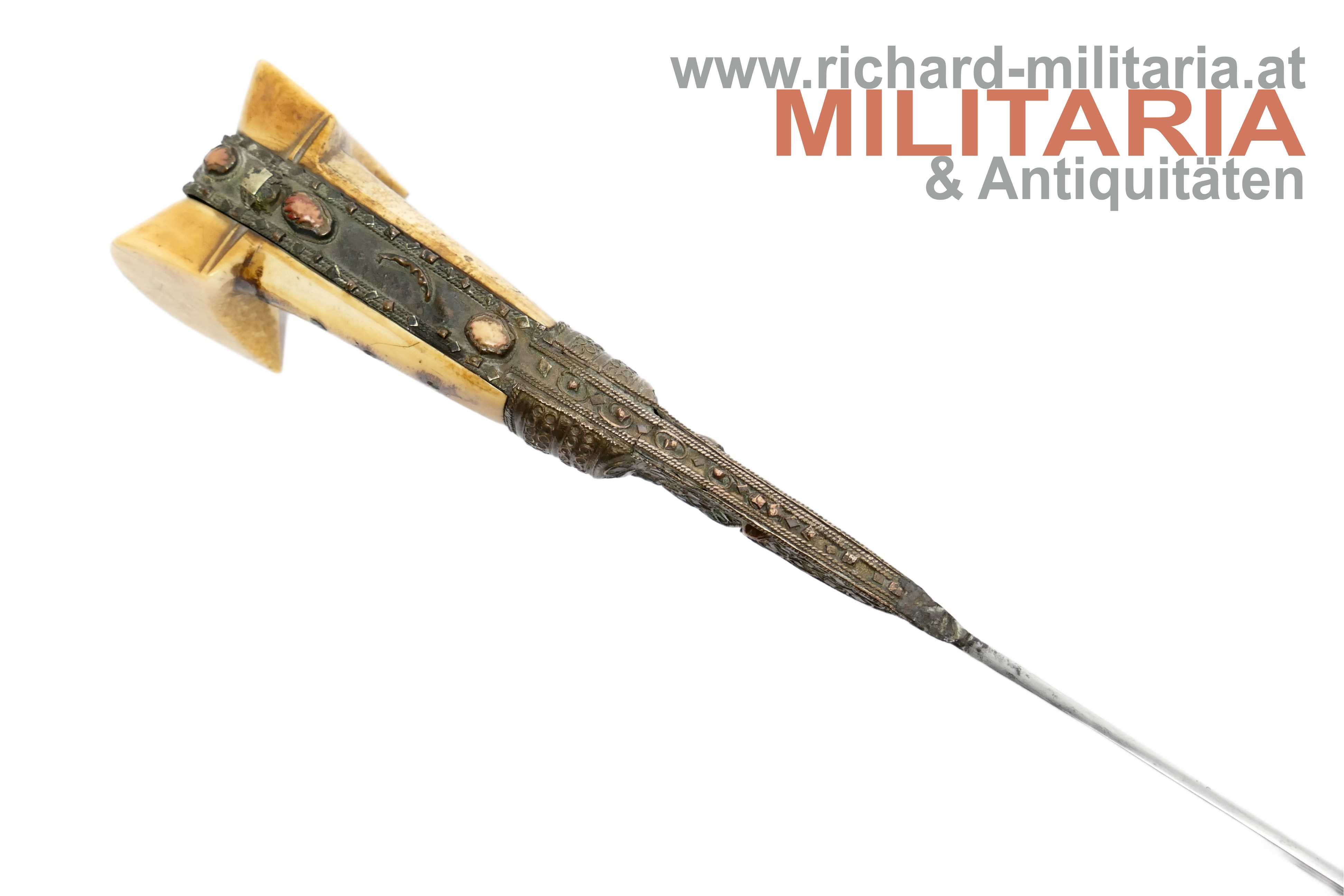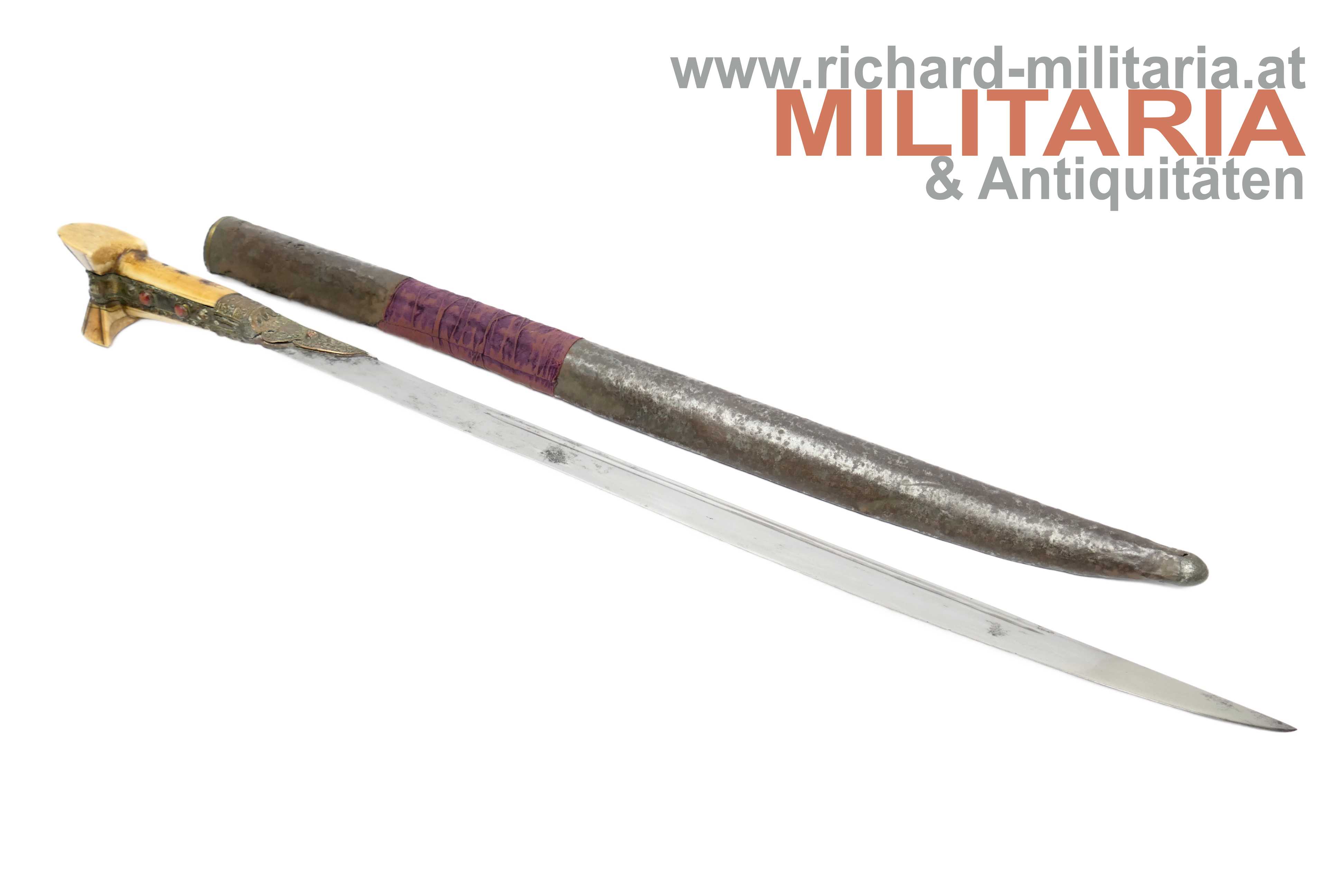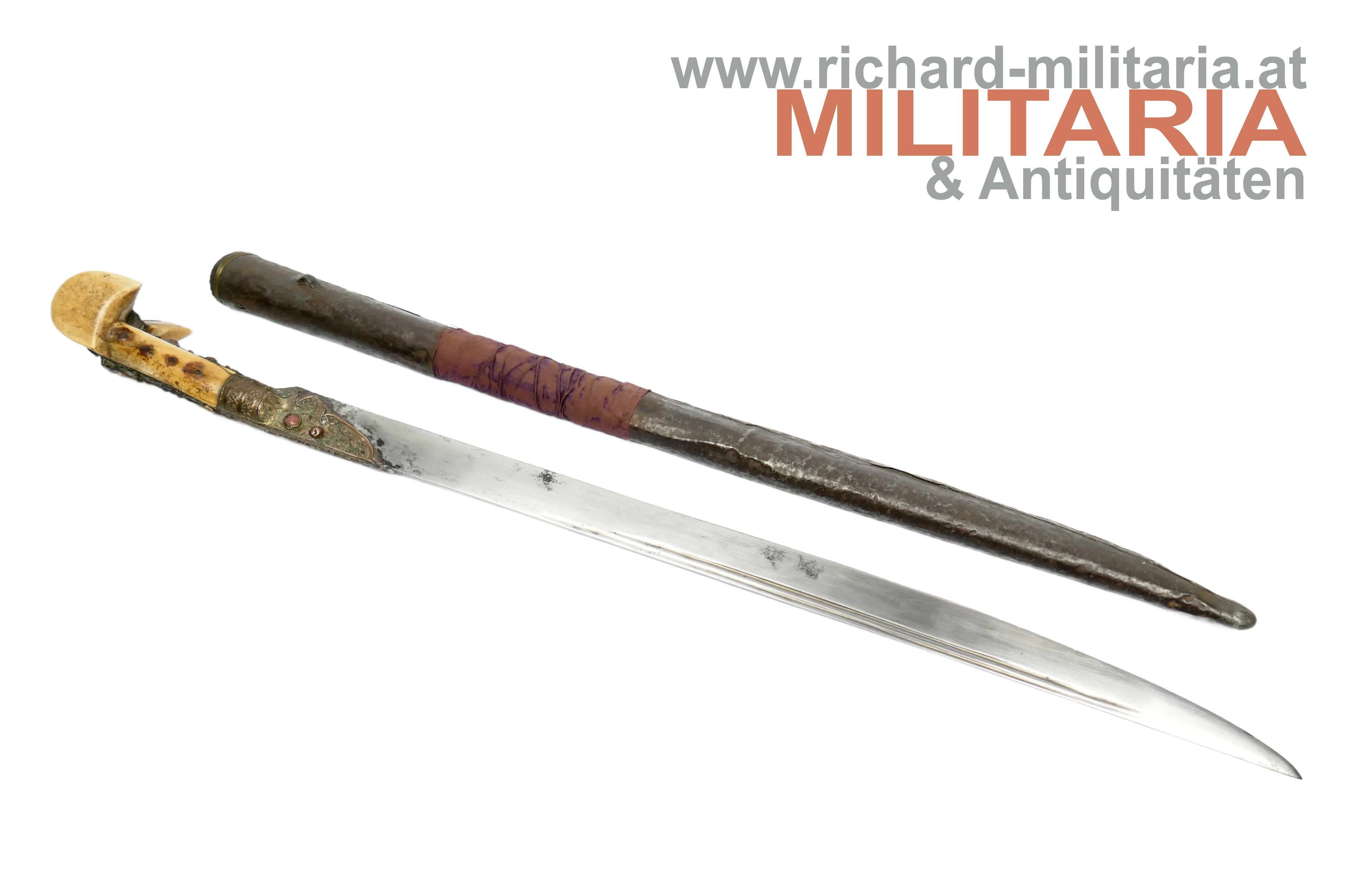 Balkan/Türkei - Jatagan; leicht fleckige vernickelte Rückenklinge in einem für einen Jatagan hervorragendem Zustand; im Rückenbereich beidseitig schmal gekehlt; Klingen- und Griffeinfassung aus Gelbmetall; Metall im Griffbereich auf Ober- und Unterseite mit roten Steinen besetzt; auf der Oberseite fehlt ein Stein; auf der Griffeinfassung ursprünglich beidseitig jeweils ein roter Zierstein; auf der rechten Seite fehlt dieser; genagelter Beingriff im typischen "Ohrenschliff"; dieser im Ohrenbereich mit dezenten Ziergravuren; Holzscheide mit einer dünnen Eisenschicht überzogen; mittig auf der Scheide ein weinroter Samtüberzug; am oberen Ende mit einer dünnen Golddrahtwicklung; der Eisenüberzug im Bereich oberhalb des Samtes etwas löchrig; auf der linken Seite der Scheide ein angelöteter Tragehaken;