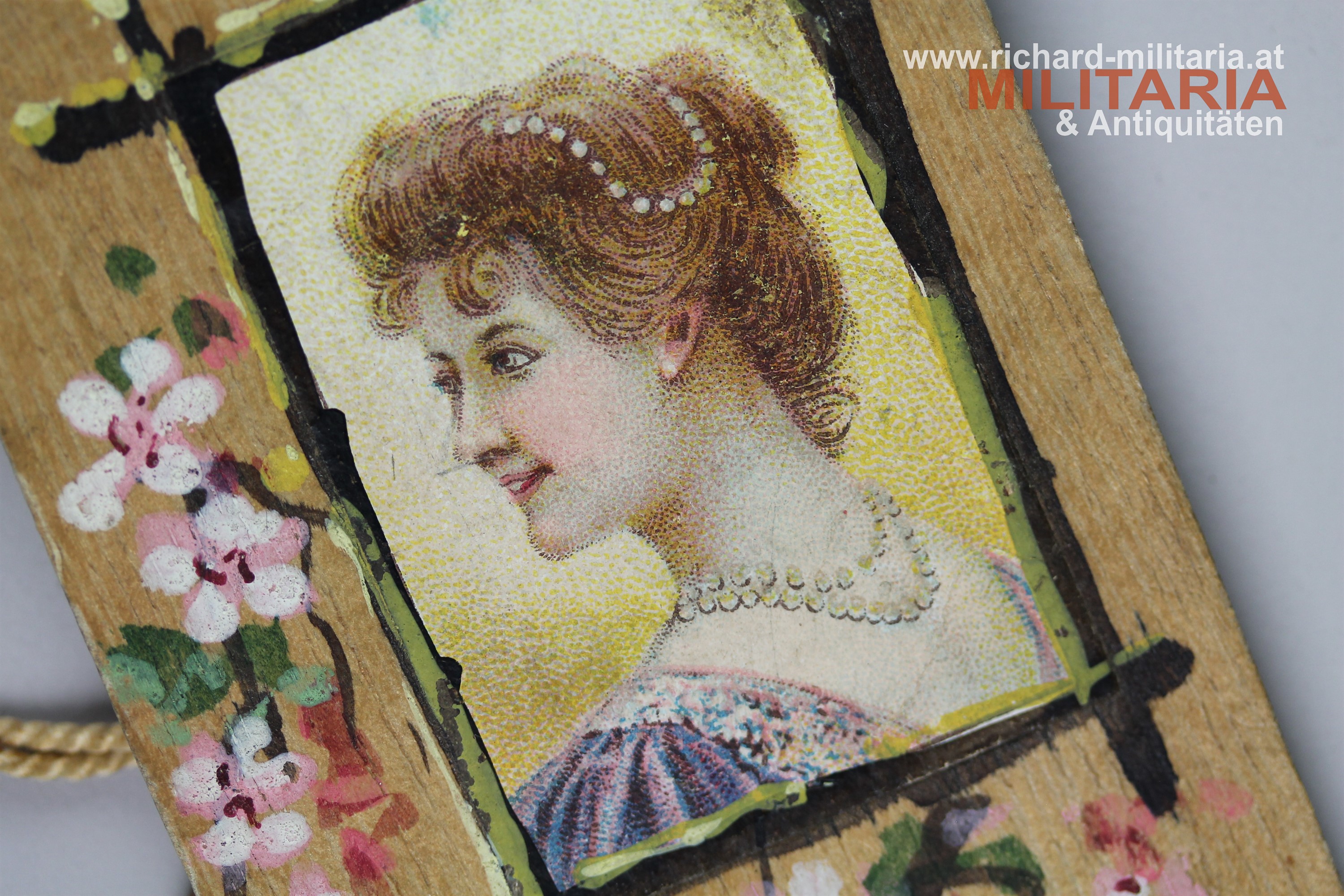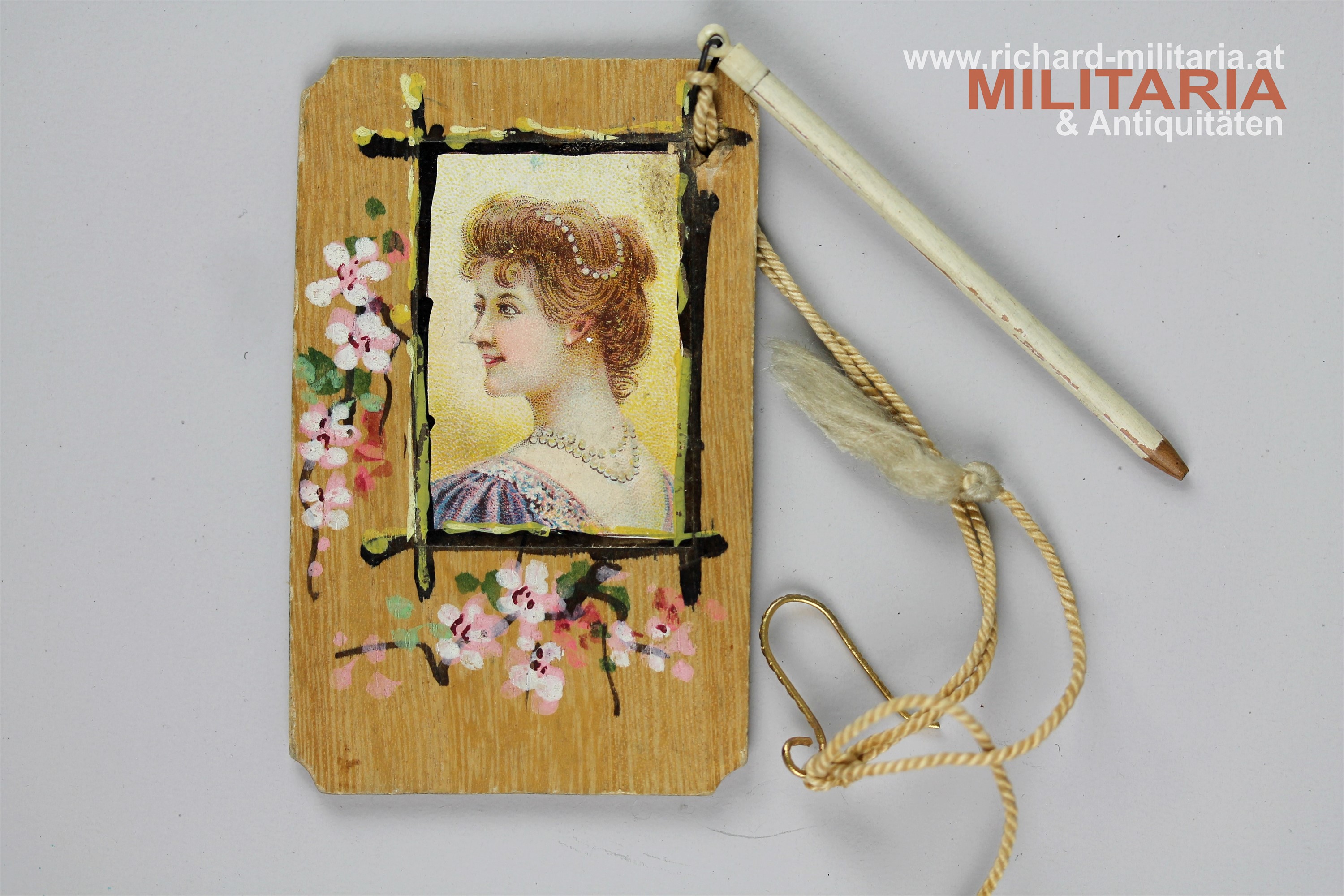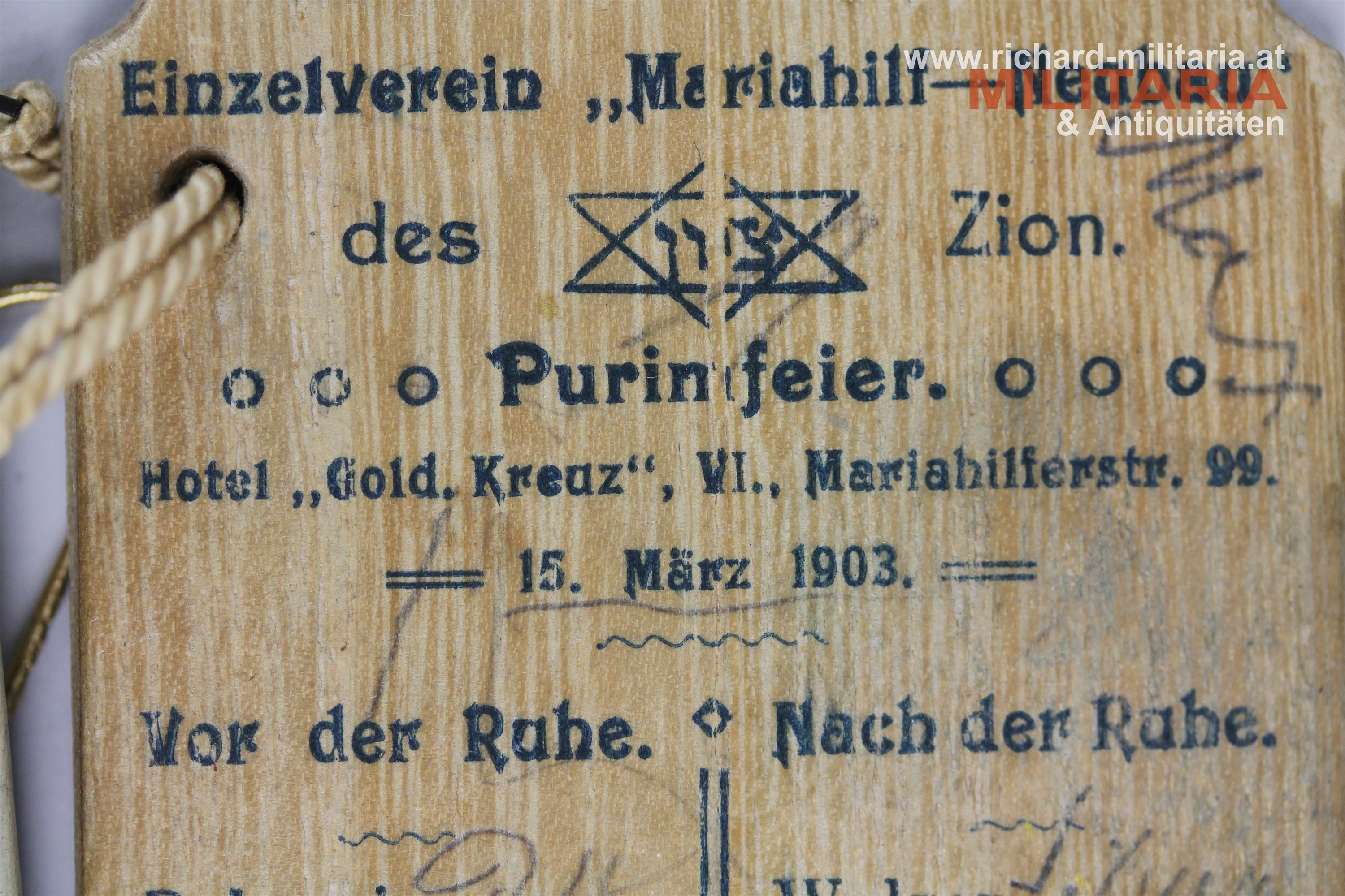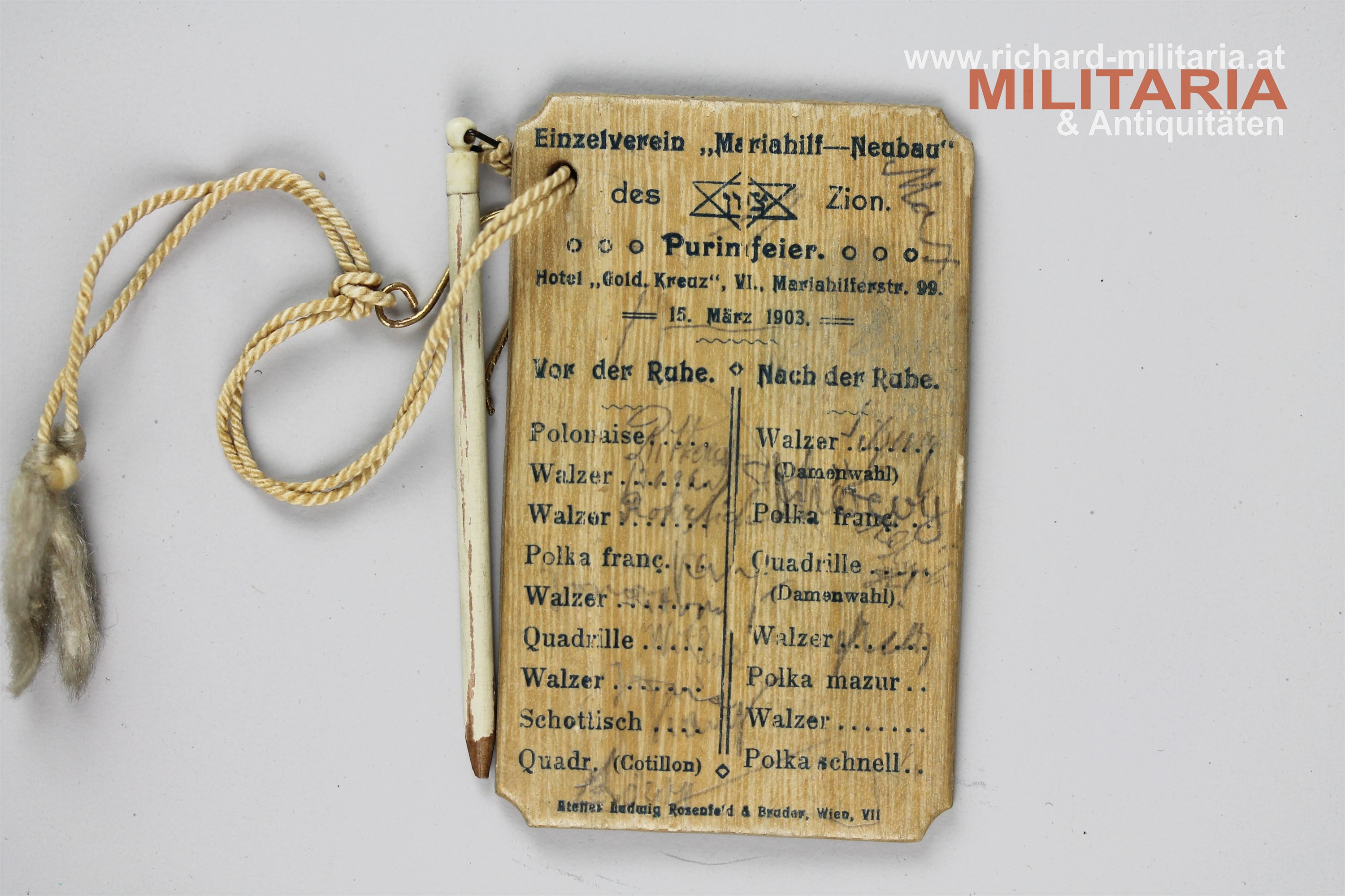 Ballspende des Einzelverein "Mariahilf-Neubau" des ZION zur jüdischen Purimfeier am 15. März 1902; Holztafel farblich bedruckt und bemalt; mit originalem anhängendem Bleistift; auf der Rückseite angeführte Tänze mit eingetragenen Tanzpartnern;