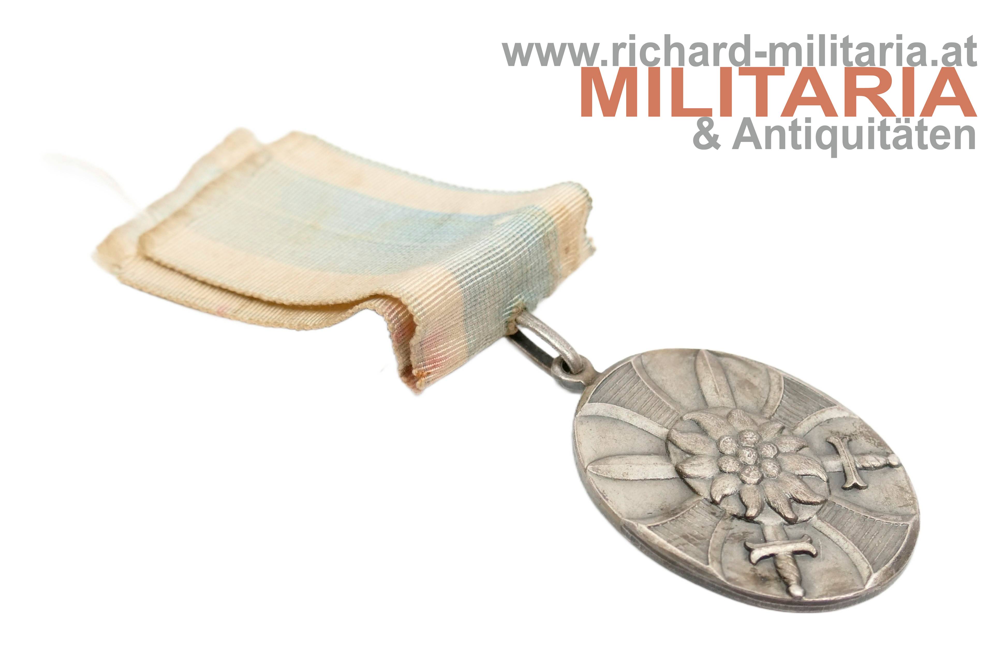 Bayern-Tirol - Medaille königlich bayerisches Infanterieleibregiment 1915; Bronze versilbert; Revers: " DAS K. BAYER. INF. LEIB. REGT. SEINEN WAFFENBRÜDERN IN DER VERTEIDIGUNG IHRES HEIMATLANDES TIROL"; mit weiß blauem langen Bandabschnitt;