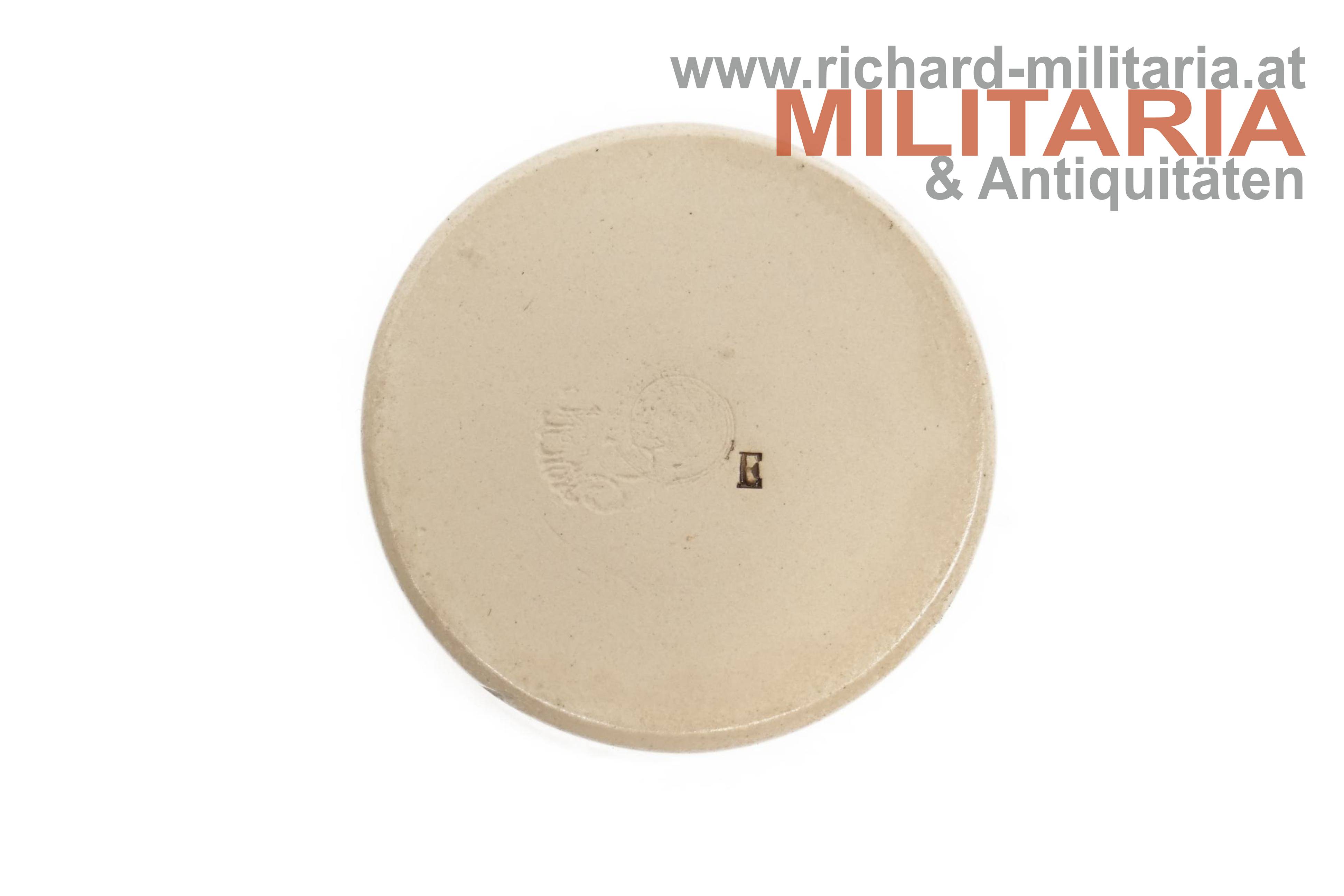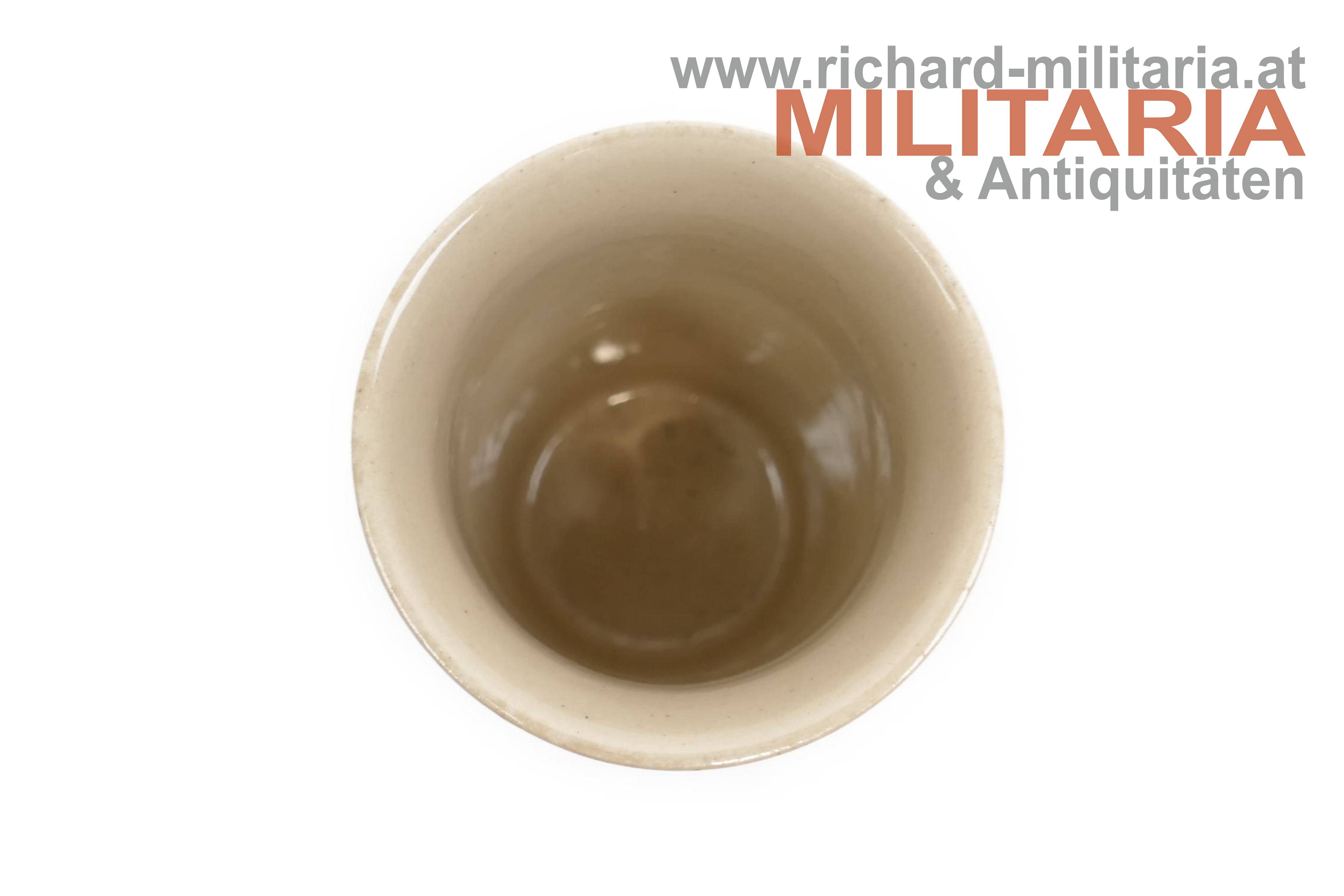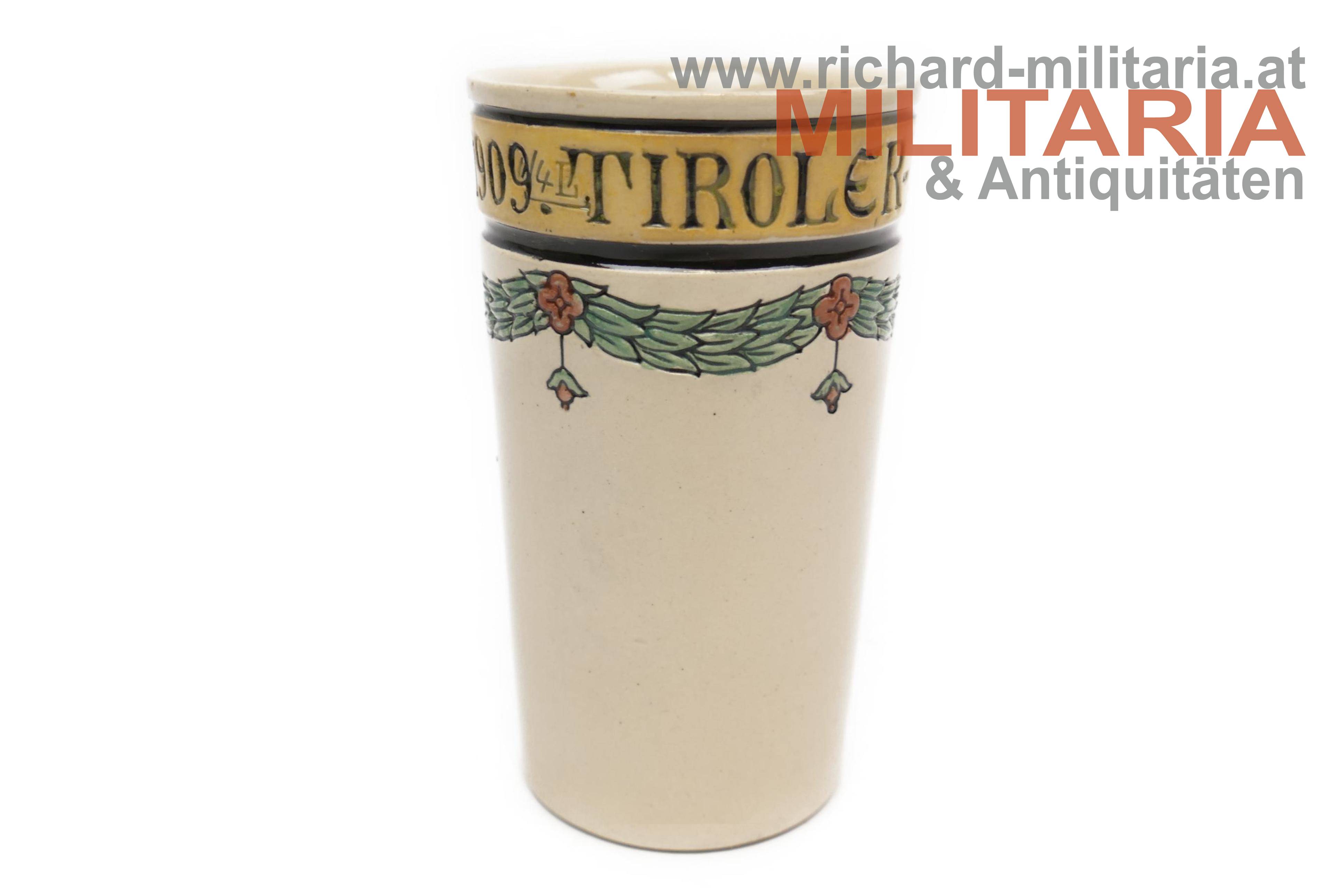 Becher - Tiroler Landesfeier 1809-1909 - Andreas Hofer; Keramik farbig glasiert; gelbes Schriftband "Tiroler-Landesfeier 1809-1909 (1/4L)"; darunter reliefierte, umlaufende florale Verzierung mit einer Abbildung von Andreas Hofer; am Becherboden gestempelt;