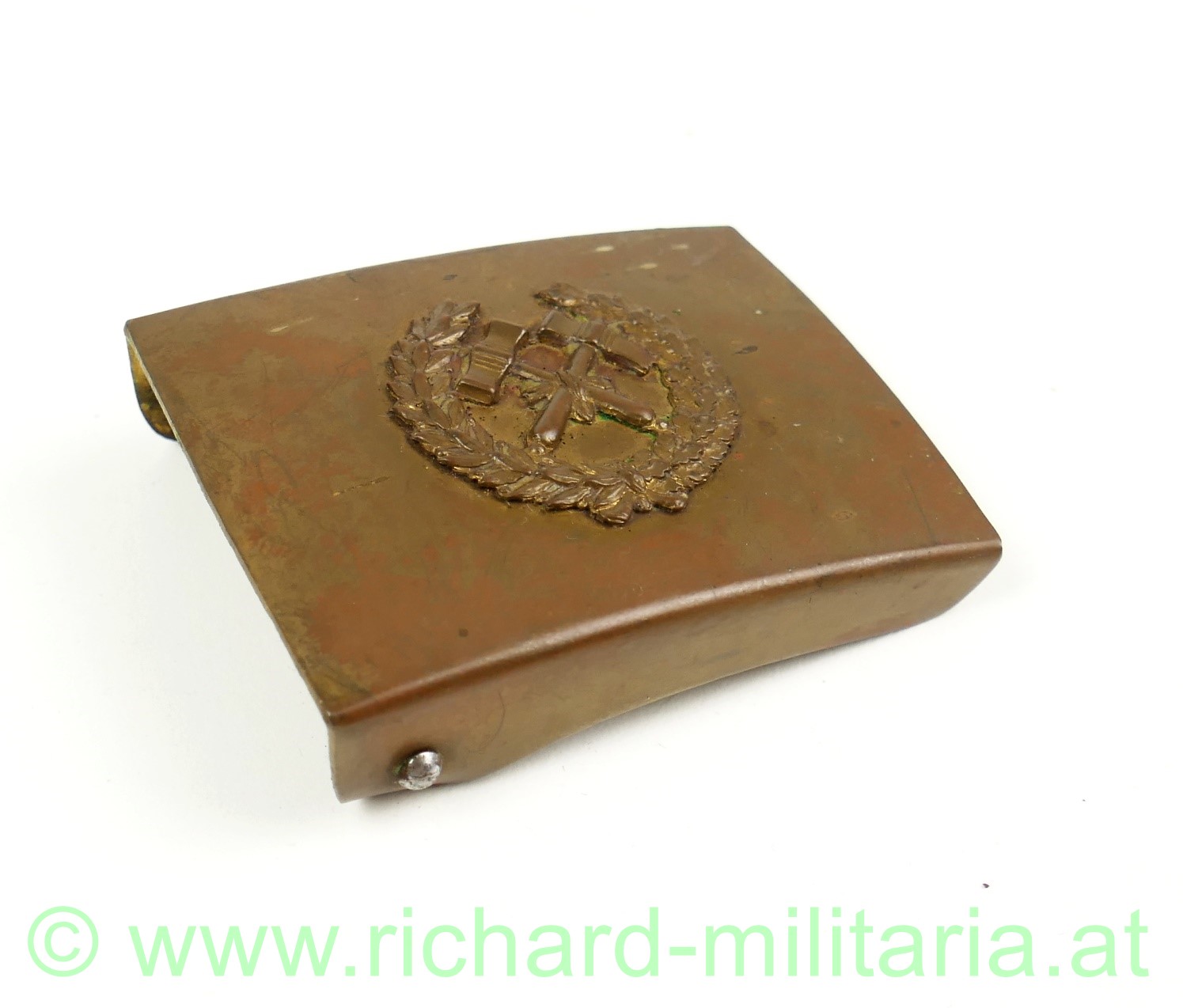 Bergbau - Koppelschloss, Messing mit aufgeklammertem bekränzten Bergbauutensilien (Pike u. Hammer),