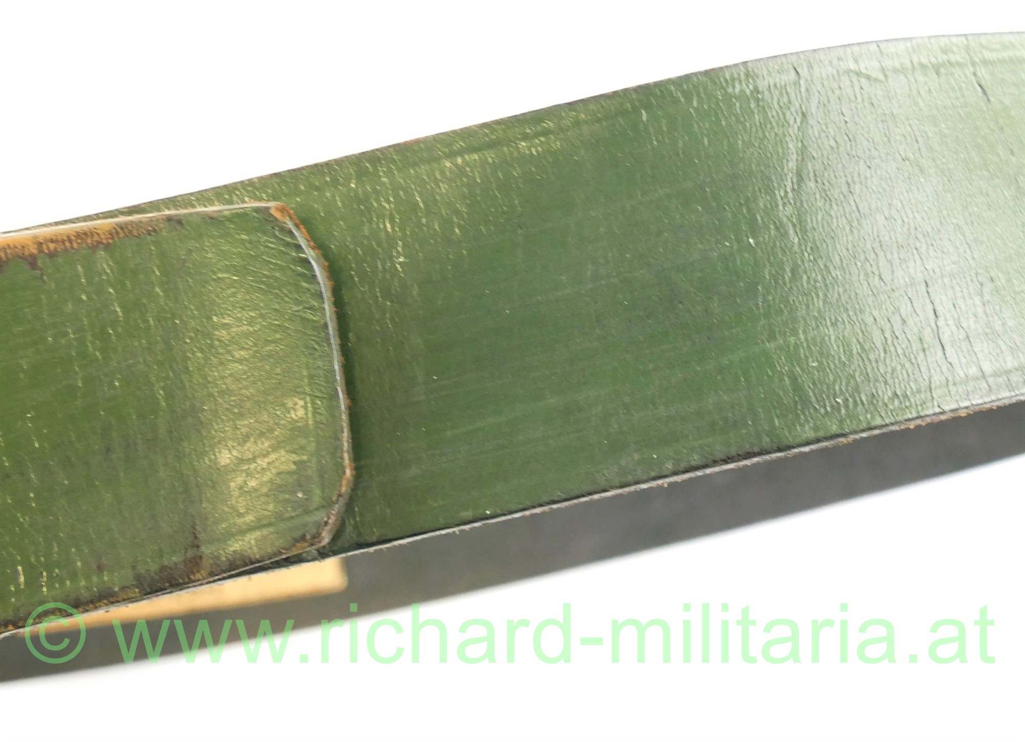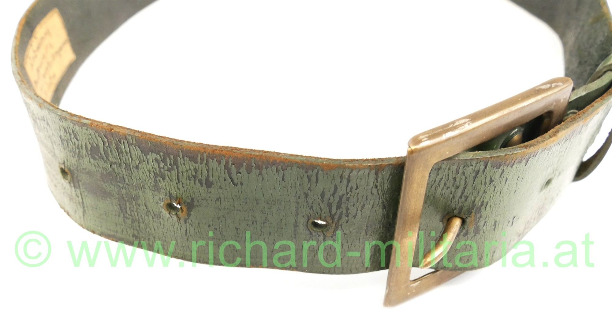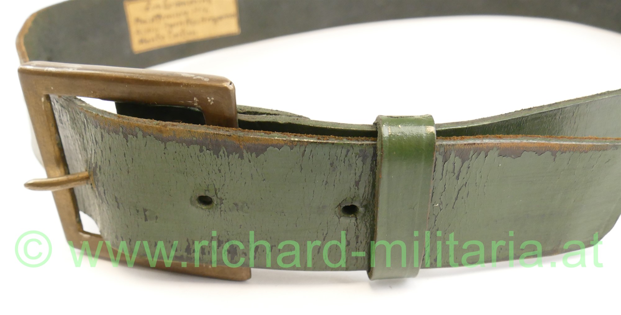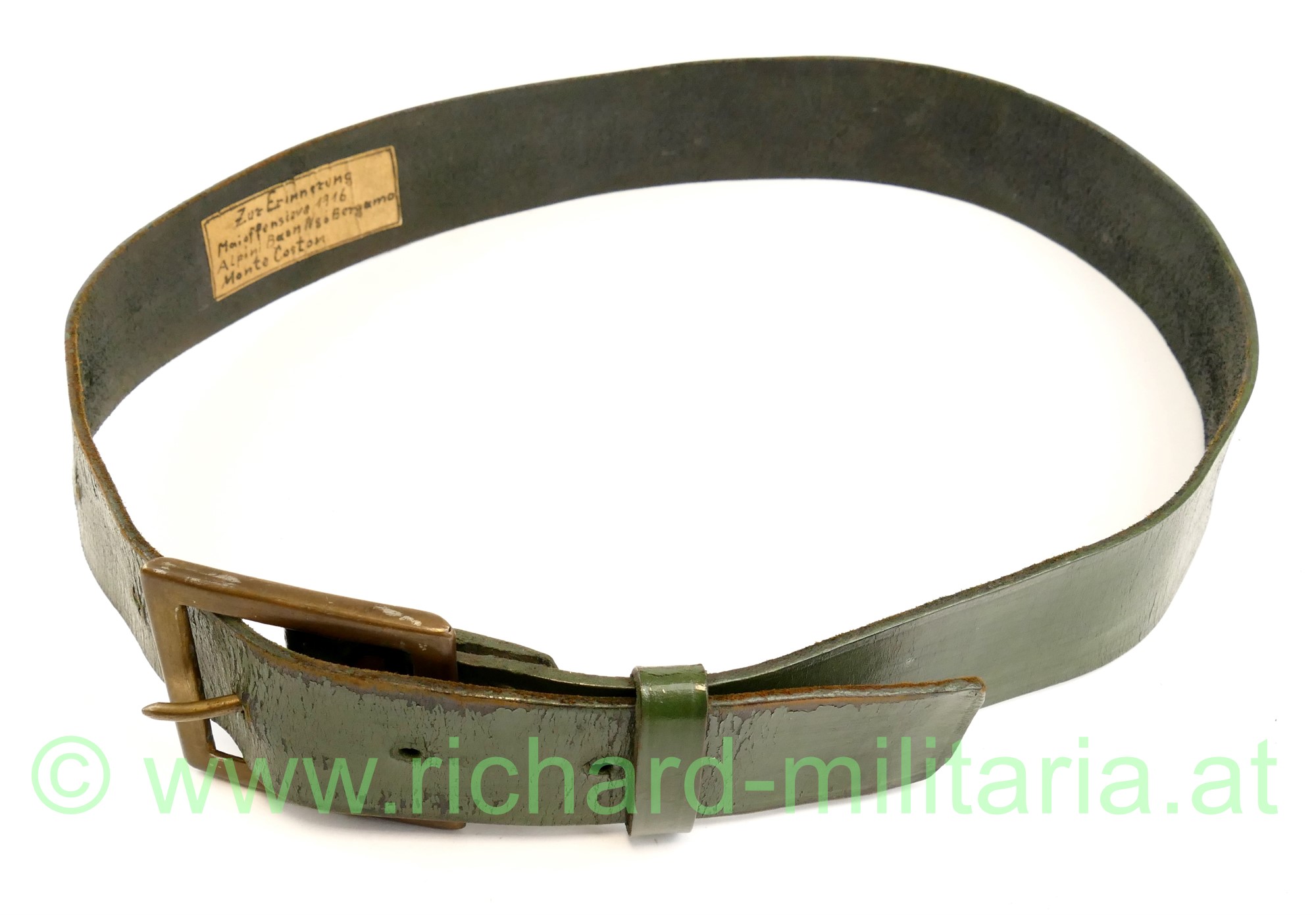 Beutestück - Alpini Gürtel - Maioffensive 1916, grün lackierter Eindorngürtel mit Messingschnalle, auf der Innenseite Klebeetikett: "Zur Erinnerung Maioffensive 1916, Alpini Baon No 6 Bergamo Monte Coston";