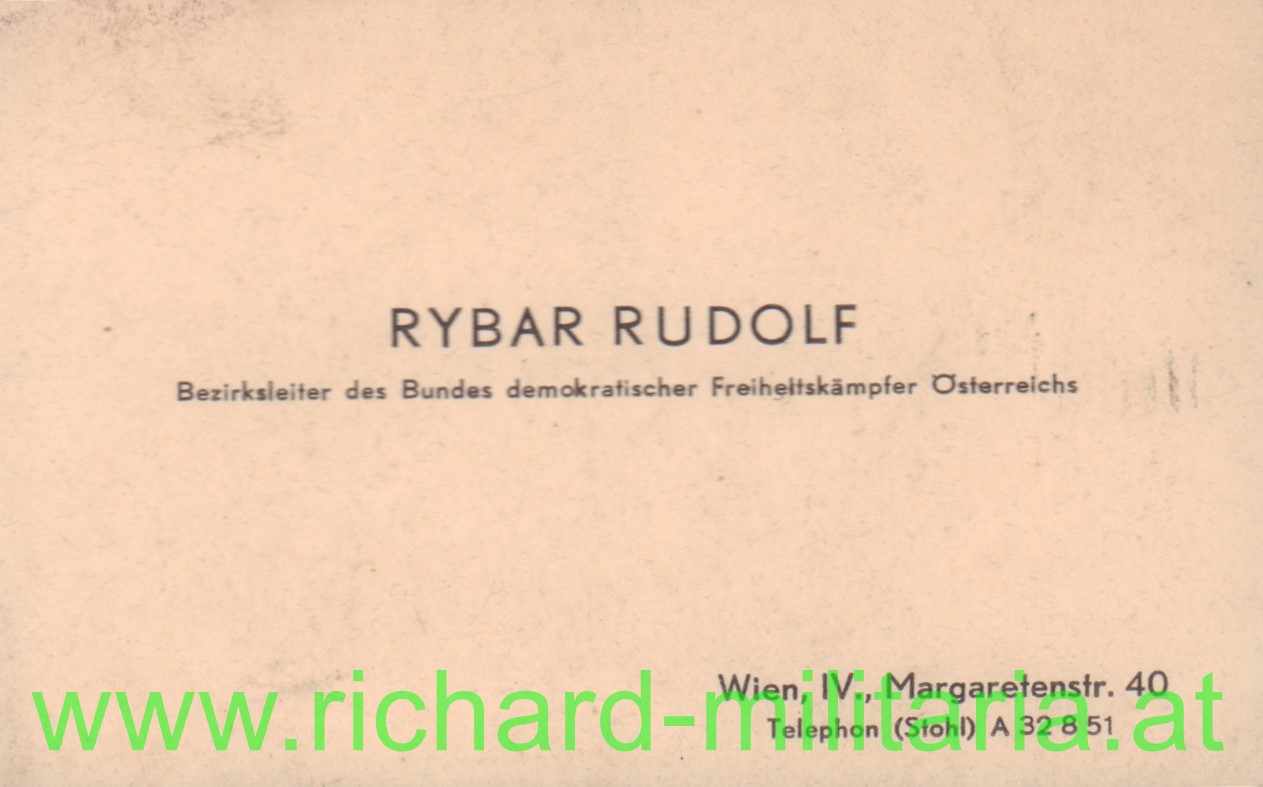 Visitenkarte des Rudolf Rybar - Bezirksleiter des Bundes demokratischer Freiheitskämpfer Österreichs;