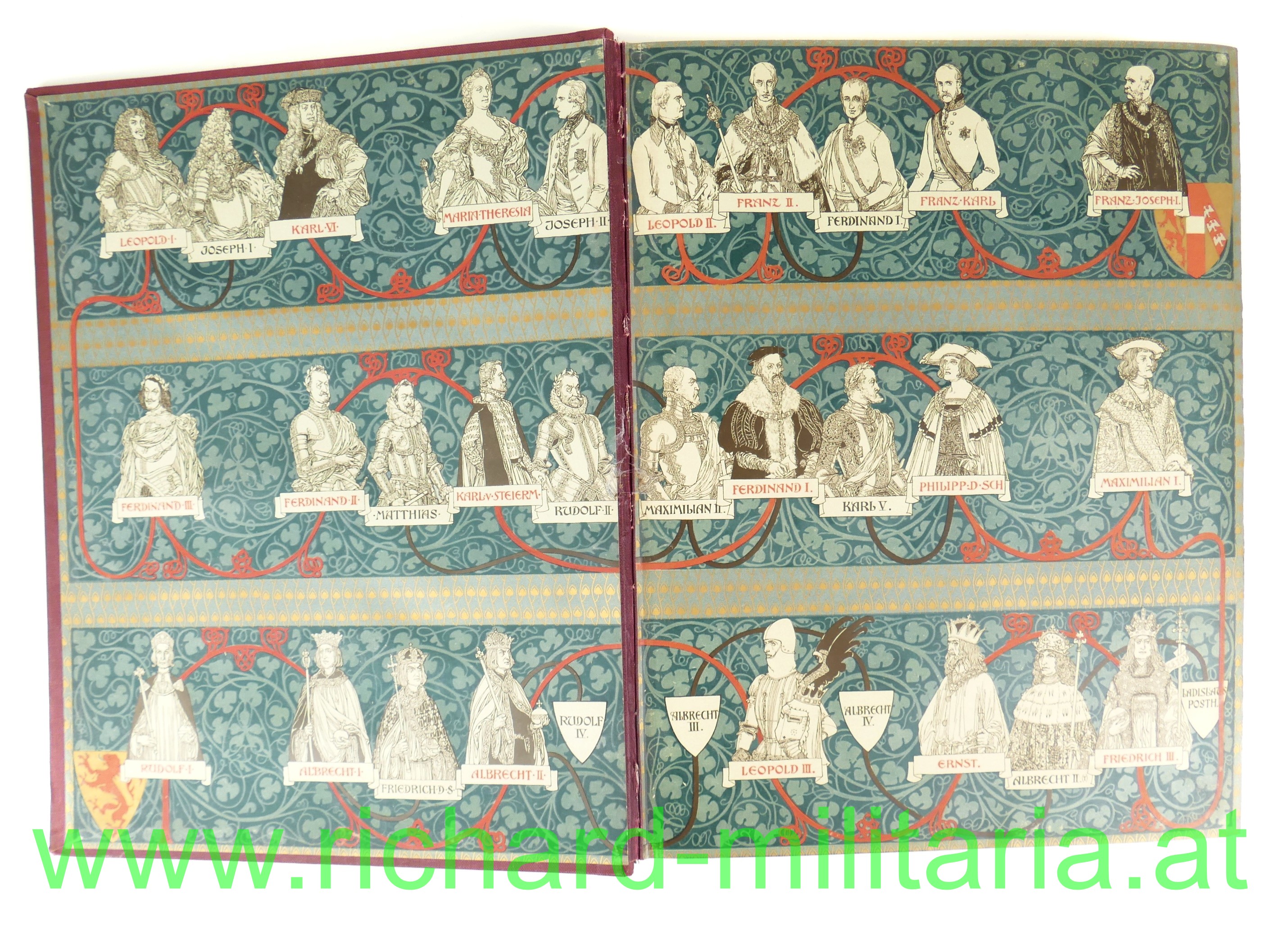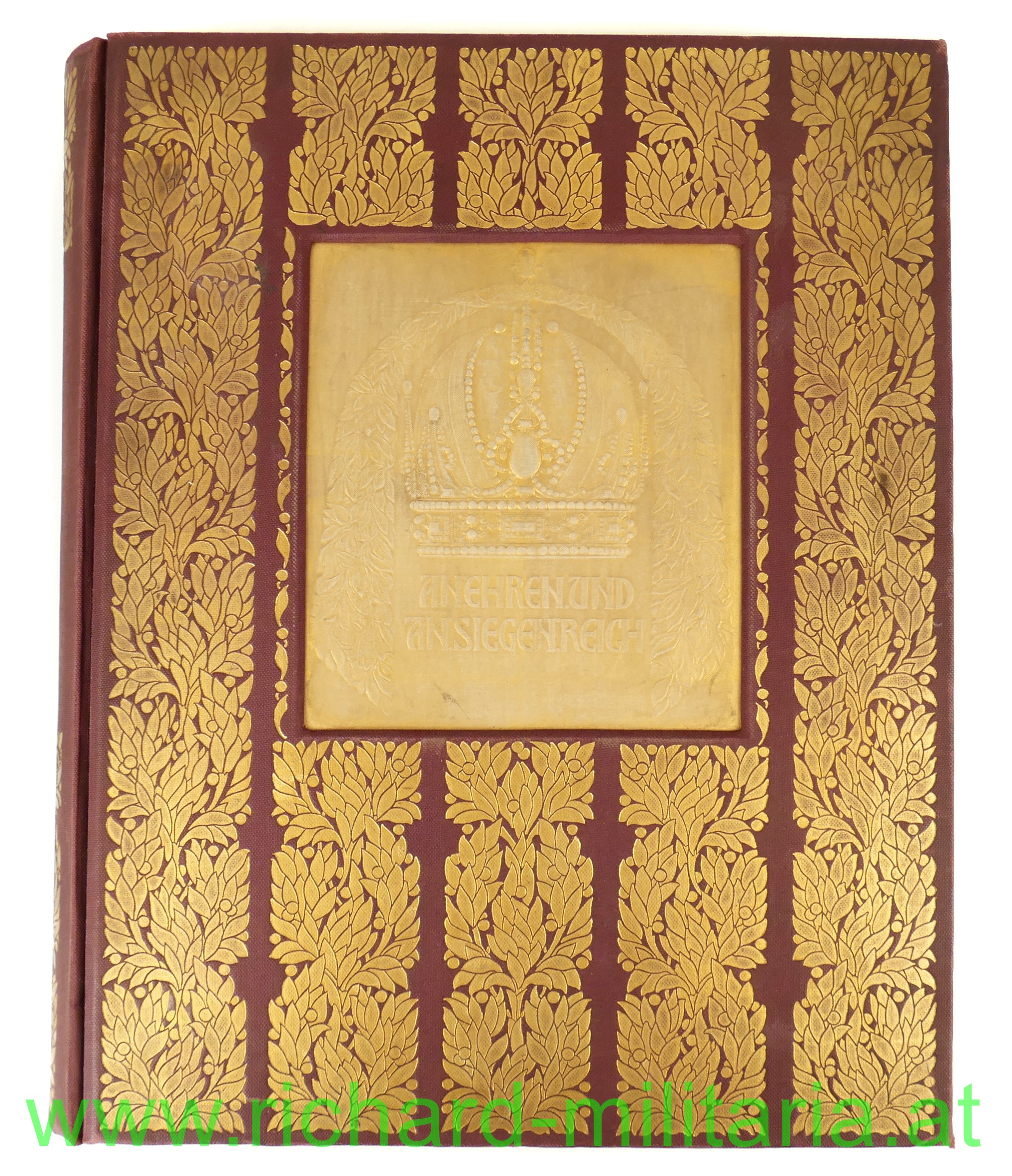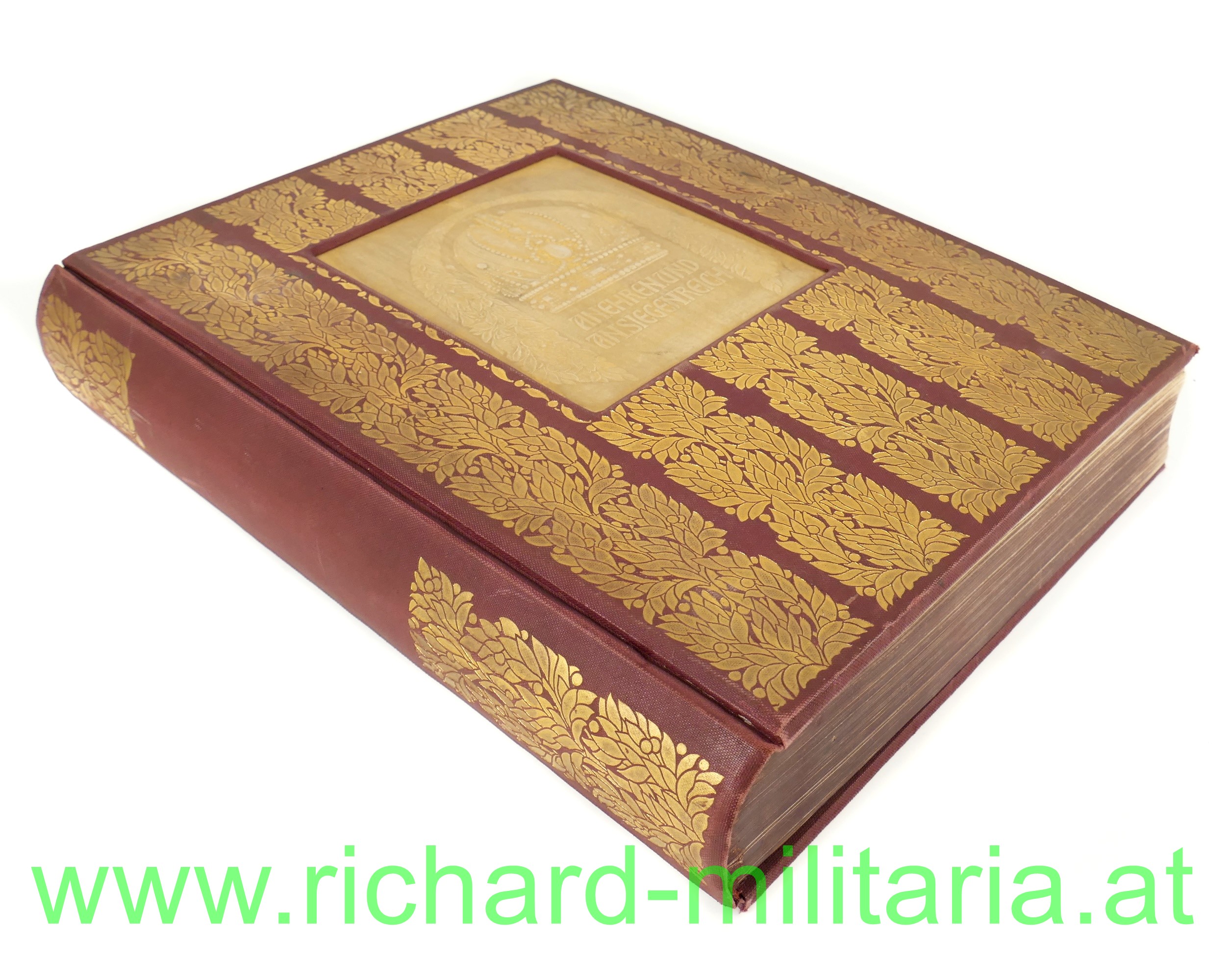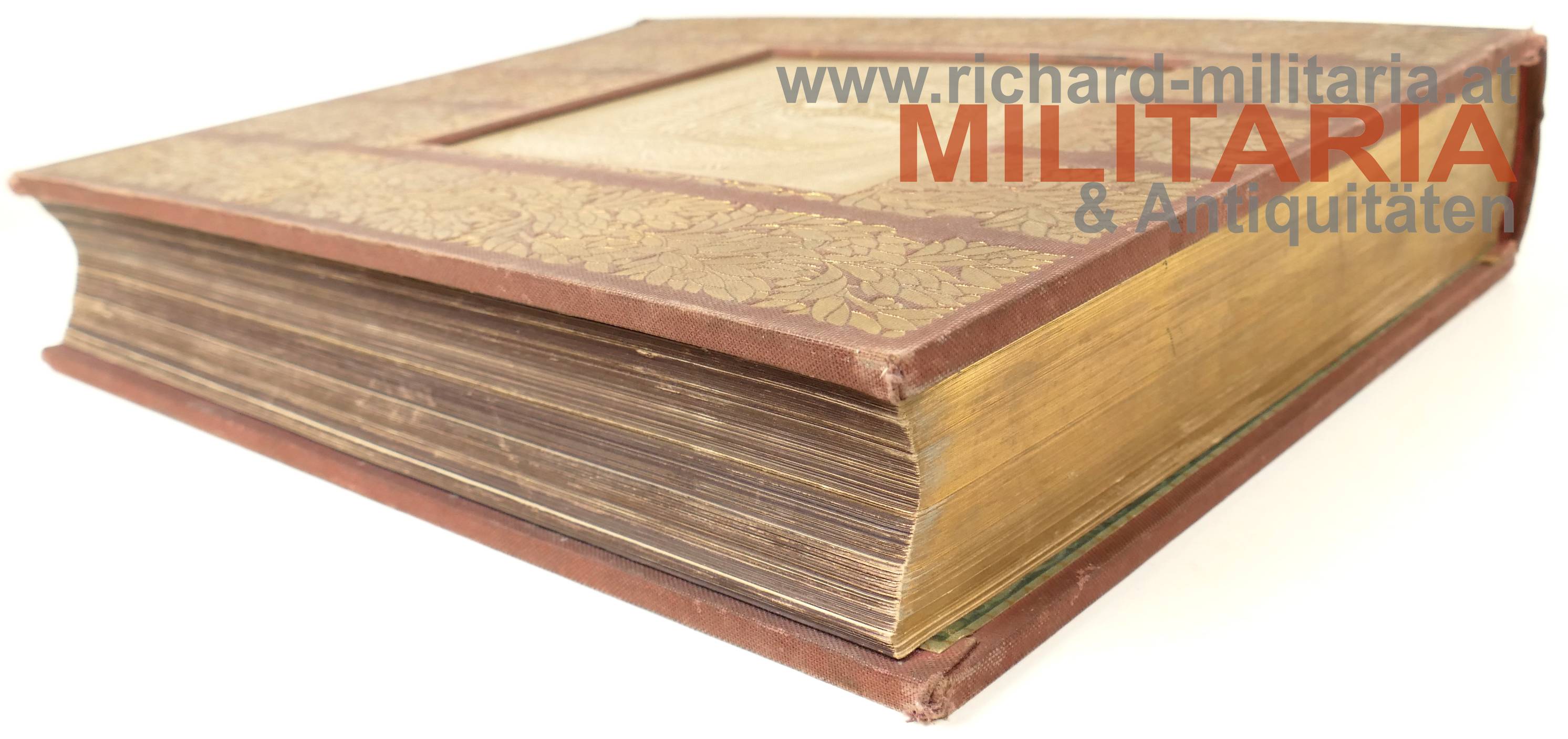 Buch in Prachtausgabe: An Ehren und an Siegen reich - Bilder aus Österreichs Geschichte; unter dem allerhöchsten Protektorate seiner kaiserlichen und königlich apostolischen Majestät, Franz Josef I, zahlreiche Bilder mit Texten und Beschreibungen, sehr schön gestaltet, teilweise mit Golddruck, gebundenes Hardcover in Übergröße, Einband mit blattförmiger Goldprägung und goldgeprägter Krone, vollständig, sehr guter Zustand - Einband leicht verstaubt