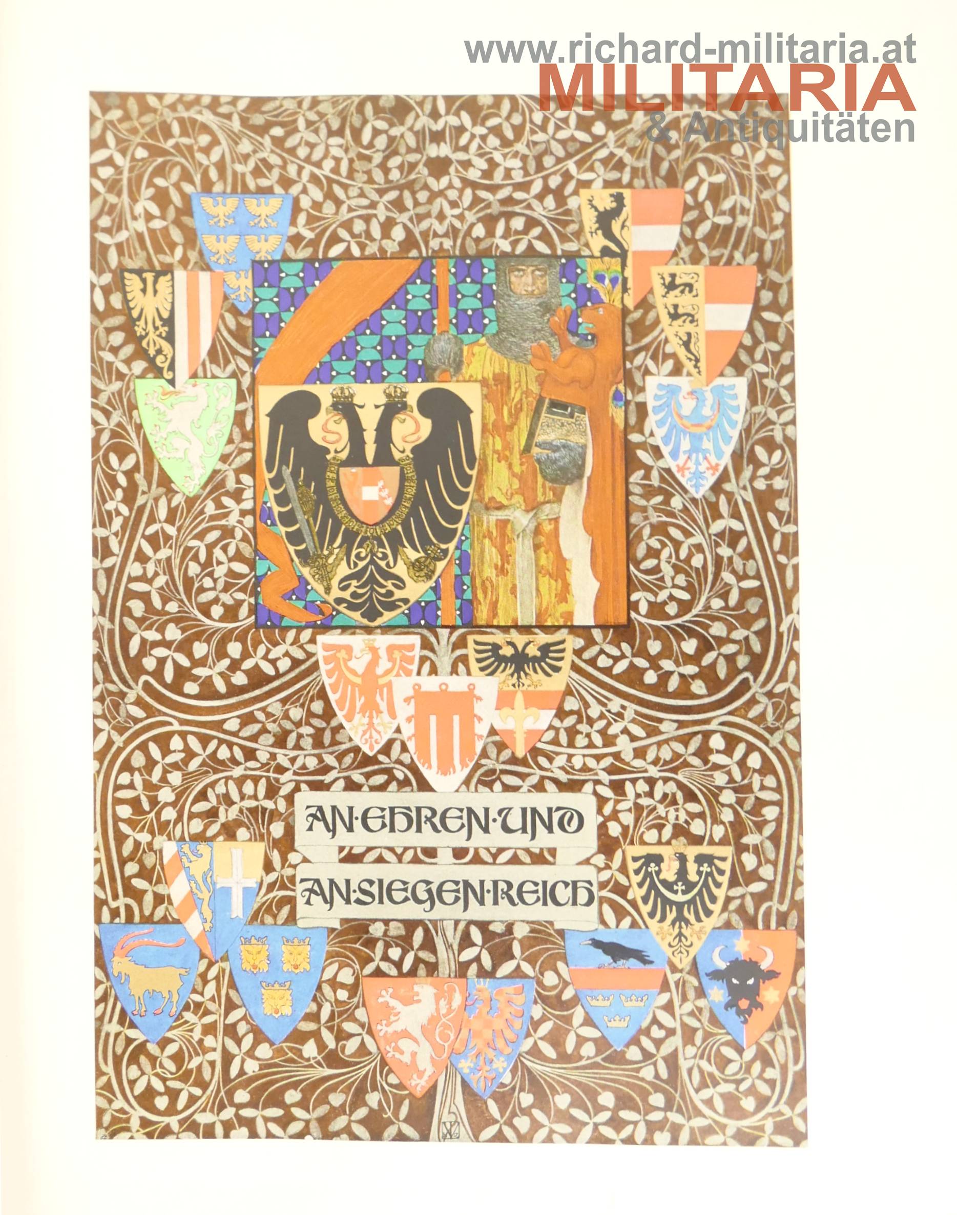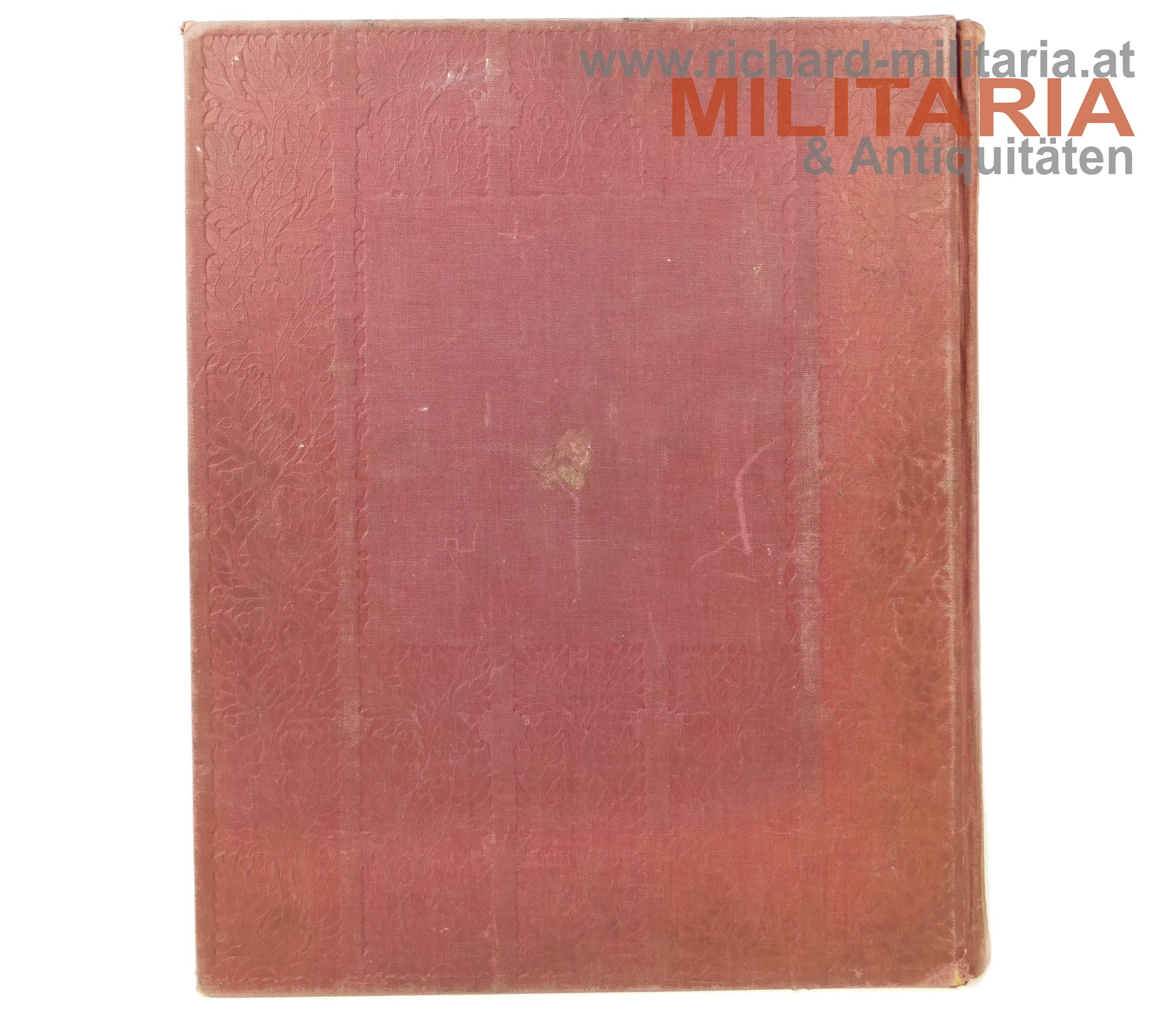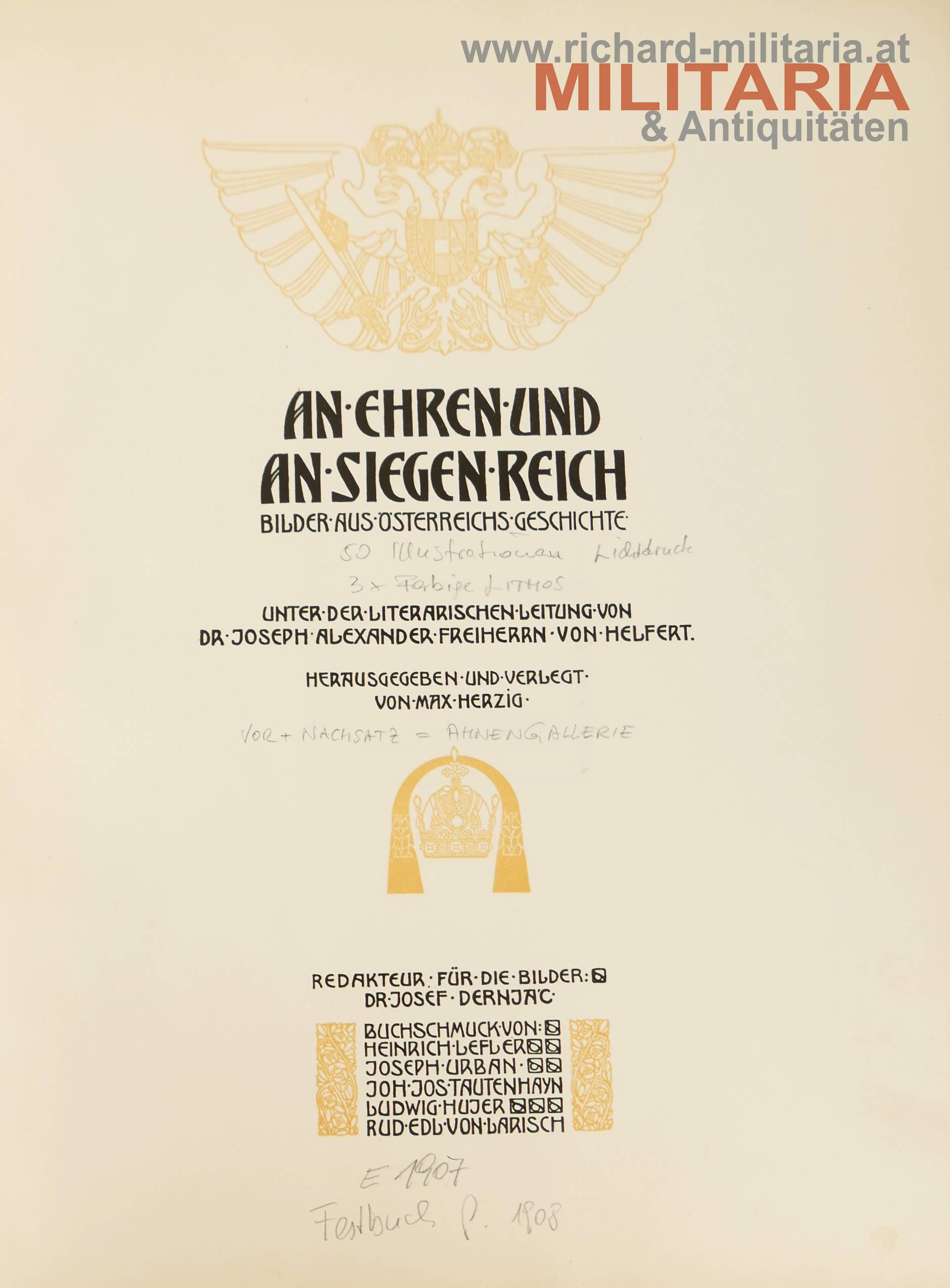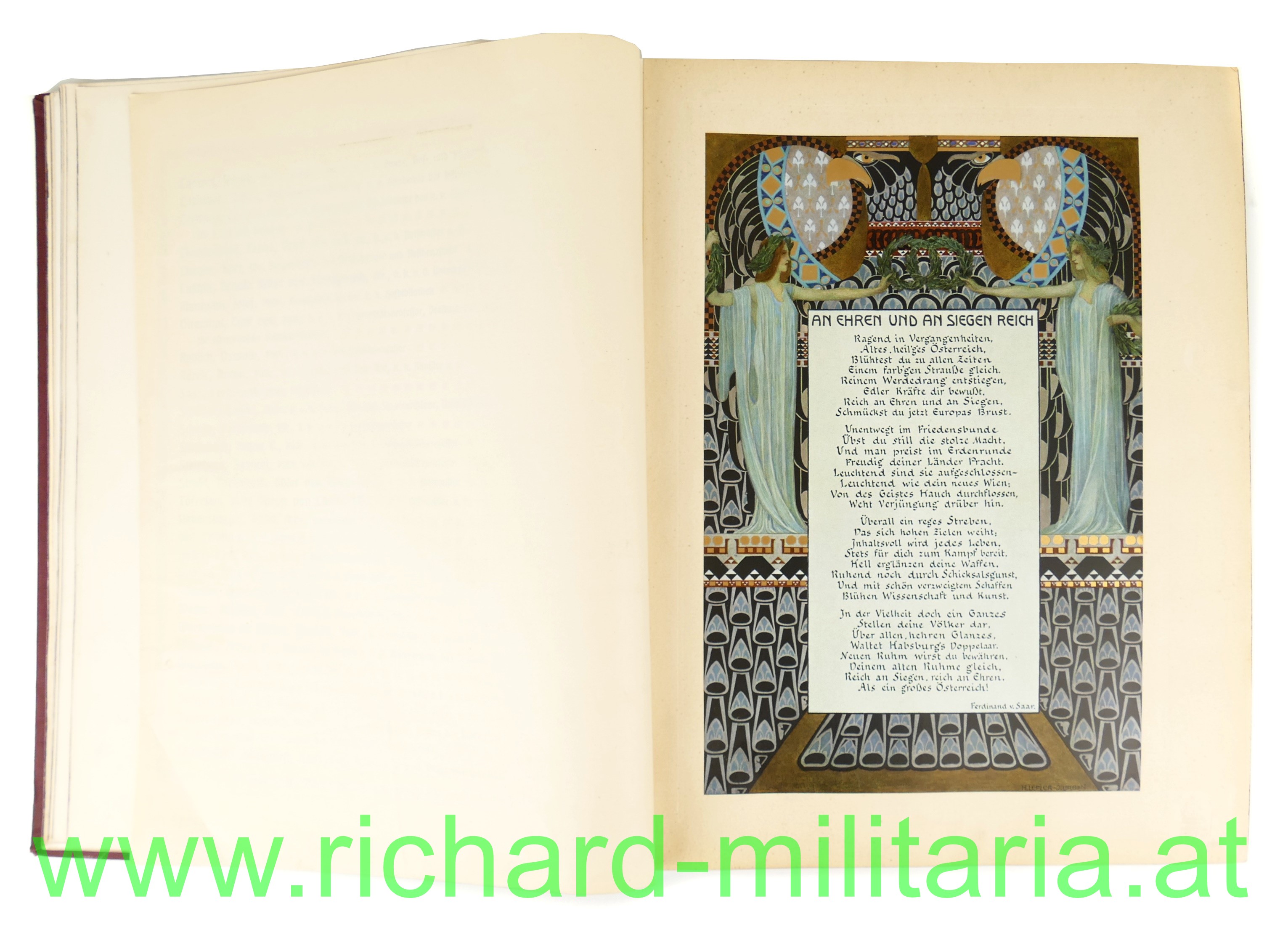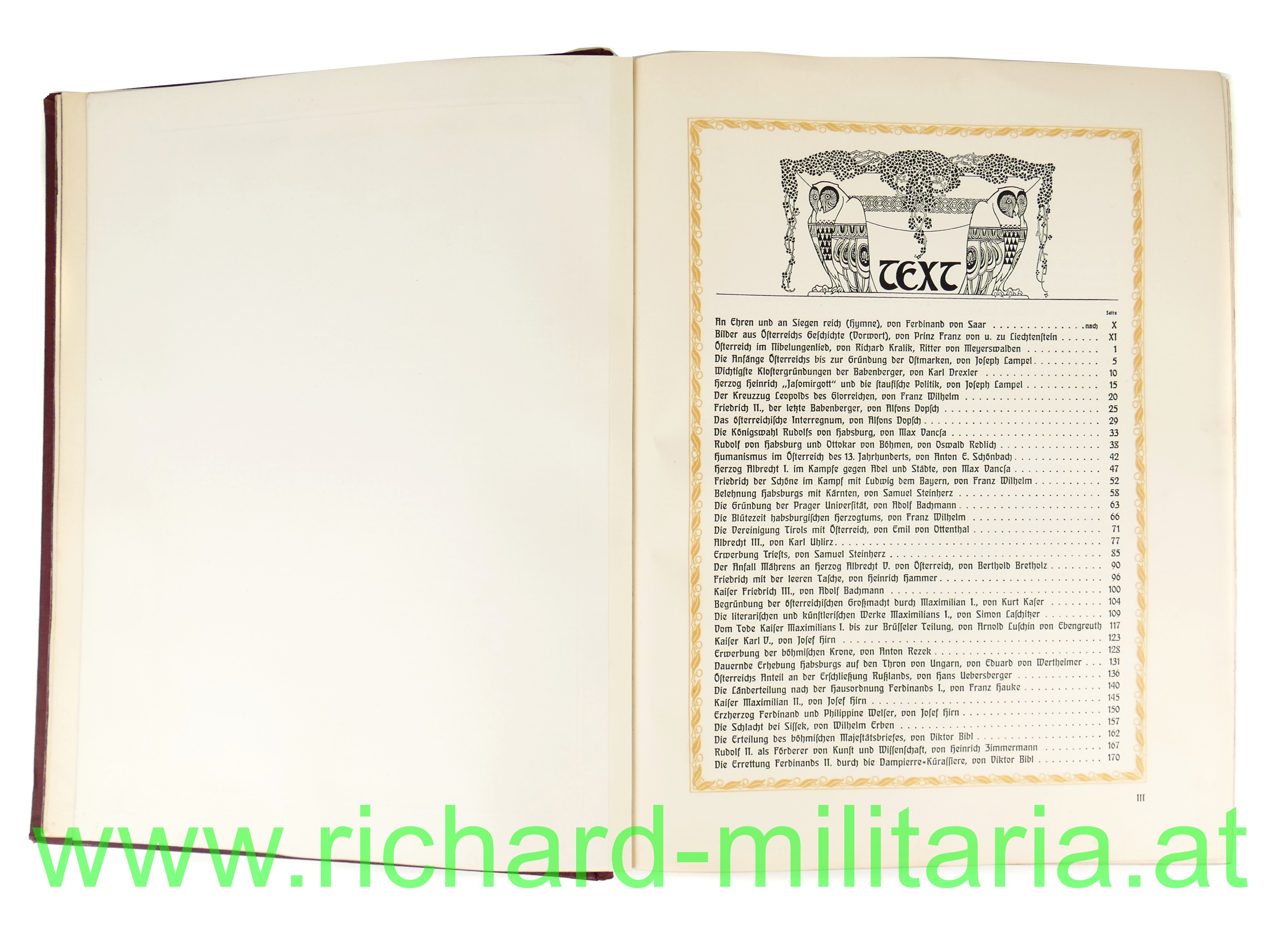 Buch in Prachtausgabe: An Ehren und an Siegen reich - Bilder aus Österreichs Geschichte; unter dem allerhöchsten Protektorate seiner kaiserlichen und königlich apostolischen Majestät, Franz Josef I, zahlreiche Bilder mit Texten und Beschreibungen, sehr schön gestaltet, teilweise mit Golddruck, gebundenes Hardcover in Übergröße, Einband mit blattförmiger Goldprägung und goldgeprägter Krone, vollständig, sehr guter Zustand - Einband leicht verstaubt