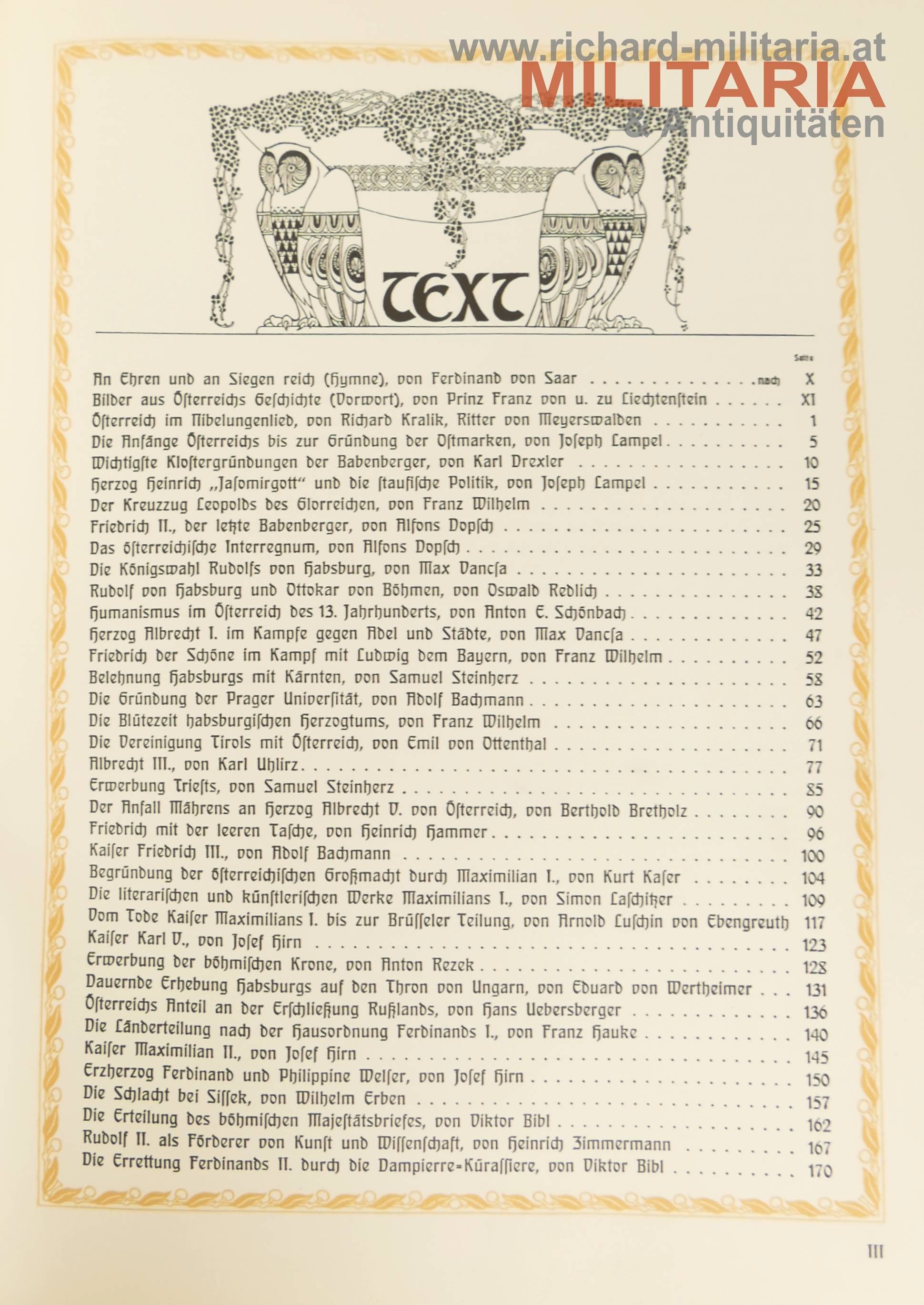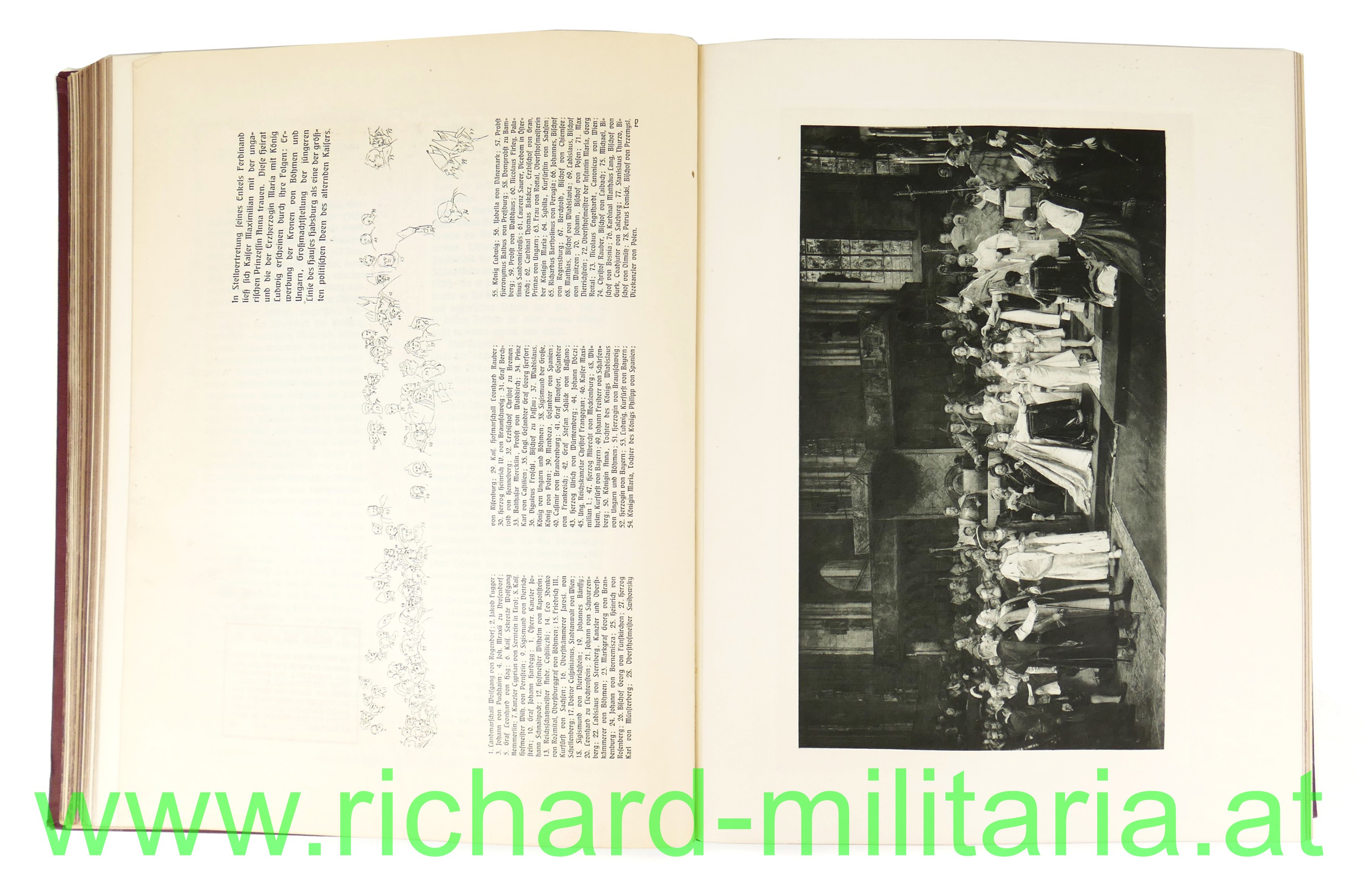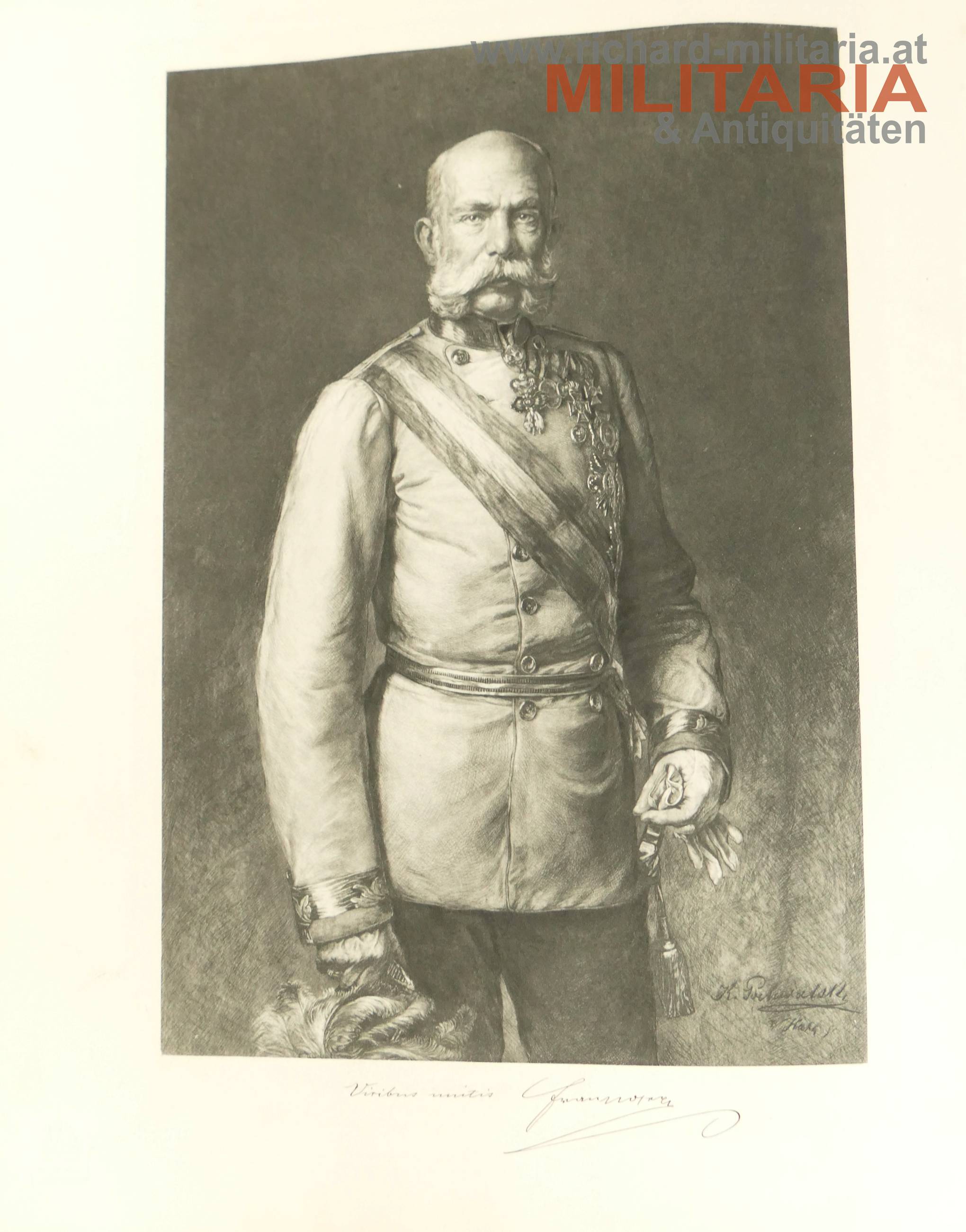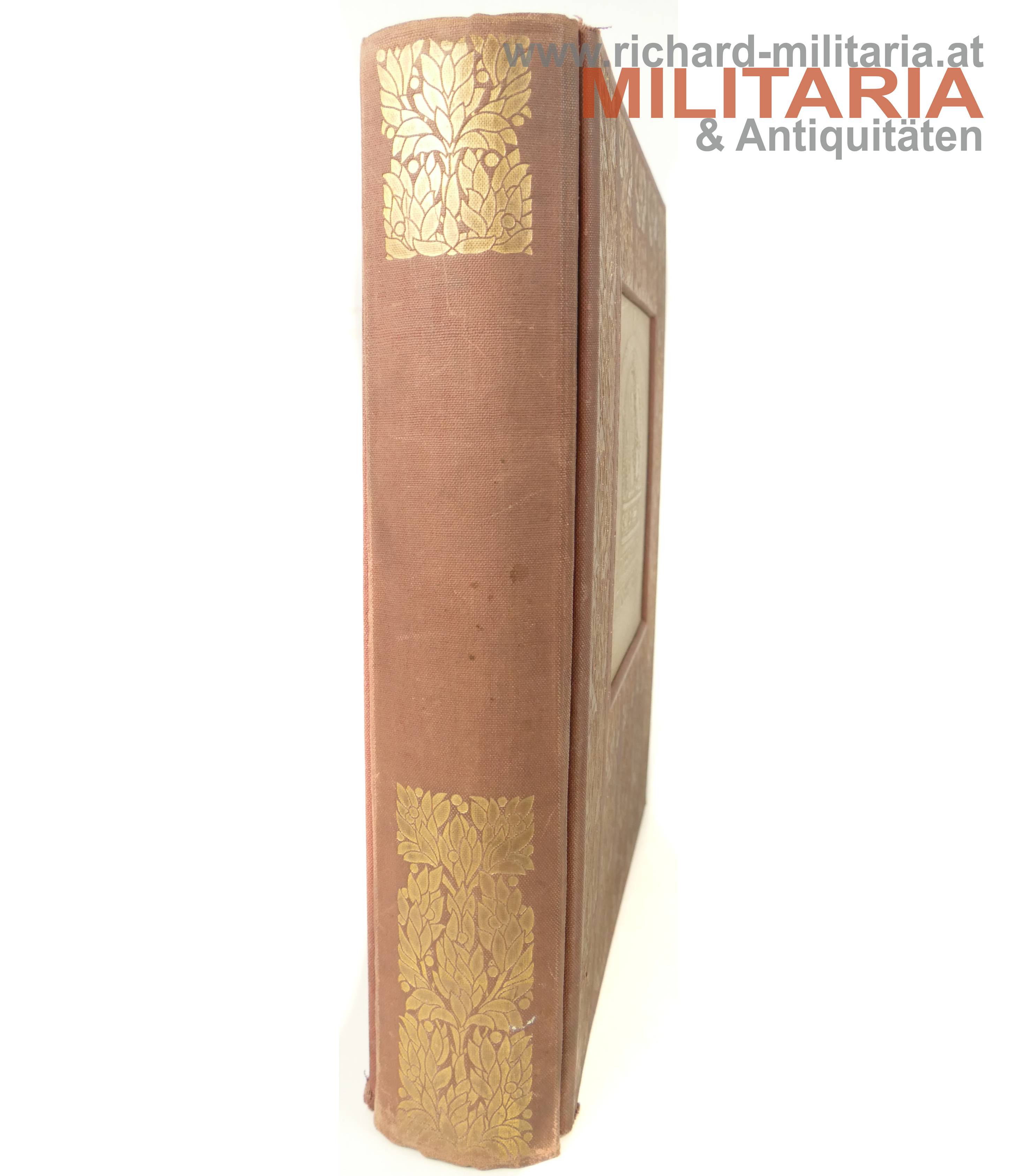 Buch in Prachtausgabe: An Ehren und an Siegen reich - Bilder aus Österreichs Geschichte; unter dem allerhöchsten Protektorate seiner kaiserlichen und königlich apostolischen Majestät, Franz Josef I, zahlreiche Bilder mit Texten und Beschreibungen, sehr schön gestaltet, teilweise mit Golddruck, gebundenes Hardcover in Übergröße, Einband mit blattförmiger Goldprägung und goldgeprägter Krone, vollständig, sehr guter Zustand - Einband leicht verstaubt