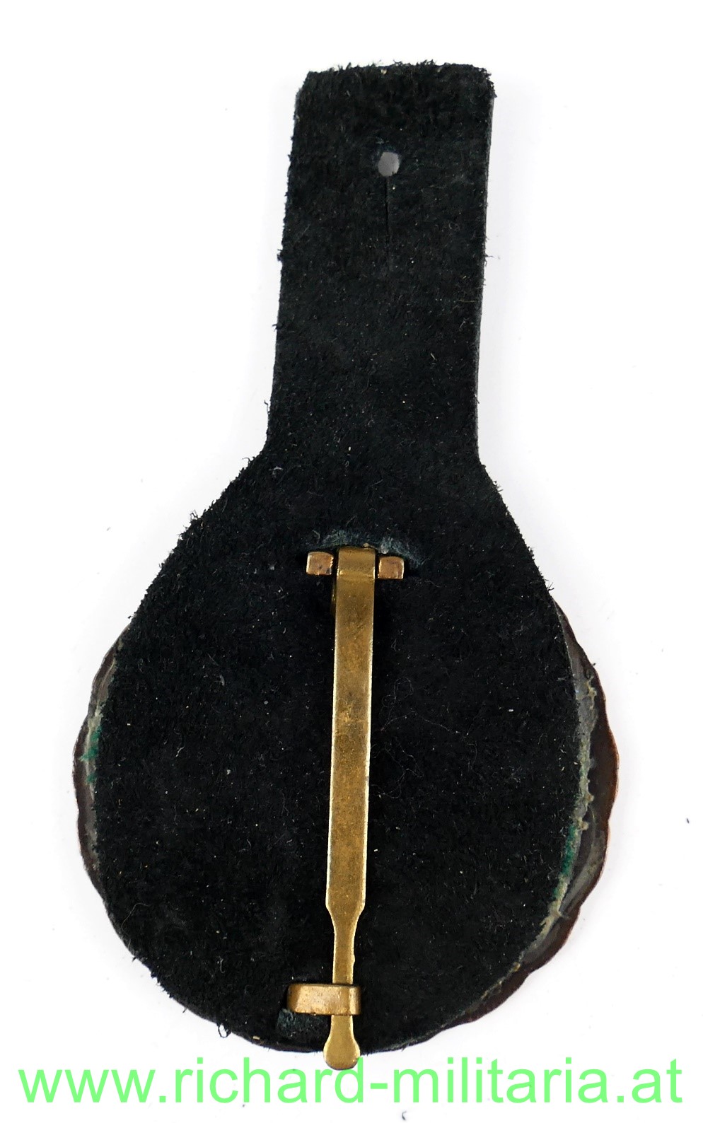 Bewährungsabzeichen Kraftfahrer in Bronze 1959, Bronze, mit originalem Nadelsystem und mit schwarzer Ledertragelasche, Abzeichen wurde vom Träger noch zusätzlich mit grünem Stoff hinterlegt (Waffenfarbe ?);