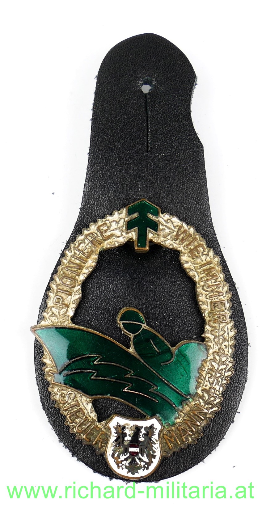 Bewährungsabzeichen Steuermann des österreichischen Bundesheeres mit der Pioniertanne, dem Leitspruch „Pioniere wie immer“ und dem Bundeswappen, mit Ledertragelasche - Gegenhaken vom Haltesystem abgebrochen;