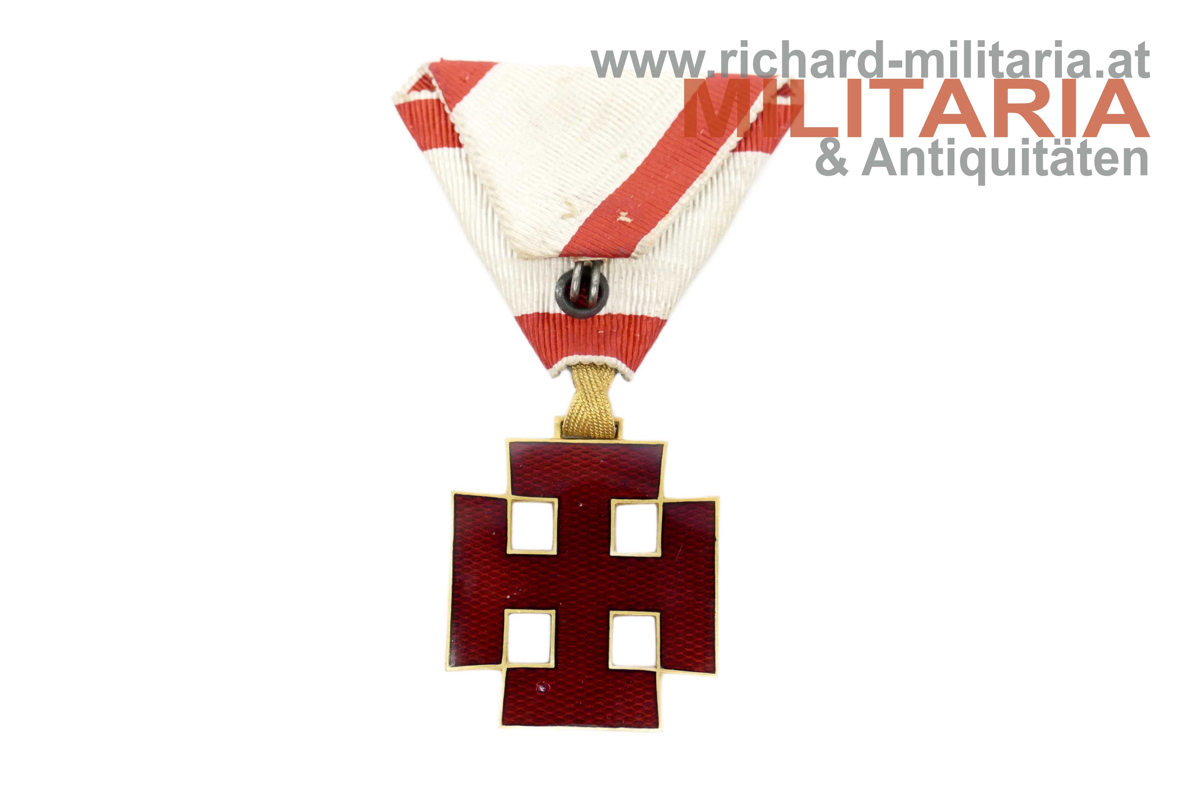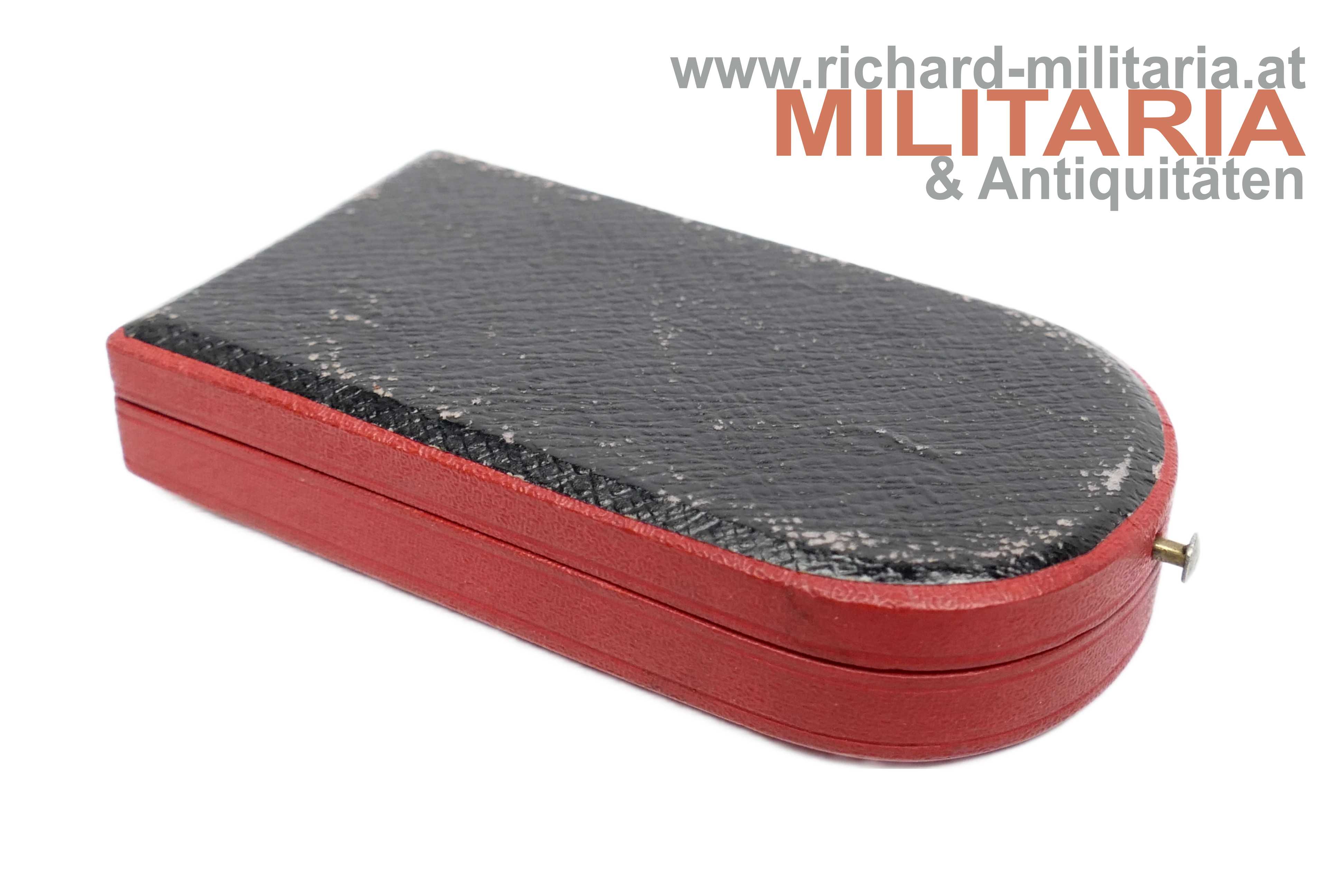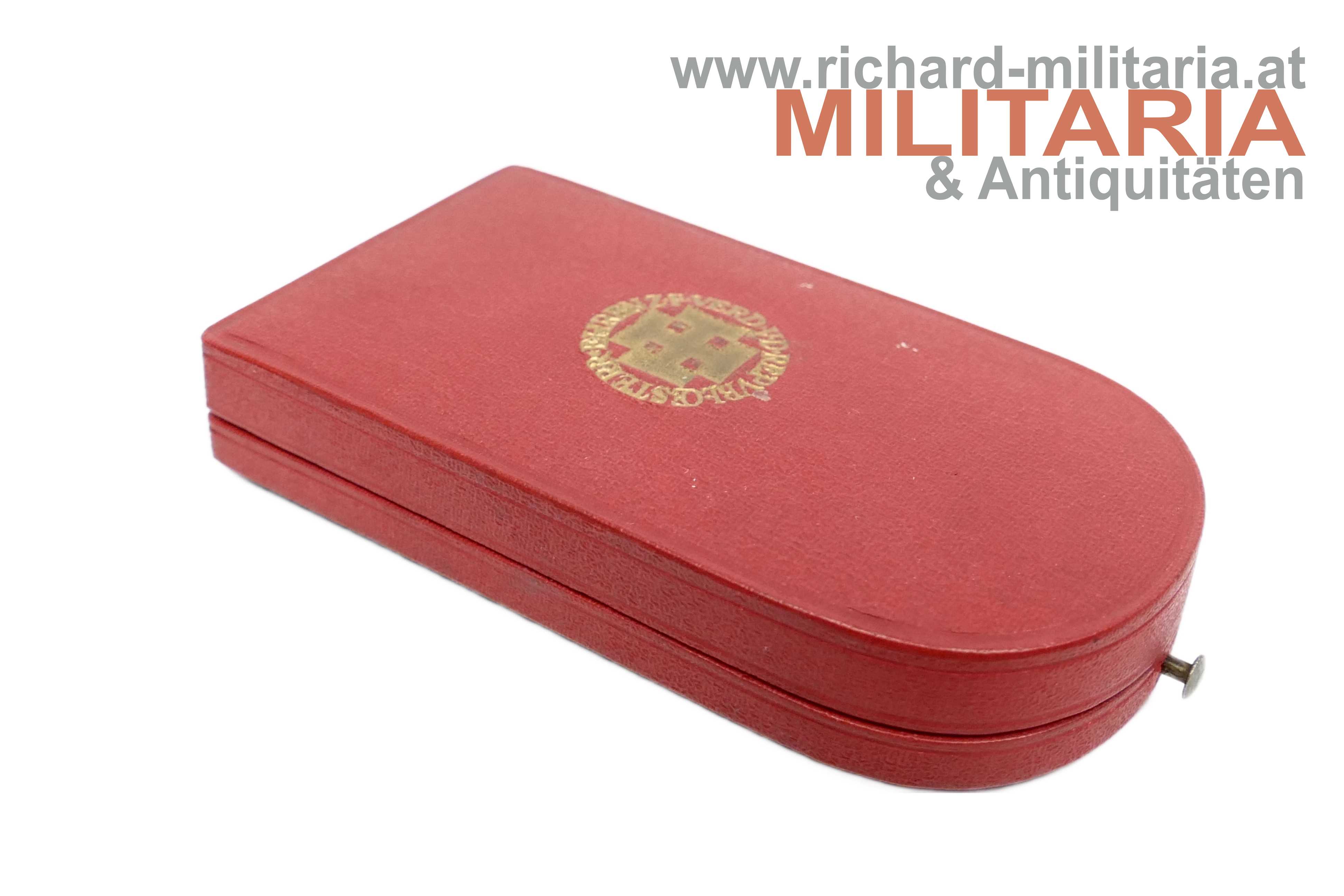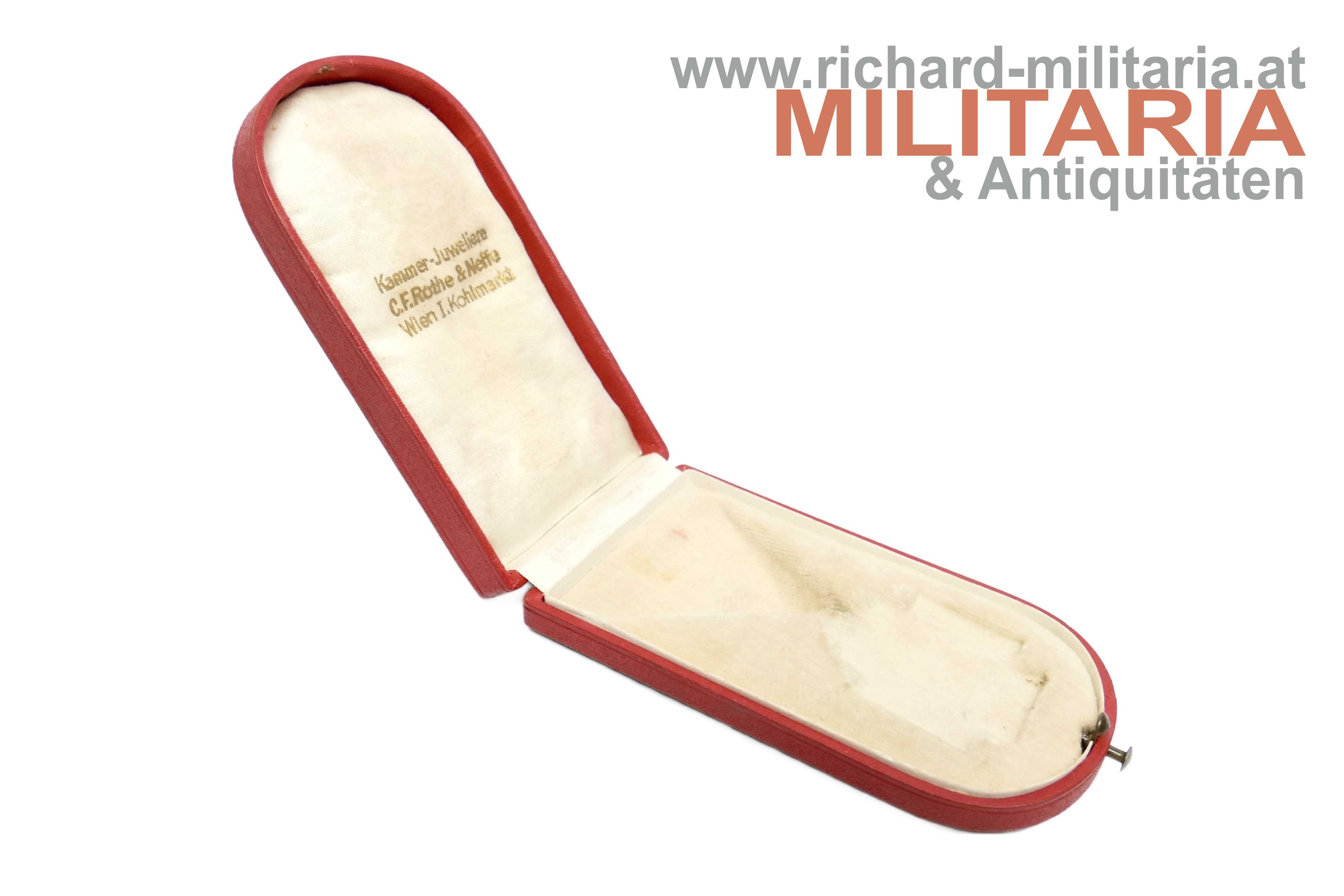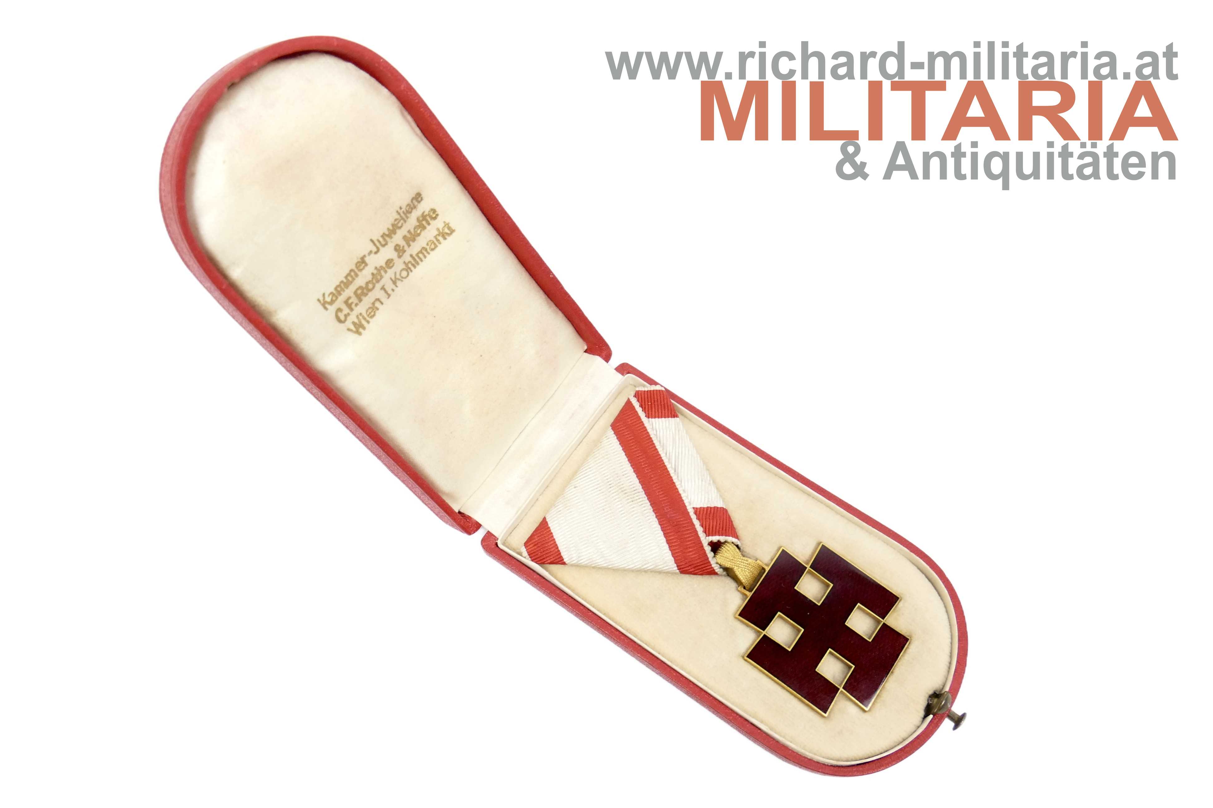 Österreich Bundesstaat - Ehrenzeichen für Verdienste um die Republik - Ritterkreuz 1. Klasse im Etui; Buntmetall vergoldet und rot emailliert; am originalen Band, 2 minimale kleine Chips - kaum sichtbar; im originalen Etui mit Hersteller "Kammer-Juweliere C.F. Rothe & Neffe Wien" im Deckel; am Deckel goldener Aufdruck